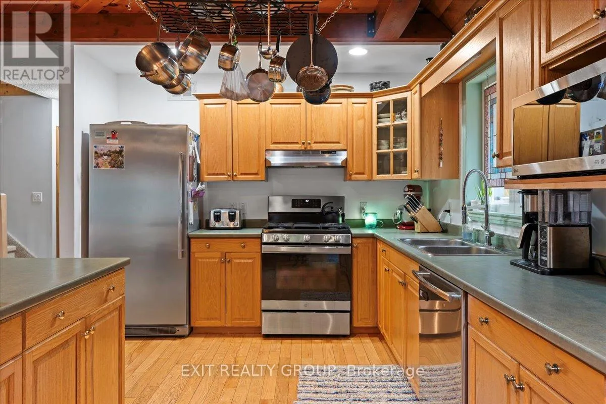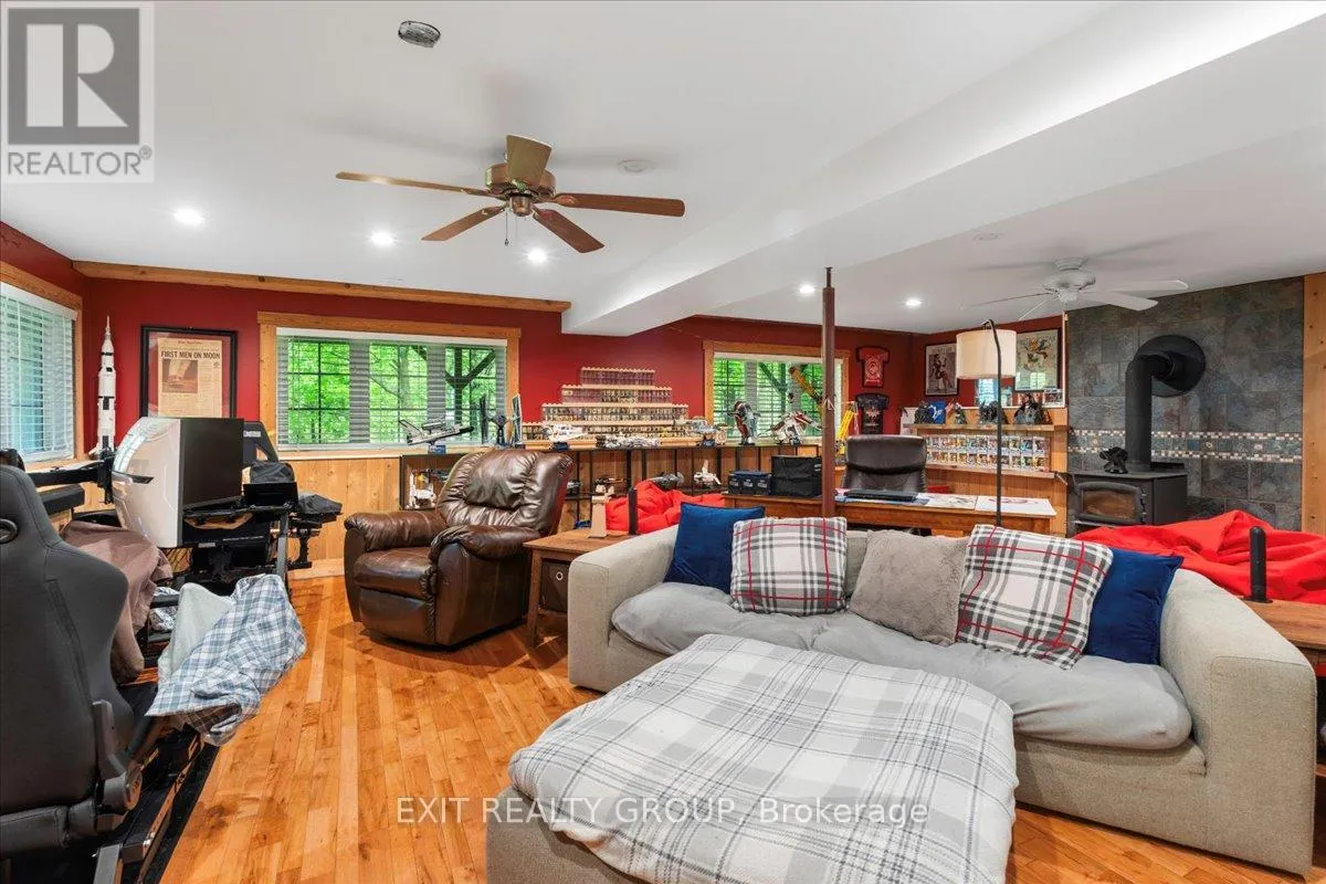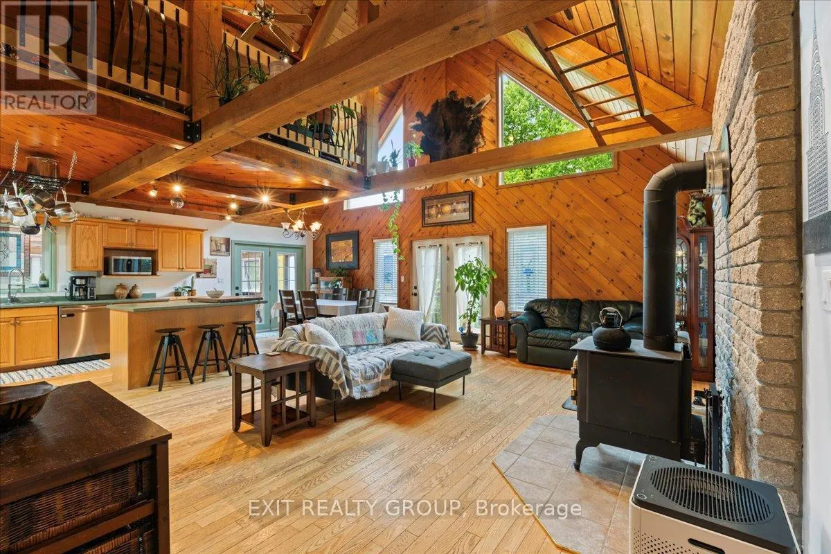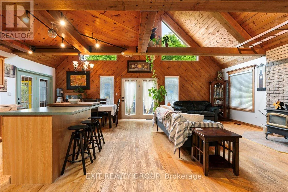 Cross Streets: Hwy 14 & Smith Rd. ** Directions: From Shannonville Road, Turn East on Moneymore Road, Turn East on Smith Road, Property on Right. Welcome to this charming 3-bedroom, 3-bathroom two-storey home, complete with an attached 1.5-car garage and nestled in a picturesque setting with lush gardens and a peaceful pond. Step inside through the welcoming foyer and discover a bright, open-concept main floor that seamlessly blends the living, dining, and kitchen areas. Soaring vaulted ceilings and expansive windows flood the space with natural light, creating a warm and inviting atmosphere. Unwind beside the cozy wood-burning fireplace, perfect for chilly evenings. From the dining area, glass doors lead to a spacious deck - ideal for outdoor entertaining - while a second set of glass doors opens into a delightful 3-season sunroom where you can enjoy the surrounding views in comfort. The generously sized L-shaped kitchen boasts a functional eat-in island, perfect for casual meals and gatherings. This level also features two comfortable bedrooms, a well-appointed 4-piece bathroom, and the convenience of main floor laundry. Upstairs, retreat to your private primary suite, featuring a large closet, a 3-piece ensuite with a luxurious jetted tub, and an open-to-below loft-style office - perfect for working from home or enjoying a quiet reading nook. The finished lower level offers even more living space, including a spacious rec room with a second wood-burning fireplace, a 2-piece powder room, a large storage area, and a utility room with direct access to the garage. Outdoors, enjoy the tranquility of a beautifully landscaped yard with mature gardens, a large storage shed, and your very own pond - adding a touch of natures serenity right in your backyard. This well-maintained home offers space, comfort, and charm both inside and out - don't miss the opportunity to make it yours! (id:27476)
