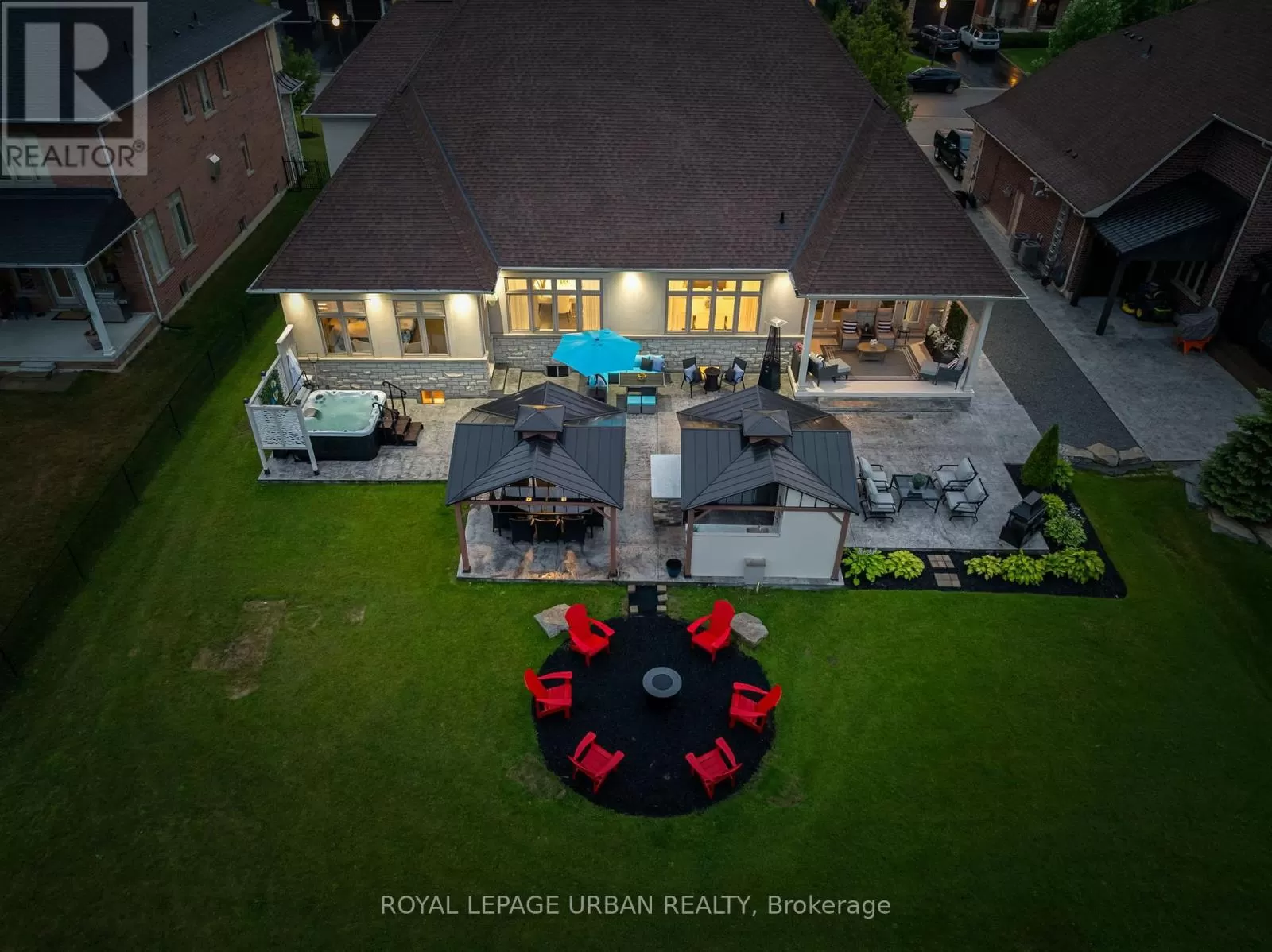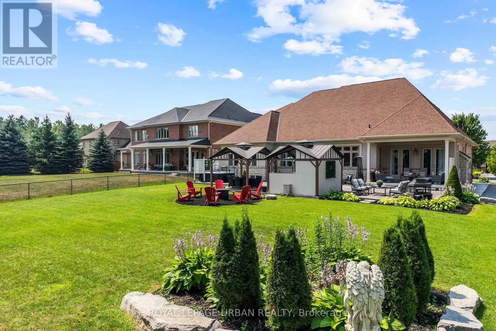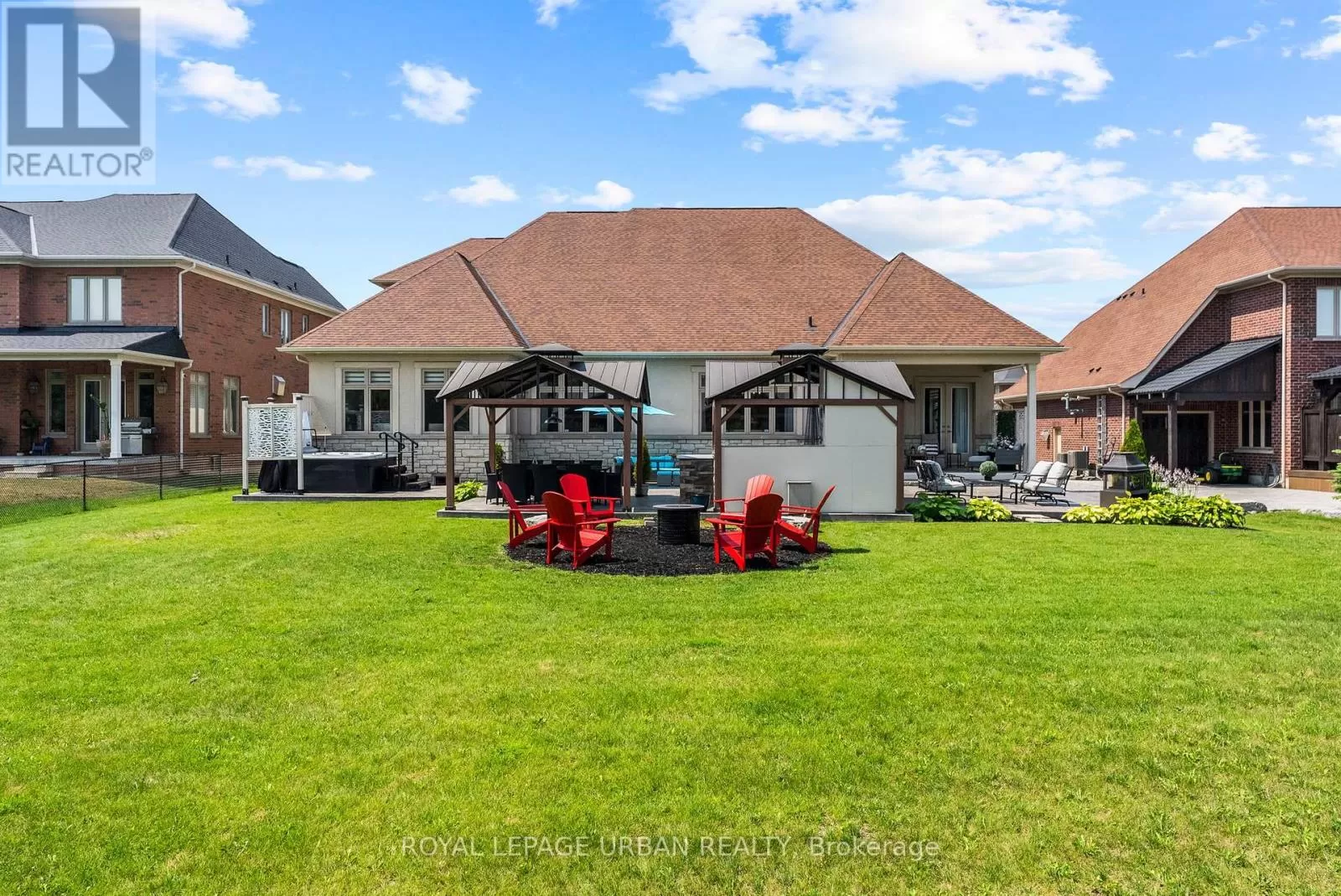 Brock Rd & Goodwood Rd Welcome to this luxurious 6-bedroom, 5-bath bungaloft, perfectly positioned on an impressive 85 x 205 ft lot within one of Uxbridge's most exclusive gated golf course communities. Offering over 6,000 sq. ft. of finished living space with soaring 10 ft ceilings throughout, this home blends timeless elegance with modern convenience.The main level showcases a chef-inspired kitchen with Sub-Zero and Wolf appliances, walk-in pantry, custom wall units, and a convenient main-floor laundry. Expansive principal rooms flow seamlessly, with spacious bedrooms featuring walk-in closets for ultimate comfort.The fully finished basement offers versatile living and entertainment spaces, ideal for hosting family and friends. Every detail has been thoughtfully upgraded, including stamped concrete walkway, accent walls and ceilings, pot lights, and an EV charger.Step outside to your private backyard retreat, complete with a hot tub, two gazebos, and professionally landscaped grounds perfect for outdoor living and entertaining.With parking for 9 vehicles and a 3-car garage, this home truly has it all.This is a rare opportunity to own a modern, upgraded residence in one of Uxbridge's most sought-after communities. (id:27476)