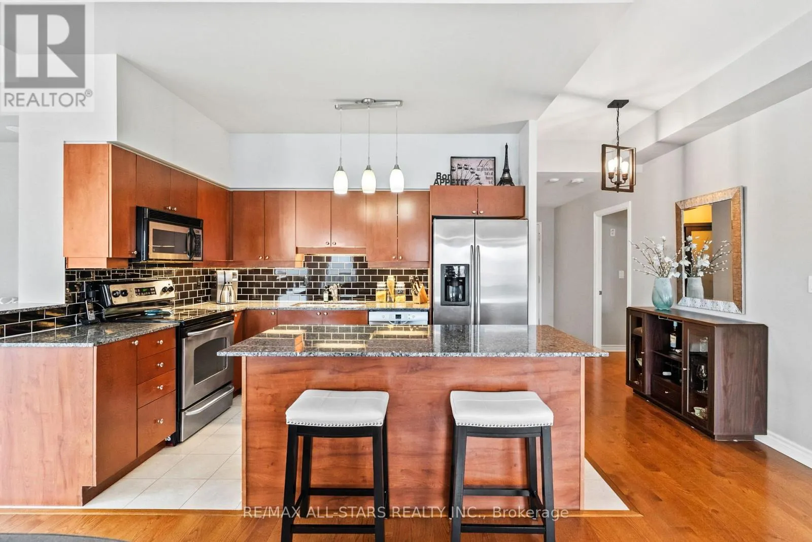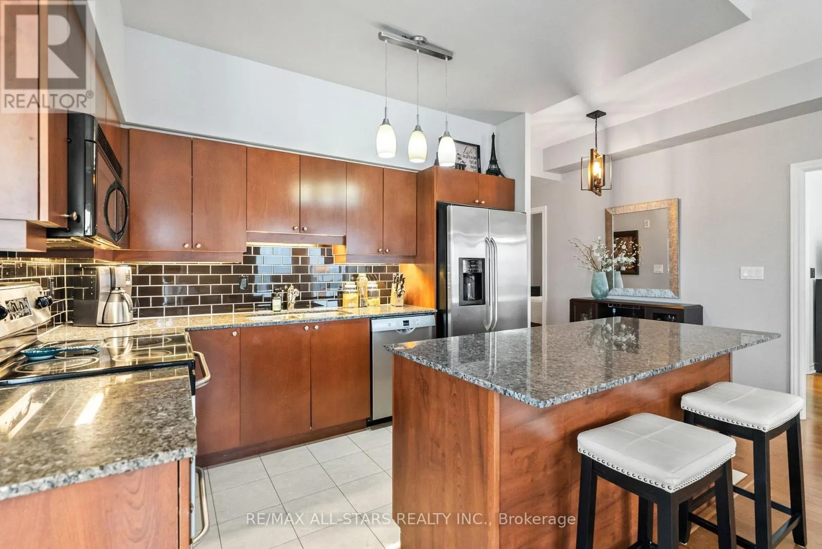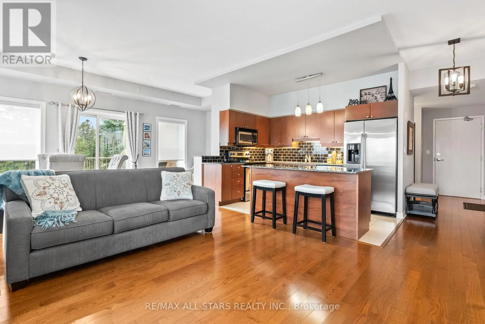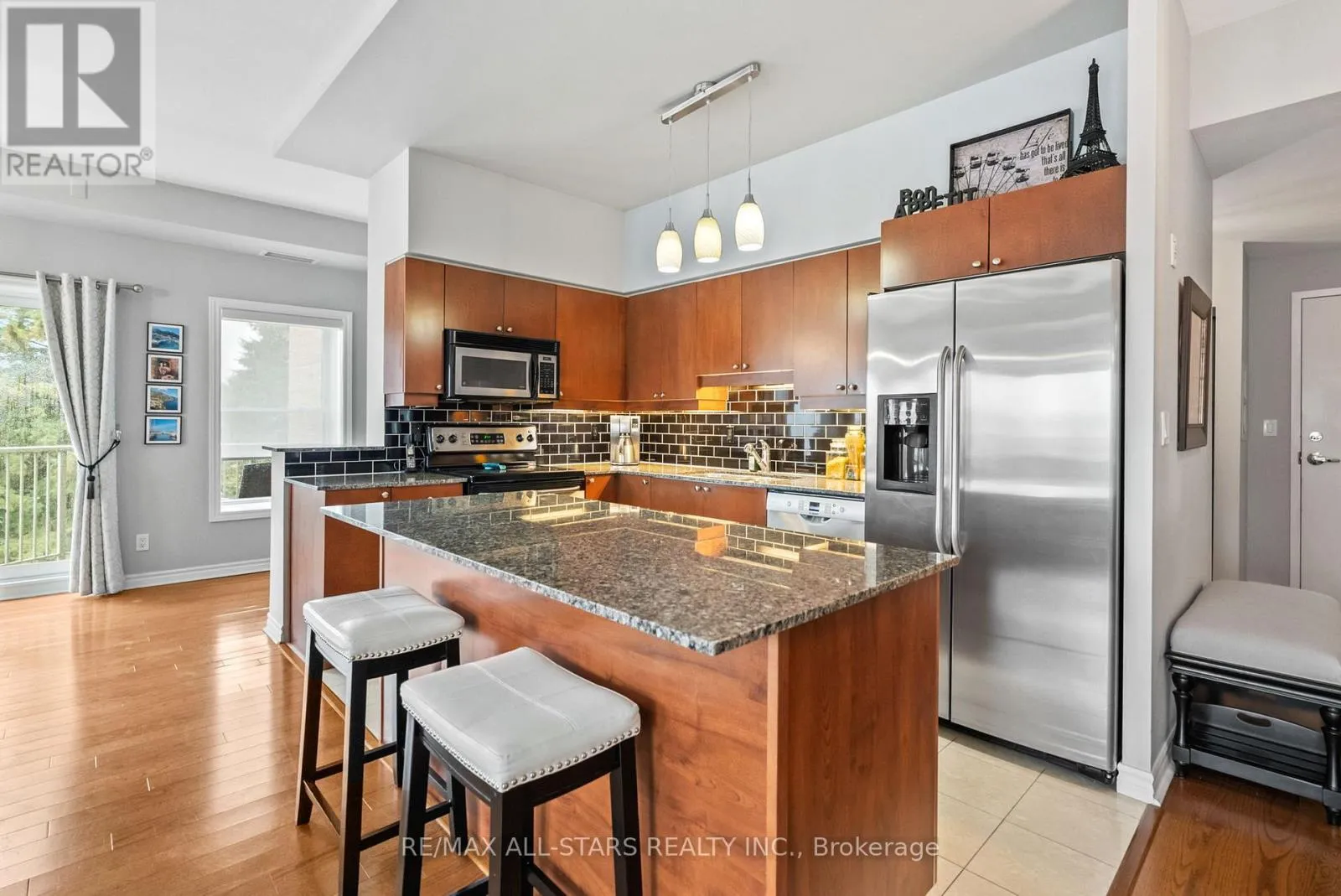 Cross Streets: Toronto St and Campbell Dr. ** Directions: Toronto St to Campbell Drive and Left onto James Hill Crt. Visitor Parking is near the front of the building and to the North side. Welcome to Bridgewater Condominiums! This beautifully maintained 3rd-floor corner unit offers 1,131 sq. ft. (per MPAC) of stylish, comfortable living with 9' ceilings, two bedrooms, and two full baths. Enjoy the convenience of two deeded underground storage lockers and a premium, wide parking space with walls on each side. Condo fees of $767.95 include water (including hot water) and common elements.Step inside the Unit to a spacious foyer featuring a stylish sliding door for pantry storage and a front hall closet. The warm, inviting kitchen boasts granite countertops, a black subway tile backsplash, and stainless steel appliances (Dishwasher 2022). The bright eat-in dining area and cozy reading nook are filled with natural light from large windows and a patio slider leading to your private balcony. The open living area features an electric fireplace, perfect for relaxing or entertaining.The large primary suite easily accommodates a king-sized bed and includes two closets, with organizers, and a 4-piece ensuite with a walk-in shower and tub. The second bedroom offers a generous closet, while the updated second full bath (2021) includes a Bath Fitter walk-in shower and in-suite laundry with washer and dryer (2021). Custom roller shades (2020) and abundant storage throughout complete this move-in-ready condo. Bridgewater residents enjoy a lively community with social gatherings and amenities including a grand lobby, secure entrance, party/recreation room with kitchen, car wash and workshop areas, garbage chute on each floor, visitor parking, and a gazebo with BBQ. A rare find offering comfort, community, and convenience-all in one exceptional package! See Features attached to Listing! Rare 2 Storage Units deeded with unit. (id:27476)