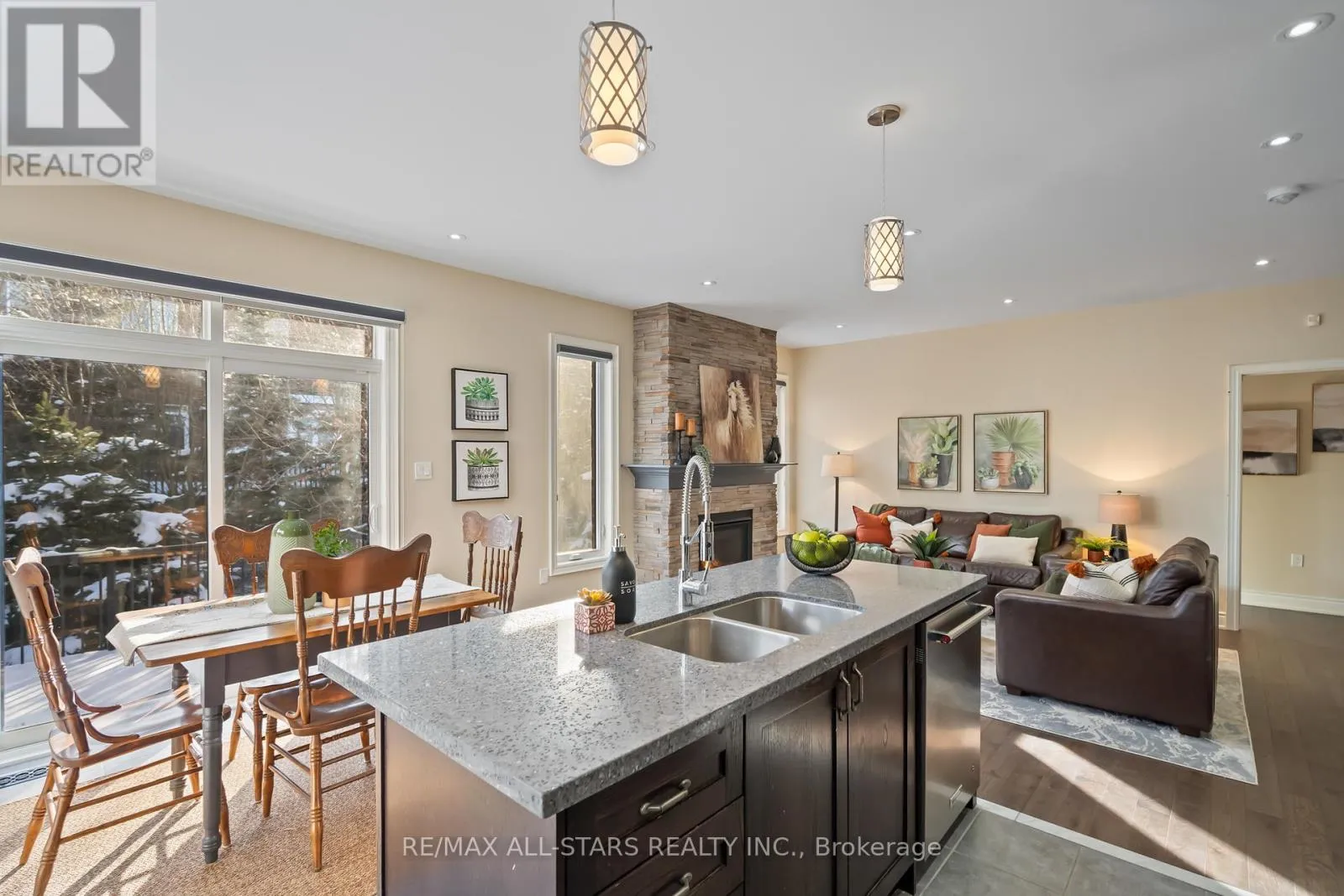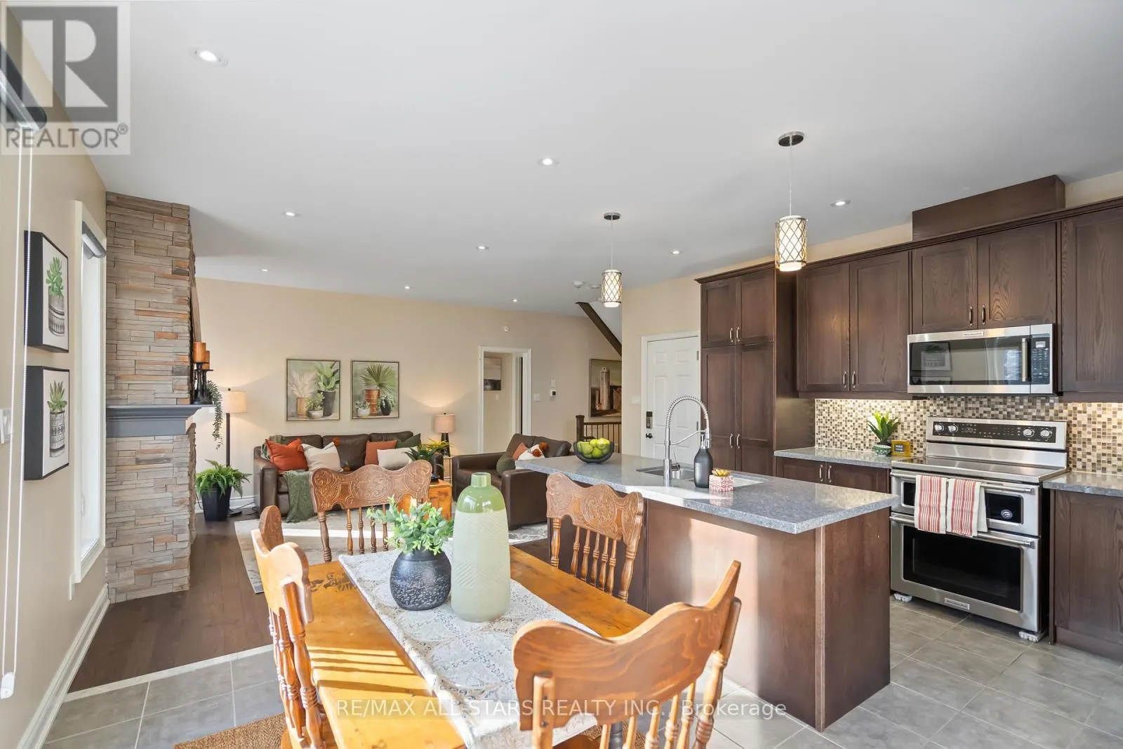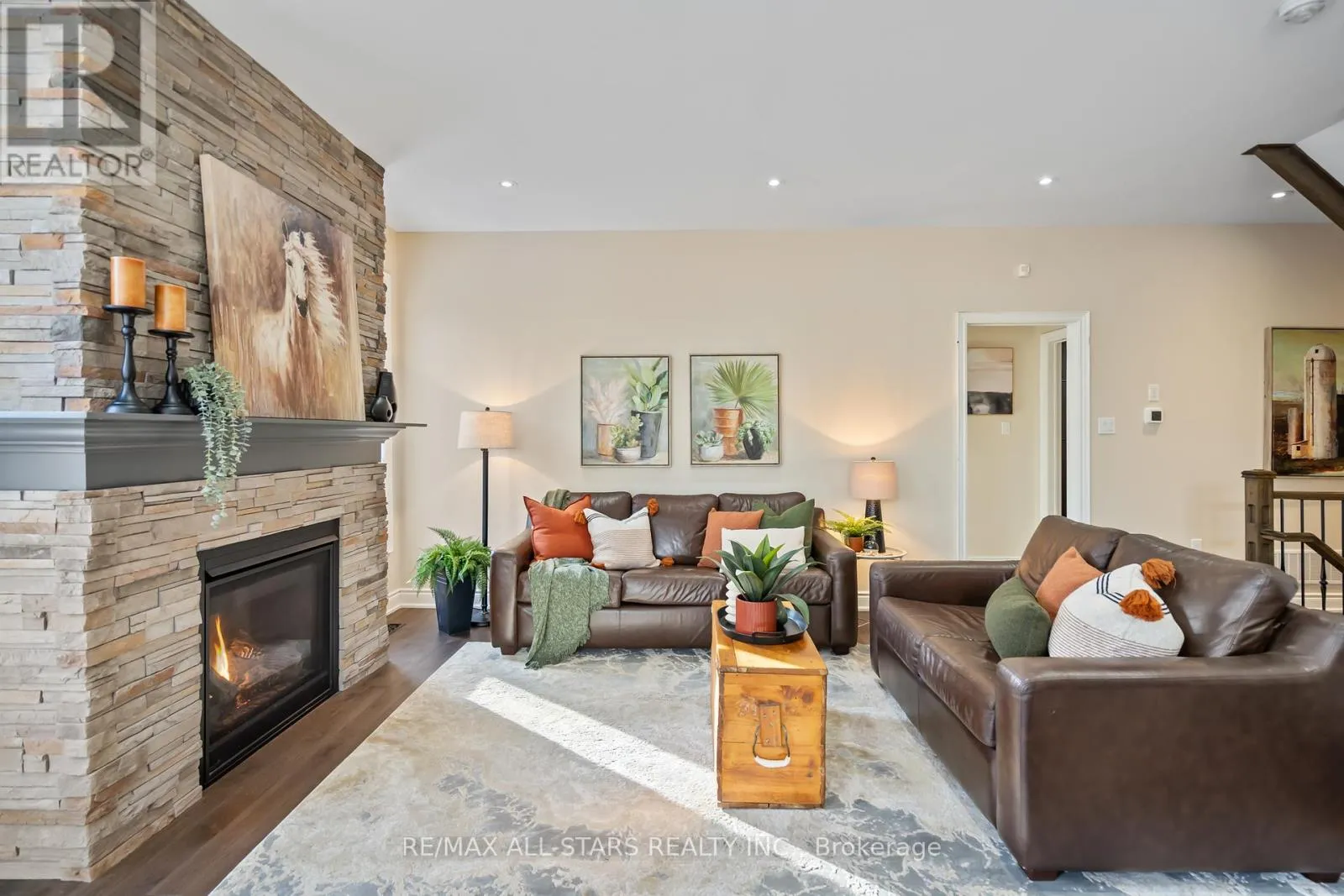 Main Street and Oakside Drive Curb appeal is the first thing you notice with this beautiful 4 bedroom bungaloft on prestigious Os James Hunt Court. With rich red brick and a neutral stone facade, interlock walkway and natural stone steps you are welcomed with immediate warmth. Entering the home you'll appreciate the open concept layout across the back of the house including the living room with gas fireplace featuring cultured stone veneer and framed within 2 large windows, the spacious kitchen with stainless steel appliances and quartz countertops and the dining area which walks out to the deck through the patio slider. The principal suite includes a 5 pc ensuite with built in soaker tub and glass shower enclosure and a spacious walk-in closet with wardrobe. The 2nd Bedroom overlooks the front with a gorgeous arched window and has semi-ensuite access to the 4pc main bathroom. Laundry is conveniently located on the main floor while two additional closets provide ample storage for linens and jackets near the foyer. The upper level features two additional large bedrooms with closet organizers and a third full bathroom. The lower level is unfinished, you can visualize the potential with the wide open space and above-grade windows, and includes a rough-in for an additional bathroom. The landscaped backyard features a raised composite deck (permitted 2017 per MPAC) and interlock patio seating area which continues to wrap around to the gate and walkway to the front of the house. **EXTRAS** POTL $286.94.57 includes street snow removal and garbage/recycle/compost waste removal - full inclusions to be confirmed with the Status Certificate. (id:27476)