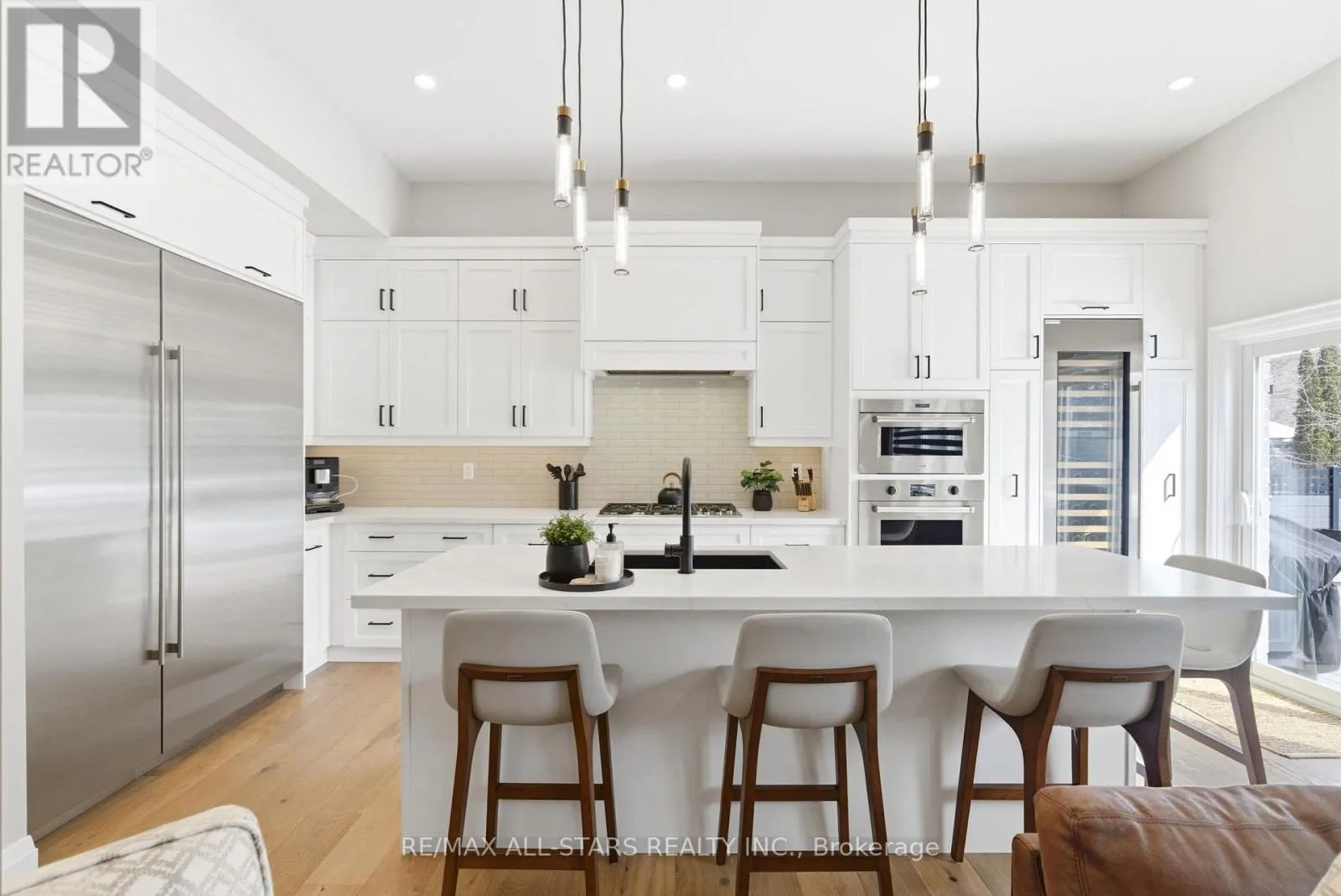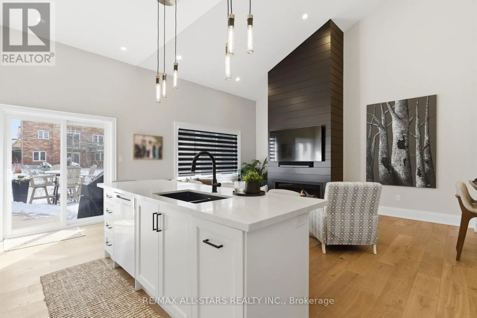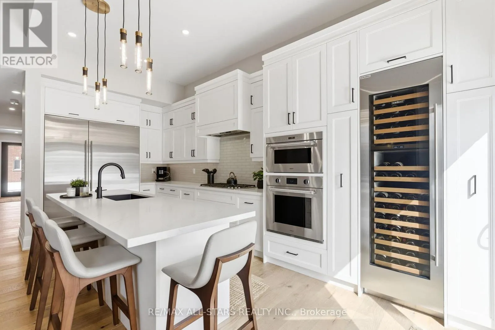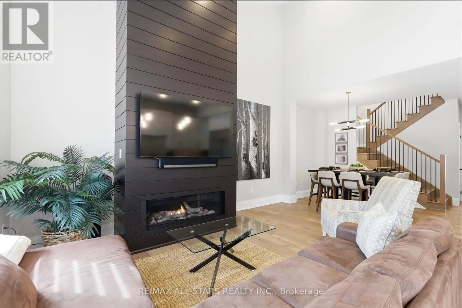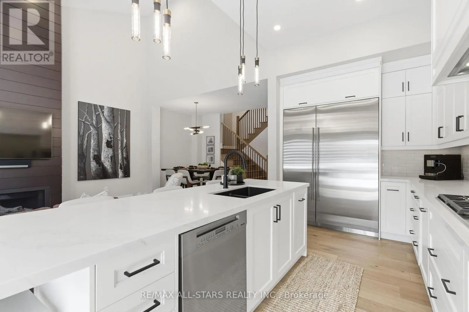 Brock St East/ Nelkydd Ln This home is the definition of upgraded living. Thoughtfully designed from top to bottom, every space showcases elevated finishes, smart features, and carefully selected details. The main floor welcomes you w/ a living room centred around a Napoleon gas fireplace, shiplap accent wall, and automatic blinds. The kitchen is designed for everyday living and entertaining, w/ quartz counters, a large island w/ extension, two pull-out pantry systems, under-cabinet lighting, and a walkout to the private backyard retreat. The premium appliance package includes a Sub-Zero refrigerator/freezer, Sub-Zero wine fridge, Miele dishwasher, and a suite of Wolf professional appliances. The main floor bedroom features a double closet w/ automatic blinds and organizer, while the nearby 3pc bathroom offers heated floors, a quartz vanity, LED mirror, heated bidet toilet seat, and a glass walk-in shower. The laundry room includes heated tile flooring and built-in cabinetry. The primary suite serves as a private retreat w/ built-in end tables, accent wall, walk-in closet w/ organizers, automatic blinds, and a sliding door to the composite deck w/ hot tub. The ensuite features heated flooring, double vanity w/ quartz counters, glass shower, LED mirrors, and heated bidet toilet seat. Upstairs, the loft offers a dedicated desk area, alongside a large bedroom w/ automatic blinds and a walk-in closet. The 4pc bathroom continues the home's refined design w/ heated floors, quartz vanity, LED mirror, heated bidet toilet seat, and tub. The finished basement adds a home gym w/ specialty flooring, mirrored walls, and a feature wall, plus a private theatre room w/ theatre seating, built-in cabinetry, a dry bar, and automatic blinds. A large bedroom w/ built-in desk and a 2pc bathroom w/ private sauna, quartz vanity, LED mirror, and heated bidet toilet seat complete the level. Outside, upgrades include composite decking, glass railings, a sunken hot tub, gas hookups, irrigation, and composite fencing. (id:27476)