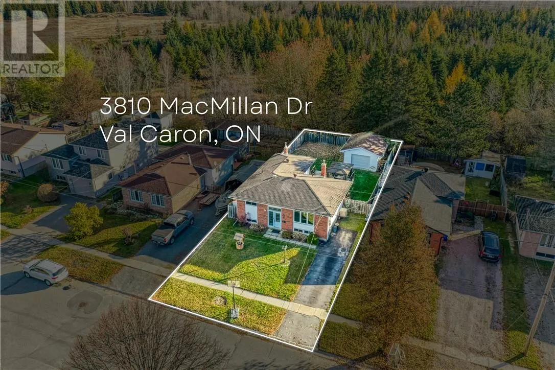 Welcome to 3810 MacMillan Driveâtucked away on a quiet dead-end street in Val Caron, offering exceptional privacy and space, with no rear neighbours. Featuring 3+2 bedrooms and 2 full bathrooms, this bungalow provides plenty of room to grow inside and out. The charm begins the moment you arrive, with its welcoming curb appeal, paved driveway, and detached heated garage. Step inside to an inviting front entrance and a spacious living room that flows seamlessly into the kitchen and dining areas. The kitchen offers ample cupboard space, a functional island with extra storage, and stainless steel appliances. Patio doors lead to a large deck and a fully fenced backyardâperfect for morning coffee or summer barbecues. Entertain with ease on the expansive deck with over 560 sq ft of space, leading to an added enclosed gazebo with a hot tub. Large windows throughout fill the home with natural light, creating a warm atmosphere, filled with the perfect sunlit spaces. The main floor also includes three bedrooms, a spacious bathroom, and linen closet. The primary bedroom features generous space with a second set of patio doors nearby for convenient access to the deck. Downstairs, the finished basement offers even more living space with a cozy rec room featuring a gas fireplace, two additional bedrooms, a second full bathroom, and a laundry/utility area with extra storage. The second bedroom with walk-in closet offers versatile potentialâit could serve as an ideal home office, gym, playroom, or more. Enjoy the comfort and efficiency of forced-air natural gas heating with a Napoleon furnace and central air conditioning. Offering immense potential and ready for your updates, this home presents a wonderful opportunity to make it your own. Close to local shops, schools, trails, and parks, this property is perfect for families or first-time buyers seeking comfort, privacy, and room to grow. (id:27476)