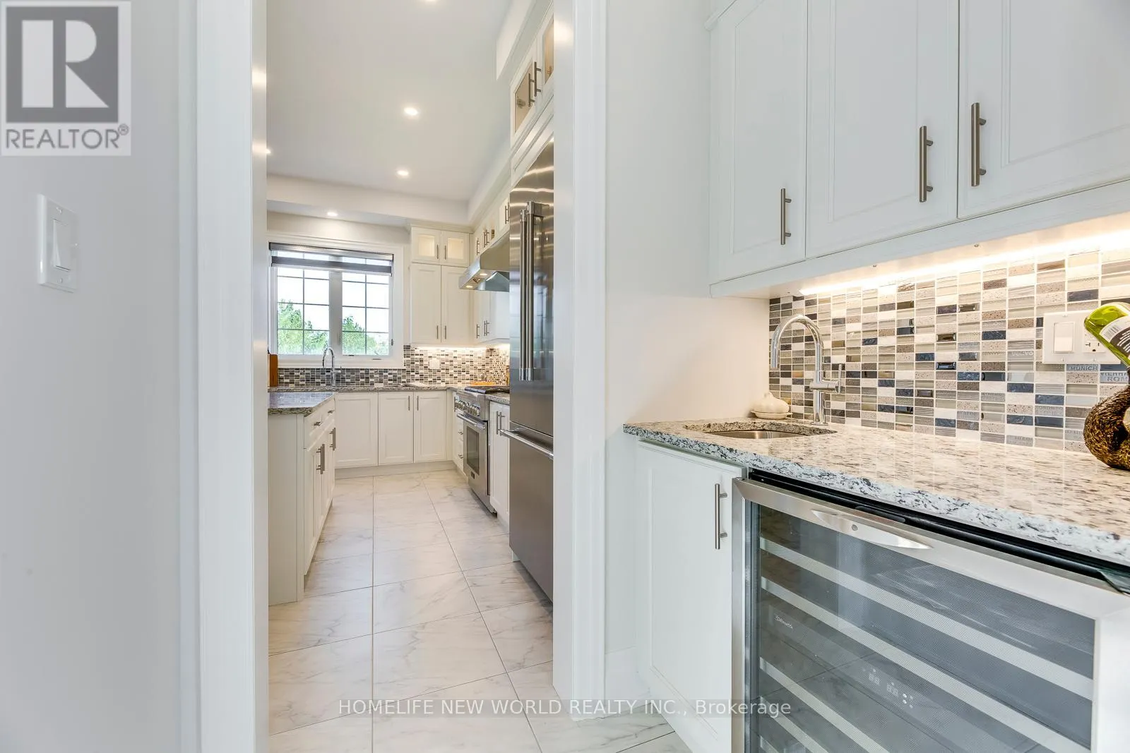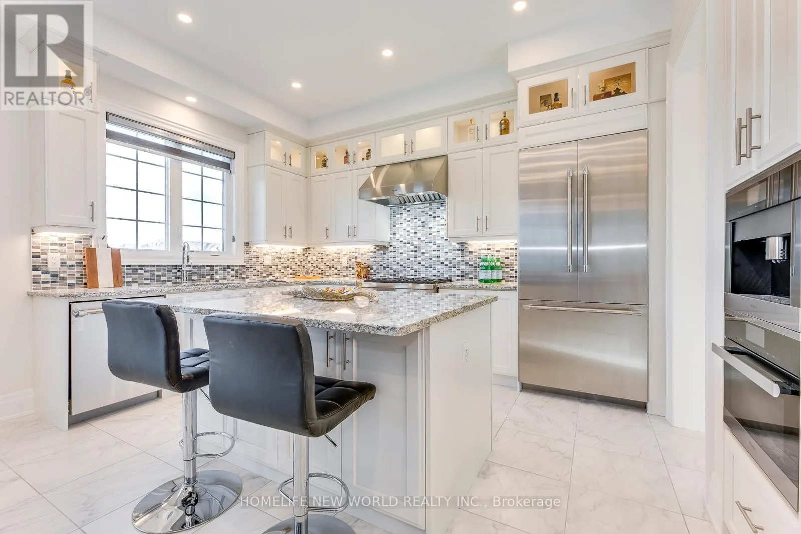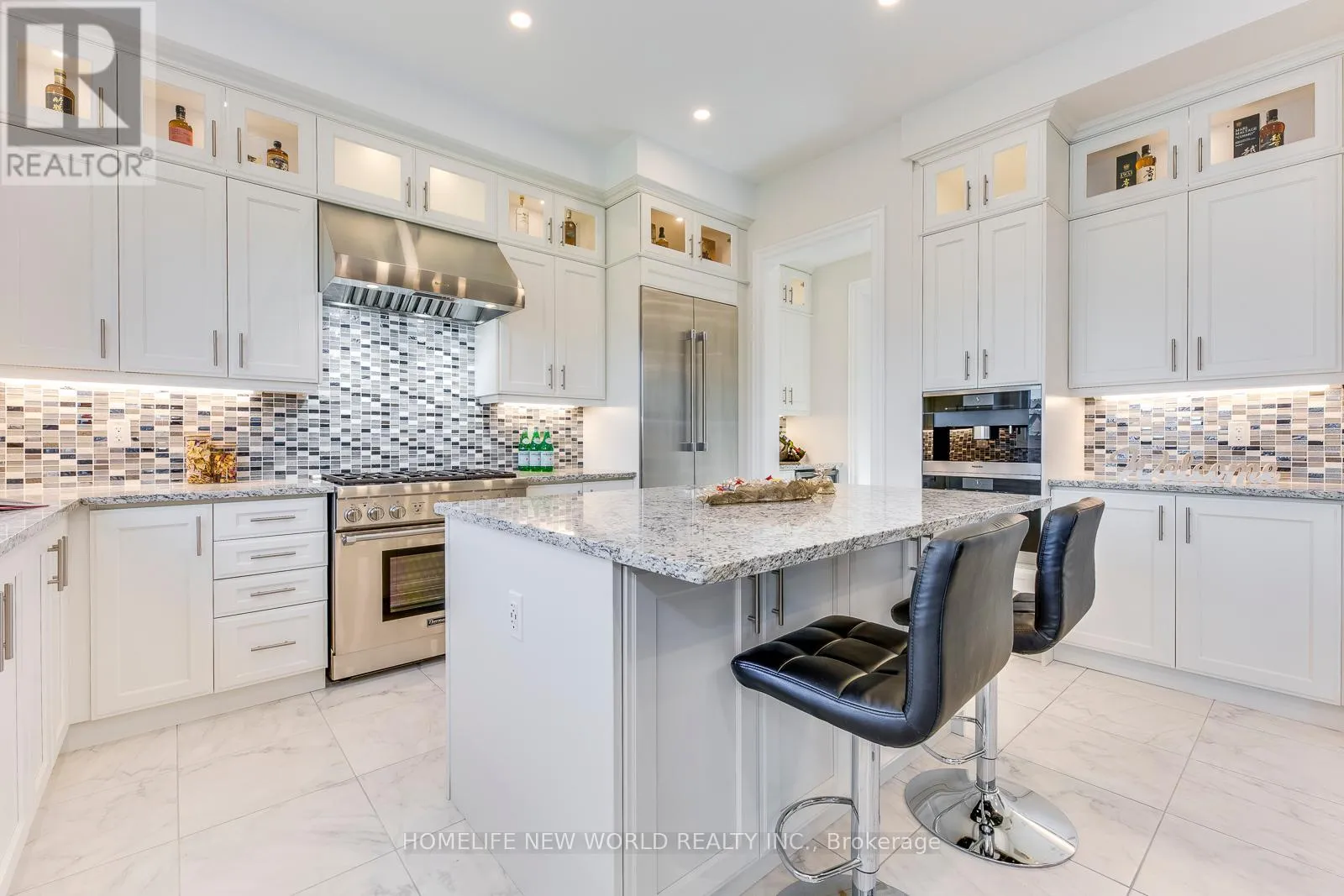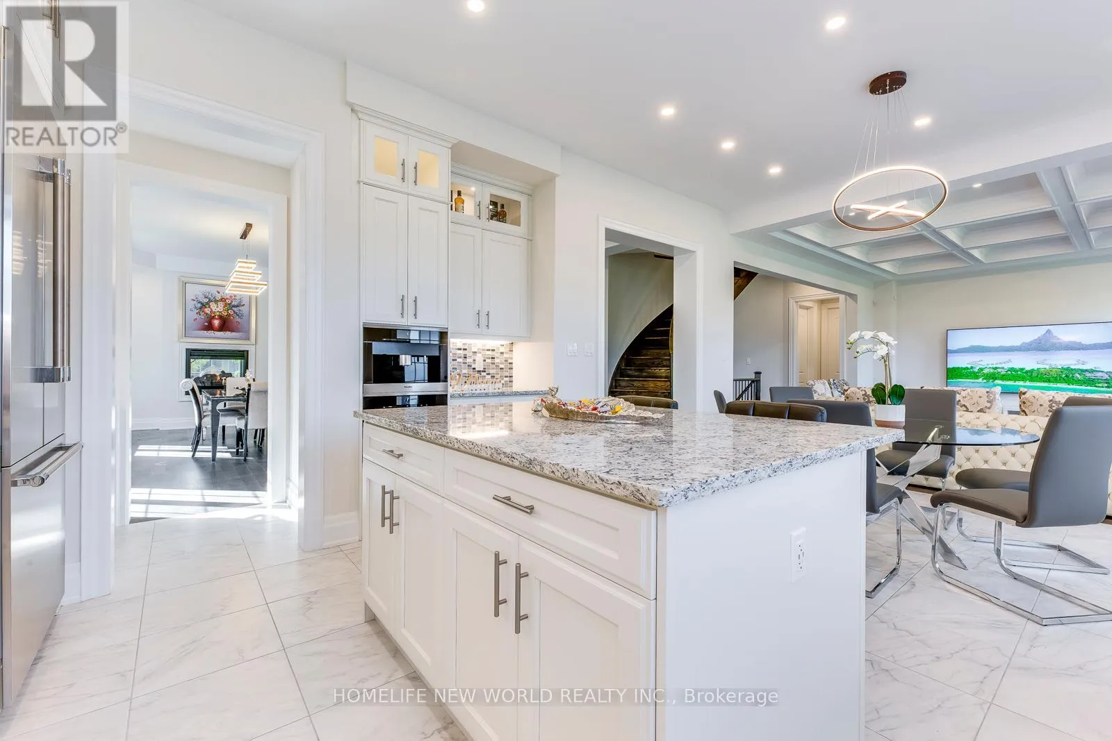 Hwy 27 & Major Mackenzie Drive Masterpiece Estate with magnificent lookout ravine lot that offers 6000 sq. ft. luxurious living space. The property comes with an oversized lot with 70ft X 133ft offers two and a half storeys with 5 bedrooms, 5.5 bathrooms, and unparalleled attention to detail throughout. 10 ceilings on main floor, 9 ceilings on 2nd floor, 8 on the 3rd floor, and 10 ceilings finished basement with vinyl flooring, a modern open bar with quartz countertop, built-in fridge, and modern wine cellar to show your expensive taste of wine is ideal for those who love to entertain. As you step into the property, immediately feature an open-to-above breathtaking modern rose gold custom chandelier. The office located on the right side of the foyer with a French door, custom waffle ceilings, and double-sided gas fireplace. Hardwood floors (above grade) and pot lights throughout the house. The gourmet kitchen comes with natural granite countertops and backsplash, under cabinet LED lighting, extended kitchen cabinets to the ceiling with glass doors and LED pot lights, boasts top-of-the-line brand new built-in Meile coffee machine & Meile dual steam and bake oven. Brand new built-in Thermadore fridge, Thermadore gas range, Thermadore hood & dishwasher as well as built-in wine fridge in the severy. Custom coffered ceilings in the great room. The master bedroom offers a 6 pieces ensuite with a double-sided temperature-controlled gas fireplace along with a extra large walk-in his and hers closet. The loft on the 3rd floor features a full ensuite bedroom and a Juliette balcony which is perfect for family that has an adolescence who may want their own private space in the house undisrupted. Interlock driveway leads to 3-car garage that all comes with garage door openers. Exterior pot lights around the house. New enclosed backyard fence. Close To Hwy 400, 407, and 427. Furniture inclusion available upon negotiation. (id:27476)