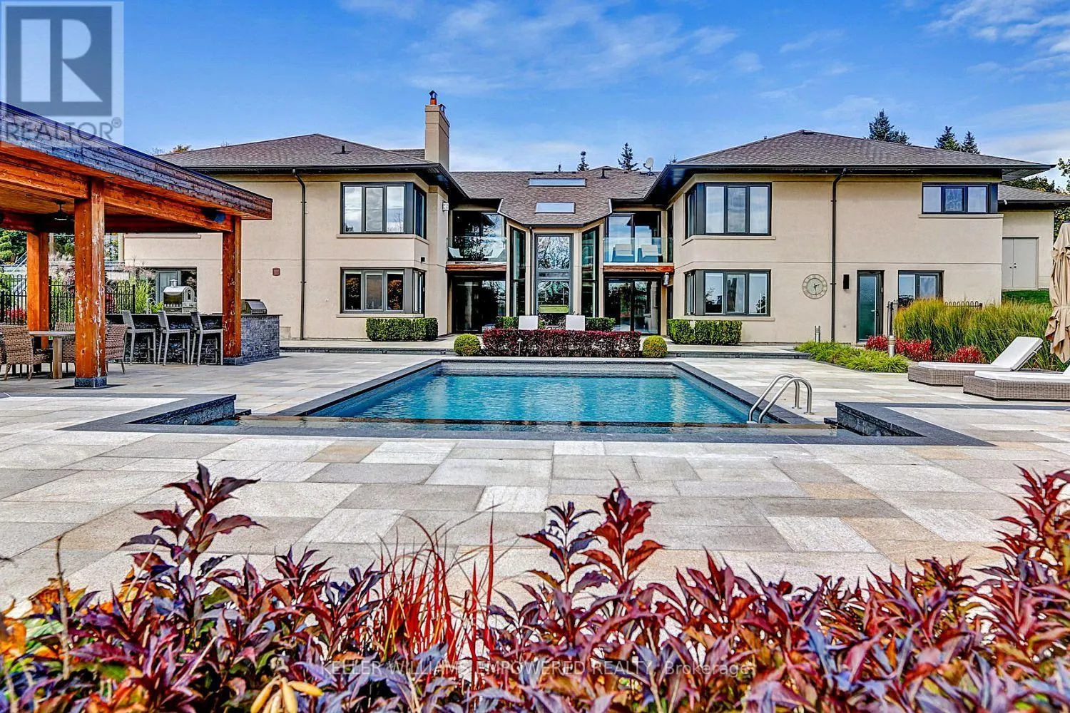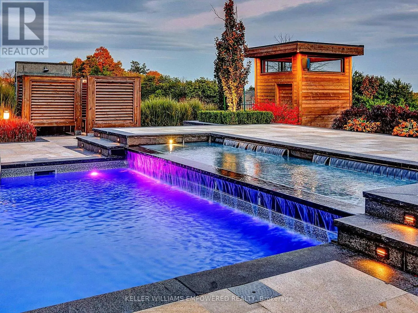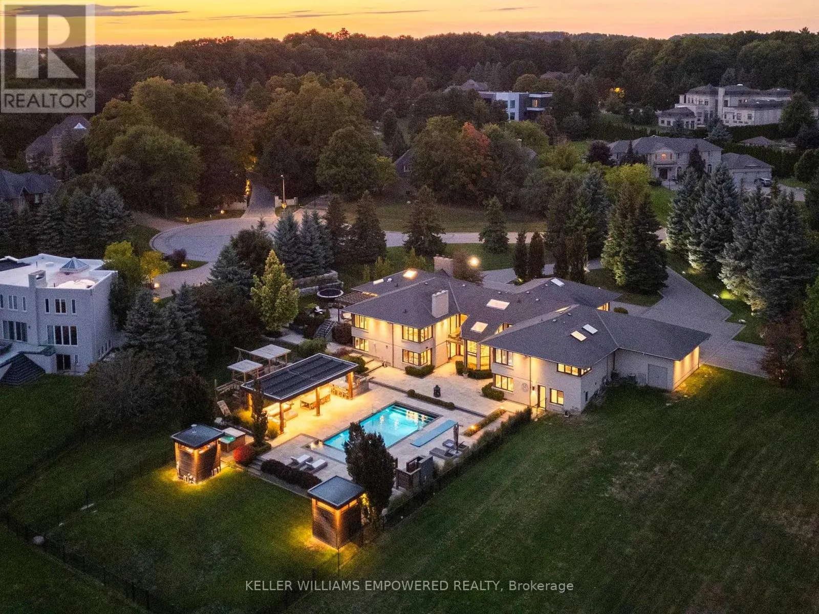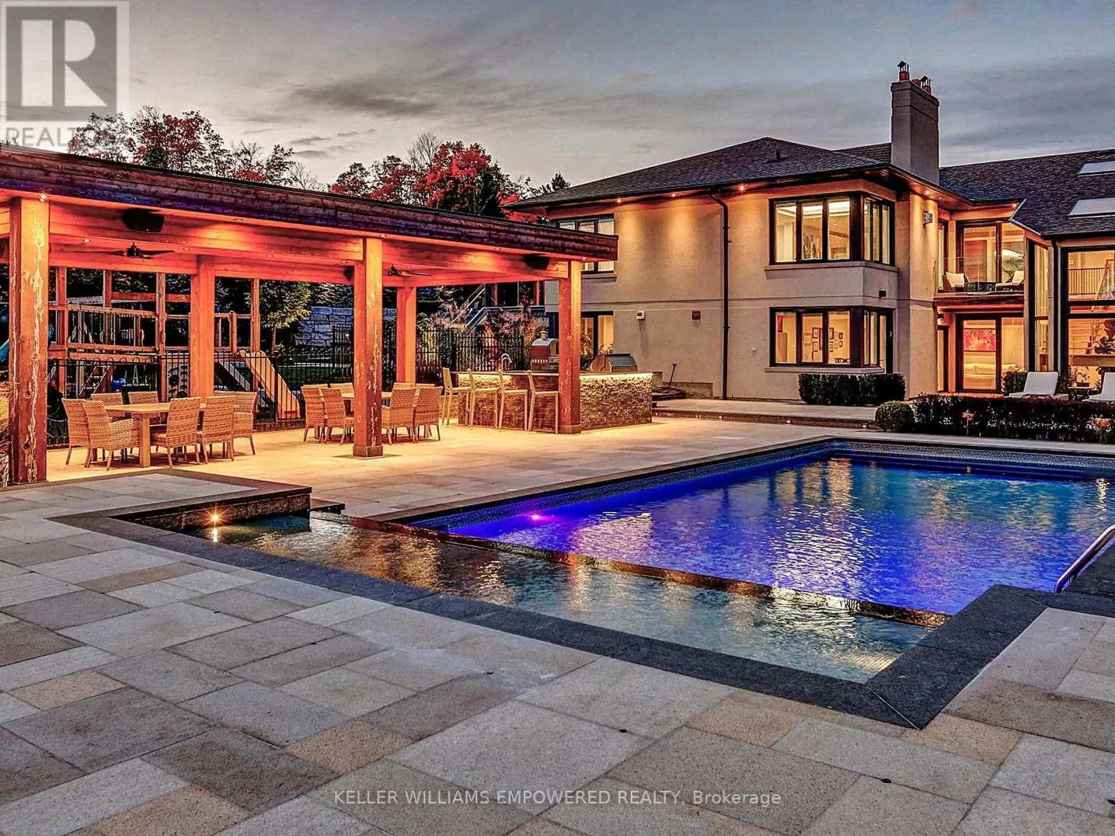 Cross Streets: Bathurst St & Elgin Mills Rd. ** Directions: West of Bathurst St & North of Elgin Mills Rd. A true resort-style estate that blends luxury living with year-round entertaining. Set on beautifully landscaped grounds with mature trees, granite walkways, and dramatic night lighting, this property offers complete privacy and sophistication from the moment you arrive. The outdoor oasis is a dream for both relaxation and entertaining, featuring an 18 x 38 foot saltwater pool with smart controls, waterfalls, a Baja ledge, and cabanas. A hot tub, outdoor shower, children's' play area, and multiple lounge spaces provide endless enjoyment. The cedar pavilion and fully equipped outdoor kitchen, complete with pizza oven, BBQ, refrigeration, freezer, and bar seating, make hosting effortless. Inside, cathedral ceilings, skylights, and expansive windows flood the home with natural light. The main living areas include a dramatic living and dining room with gas fireplace and custom built-ins, a chefs kitchen with heated floors, walnut cabinetry, marble countertops and Wolf/Miele appliances, opens to a comfortable family room with white rift cut oak floors. Five bedrooms on the upper level include a primary suite with spa bathroom, walk-in closet, and private balcony overlooking the pool. The walk-out lower level is designed for both leisure and extended living. It offers a recreation room, games room, second kitchen, full theatre with reclining seating, exercise or guest suite with salt sauna and spa area, plus ample storage. Additional highlights include a heated four-car garage with mezzanine, smart home systems, Sonos-integrated sound, triple-glazed windows, and extensive security features. This one-of-a-kind property offers the ultimate lifestyle, a private retreat that feels like a luxury resort yet provides all the comforts of home. (id:27476)