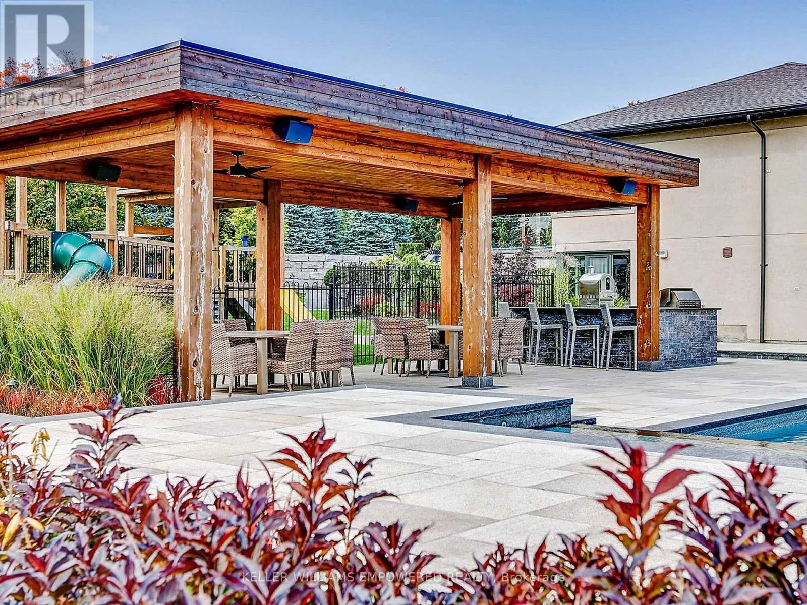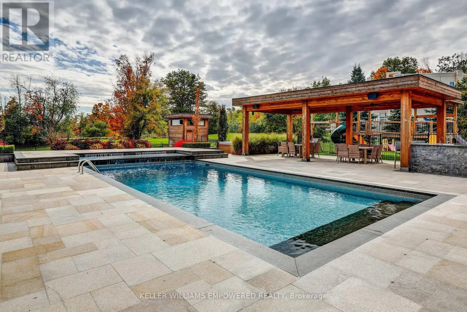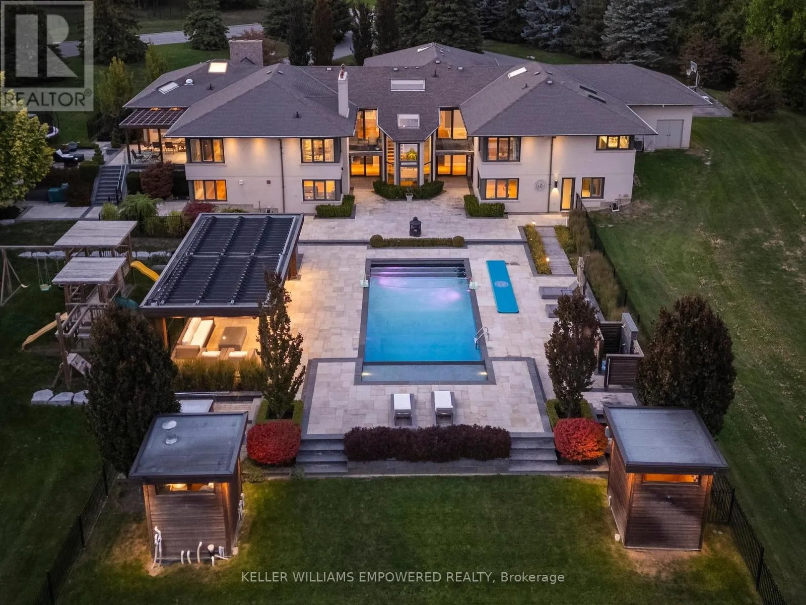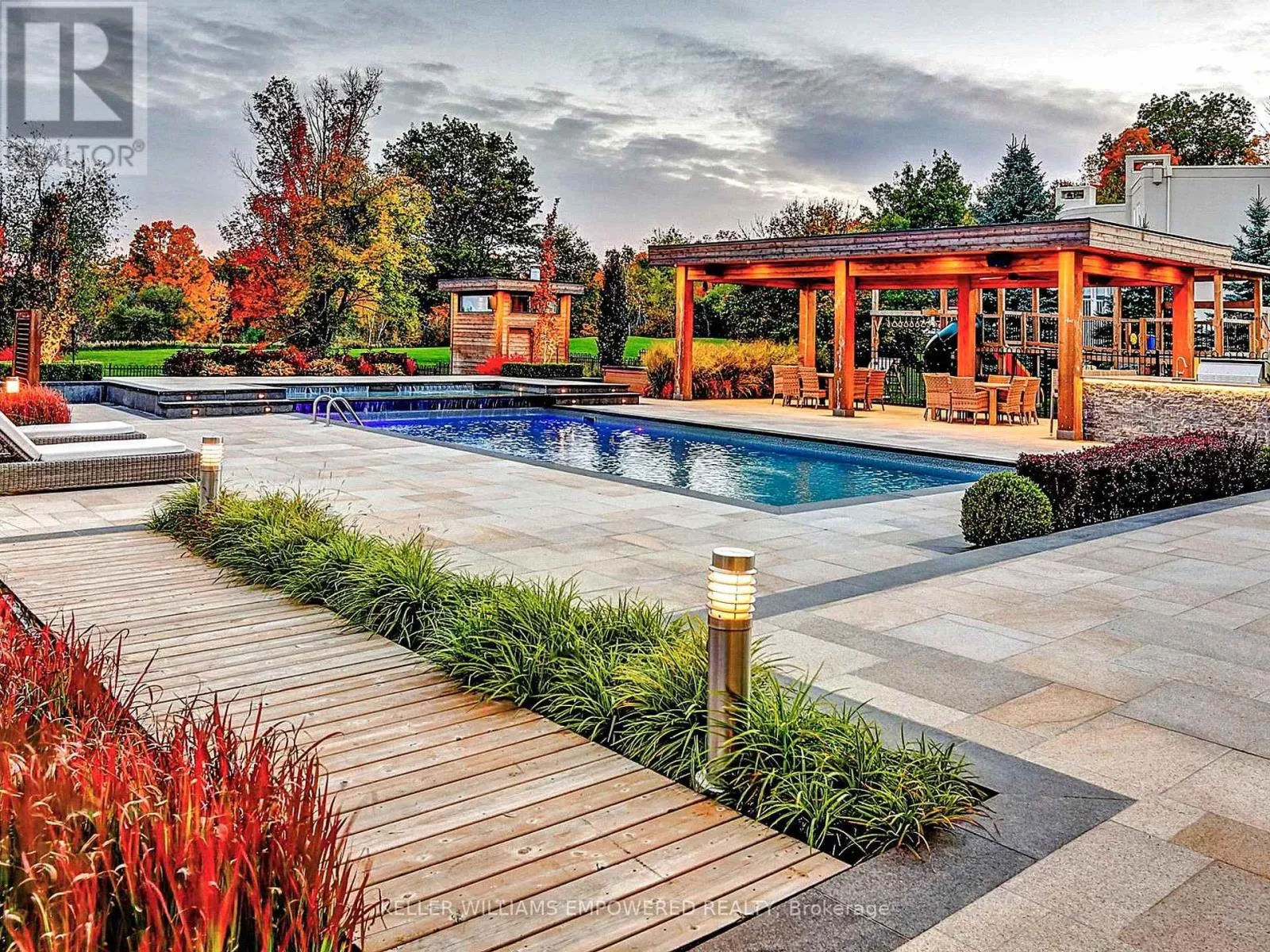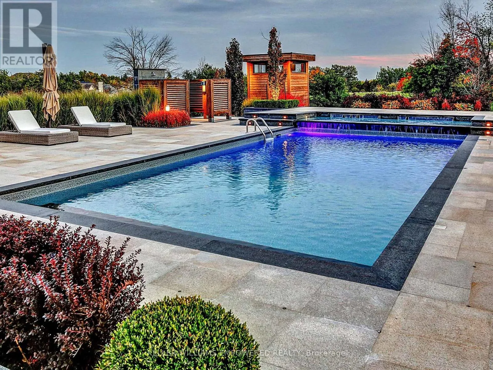 Cross Streets: Bathurst St & Elgin Mills Rd. ** Directions: West of Bathurst St & North of Elgin Mills Rd. A true resort-style estate that blends luxury living with year-round entertaining. Set on beautifully landscaped grounds with mature trees, granite walkways, and dramatic night lighting, this property offers complete privacy and sophistication from the moment you arrive. The outdoor oasis is a dream for both relaxation and entertaining, featuring an 18 x 38 foot saltwater pool with smart controls, waterfalls, a Baja ledge, and cabanas. A hot tub, outdoor shower, children's' play area, and multiple lounge spaces provide endless enjoyment. The cedar pavilion and fully equipped outdoor kitchen, complete with pizza oven, BBQ, refrigeration, freezer, and bar seating, make hosting effortless. Inside, cathedral ceilings, skylights, and expansive windows flood the home with natural light. The main living areas include a dramatic living and dining room with gas fireplace and custom built-ins, a chefs kitchen with heated floors, walnut cabinetry, marble countertops and Wolf/Miele appliances, opens to a comfortable family room with white rift cut oak floors. Five bedrooms on the upper level include a primary suite with spa bathroom, walk-in closet, and private balcony overlooking the pool. The walk-out lower level is designed for both leisure and extended living. It offers a recreation room, games room, second kitchen, full theatre with reclining seating, exercise or guest suite with salt sauna and spa area, plus ample storage. Additional highlights include a heated four-car garage with mezzanine, smart home systems, Sonos-integrated sound, triple-glazed windows, and extensive security features. This one-of-a-kind property offers the ultimate lifestyle, a private retreat that feels like a luxury resort yet provides all the comforts of home. (id:27476)