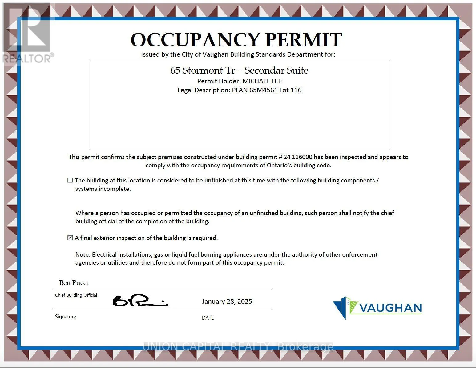 Cross Streets: Weston Rd & Major Mackenzie. ** Directions: South Side on Stormont Trail. Brand New Finished Legal Basement Apartment with Modern Finishes and Completed Final Occupancy Permits!! Be the First to Enjoy this Newly Completed 2 Bedroom + Den unit with Brand New Stainless Steel Appliances and LG Laundry Machines that have never been used! The Location is Very Family Friendly and is quiet with no neighbours across the street! The Separate legal side door entrance leads you down to a large Expansive Open Concept Space with several large upgraded Egress windows making it feel like a main floor level with Bright Natural Sunlight! Great Location that is close to Top Rated schools, Hwy 400 and Hwy 7, parks, grocery stores, shopping, restaurants, and public transit. Extras: XLarge Ensuite Storage Room, 1 parking space ( on new Stone Driveway ), Water Softner, Bright Potlights throughout and New Laminate Flooring. ... Easy to Show! and Great Friendly Landlords! (id:27476)
