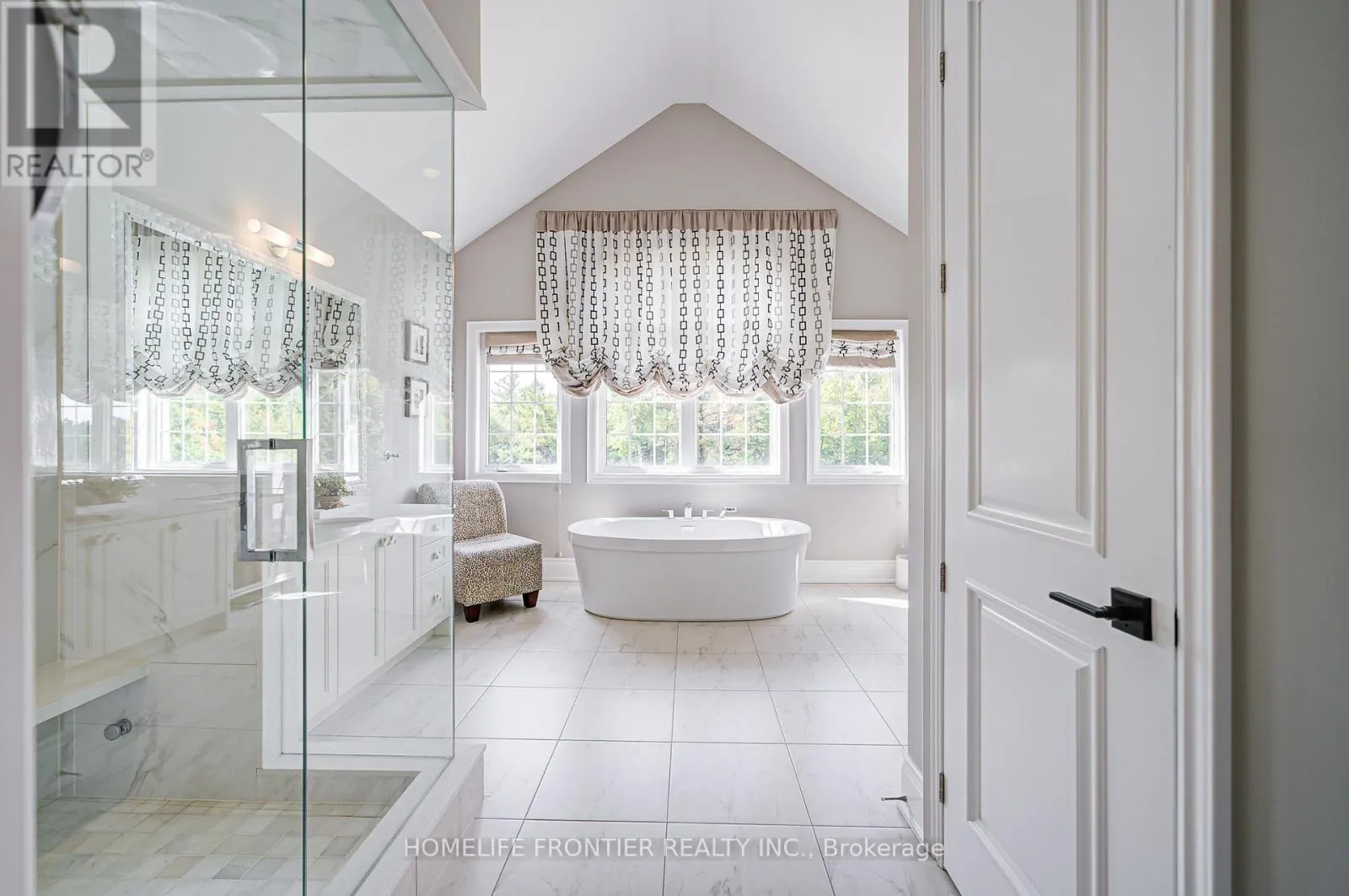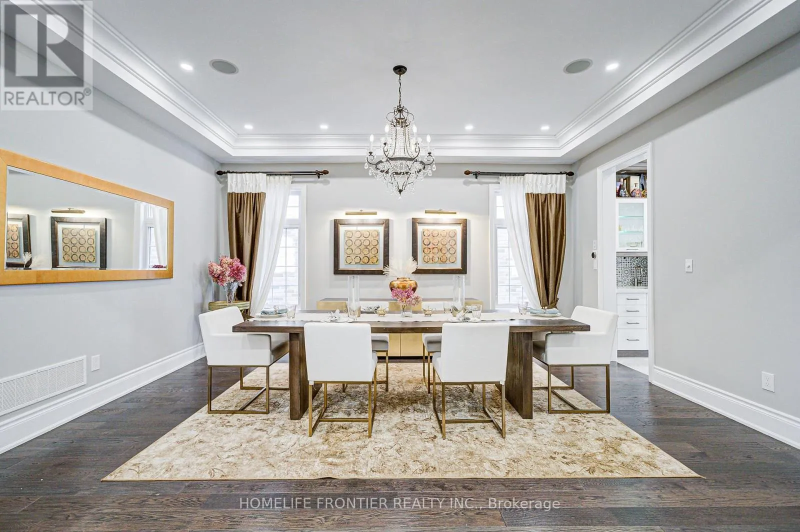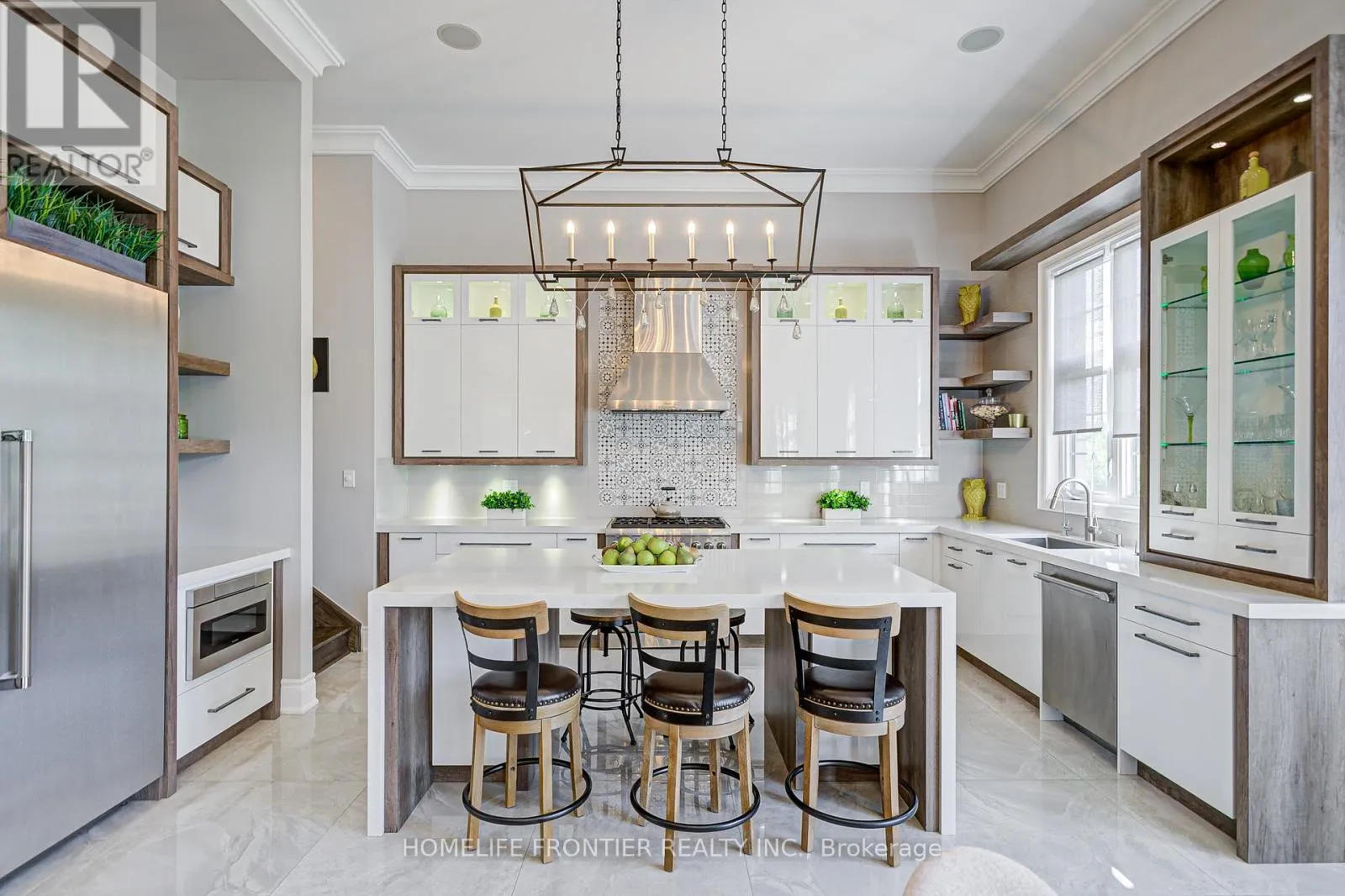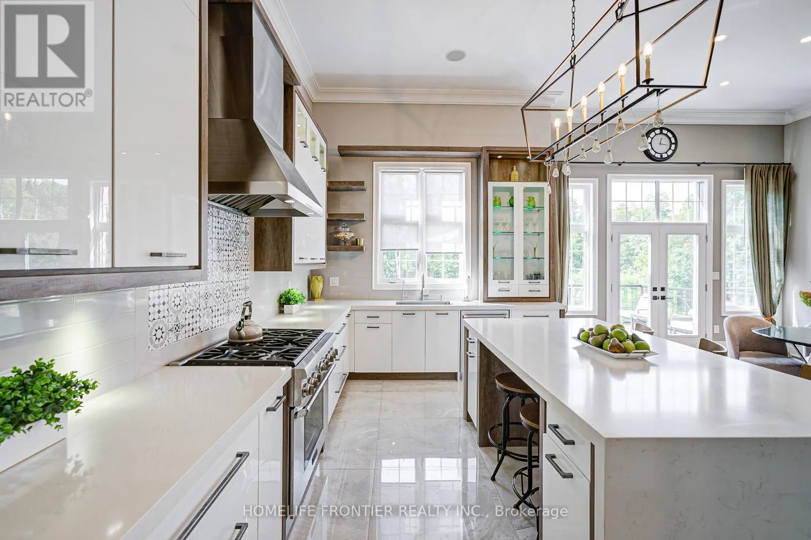 Bathurst Street & Major Mackenzie **R-A-V-I-N-E** Welcome to this exceptional residence in Upper West Side, a prestigious community in Upper Thornhill. Set on a premium pool-sized lot backing onto a picturesque ravine! - the perfect blend of luxury and nature! This home offers over 5600 sq ft of elegant living space included basement. 4+1 bedrooms and 6 bathrooms. The main floor features soaring 13-foot ceilings in the kitchen & family room, 10-foot throughout; 9-foot on the 2nd floor and basement. The heart of the home is a gourmet kitchen with premium appliances, additional servery and spacious pantry. Custom cabinetry, quartz countertops, oversized waterfall island. Breakfast area walks out to new composite deck. Family room fireplace framed with custom cabinetry. Solid 8ft doors, crown moldings, pot lights. Large formal dining room. Upstairs the home boasts 4 generous bedrooms, each with their own ensuite for privacy and comfort for family and guests. The primary suite is a private retreat with fitness room; spa-inspired 6-piece ensuite with dual vanities, a soaker tub, a glass-enclosed shower with steam, and generous size walk-in closet. Second floor laundry for everyday comfort. The lower level enhances the home with large recreational space, wet bar, 2-piece bathroom, bedroom, shop room with storage. Built-in speakers. A massive interlock patio leads to a beautiful perennial garden, creating a private oasis for outdoor living and relaxation. Sprinkler system, composite fencing. Landscaped/interlocked front. Exterior pot lights. A spacious three-car tandem garage and parking for up to 8 vehicles. Here, you'll be part of a vibrant community, with scenic trails at your doorstep and an excellent school right on the street **Viola Desmond Public School** shopping, dining, access to major routes and transit. (id:27476)