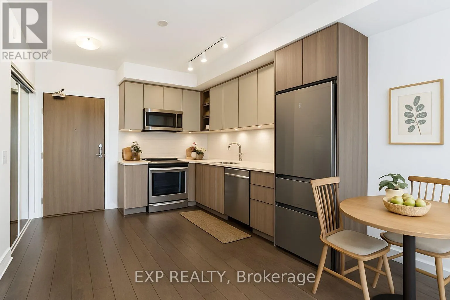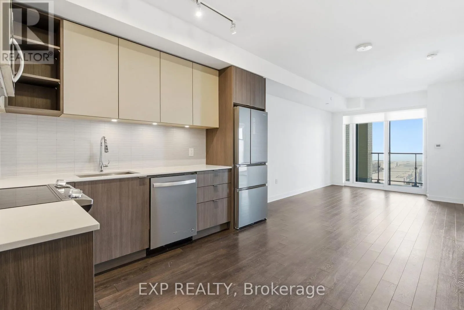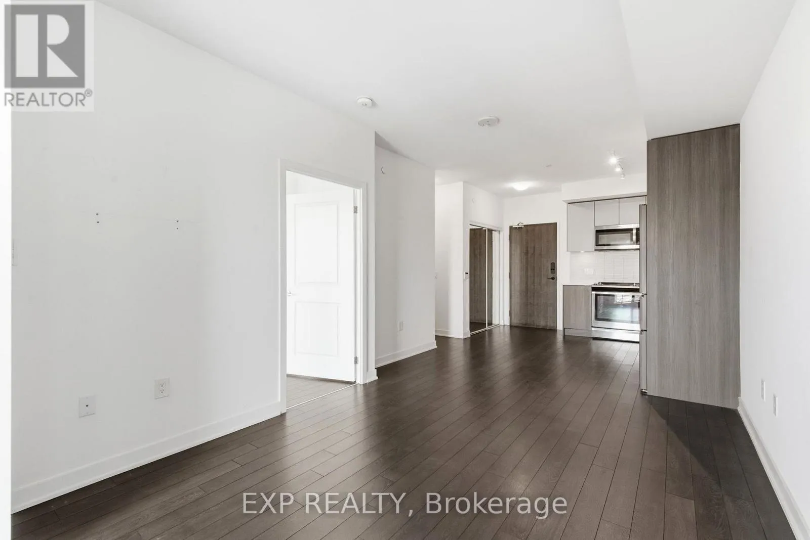 Keele and Major Mackenzie Modern Living Meets Urban Convenience at 100 Eagle Rock Way, Suite 730. Welcome to Unit 730, a bright and stylish 1+1 bedroom suite offering the perfect blend of comfort, convenience, and contemporary design in the heart of Vaughan. This beautifully maintained condo features 595 sq ft of thoughtfully designed open-concept living, complete with a rare oversized terrace-your own private outdoor escape with serene north-facing views. Inside, warm hardwood floors guide you through the airy living and dining area, ideal for relaxing or entertaining. The modern kitchen shines with stainless steel appliances, a built-in microwave, a built-in dishwasher, and ample storage. The spacious bedroom features a large wall of windows and double closet, while the versatile den offers the perfect space for a home office, study nook, or creative corner. Enjoy year-round comfort with central air, in-suite laundry, and inclusive maintenance fees covering heat, water, parking, and building insurance. Your new home also includes an owned underground parking space and an owned locker for added convenience. The building boasts fantastic amenities, including a rooftop deck/garden, sleek gym, party/meeting room, and plentiful visitor parking, making it an ideal spot for first-time buyers, downsizers, or investors looking to join one of Vaughan's most desirable communities. With easy access to transit, shopping, parks, and major highways, this suite delivers comfort, style, and unmatched convenience. Only 1 minute drive, or a 2-minute walk to the Go Station for easy commute downtown. (id:27476)