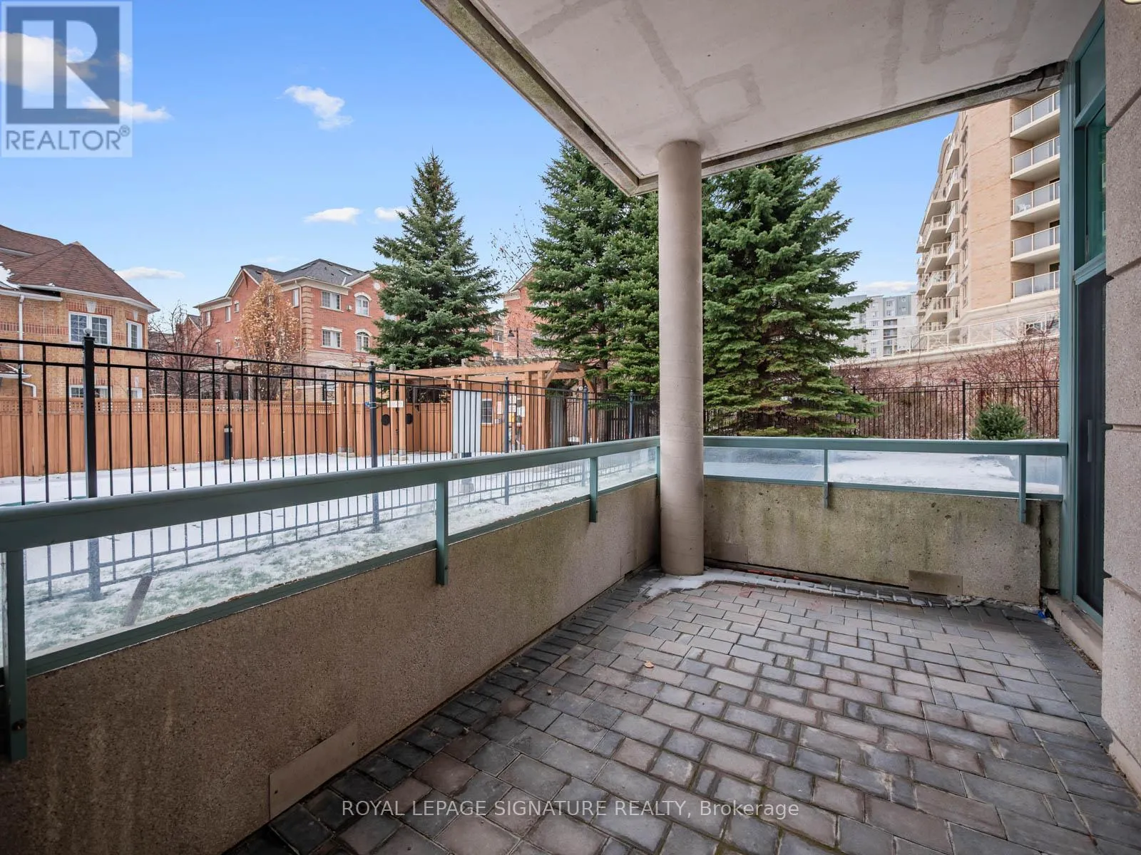 Bathurst St/Steeles Ave W Welcome to 5 Emerald Lane #102. This bright and spacious 1 bedroom, 1 bath condo offers 860 sq.ft of functional living space with 10 foot ceilings. This ground floor suite provides a home like feel with a large private terrace, unobstructed North Eastern exposure and peaceful garden, outdoor pool, and library views. There are walk outs from both the kitchen and the bedroom, creating an easy indoor outdoor flow. The layout offers generous room sizes and excellent natural light throughout the day. Located in a well managed building with great amenities and close to transit, parks, shops, and everyday conveniences. (id:27476)