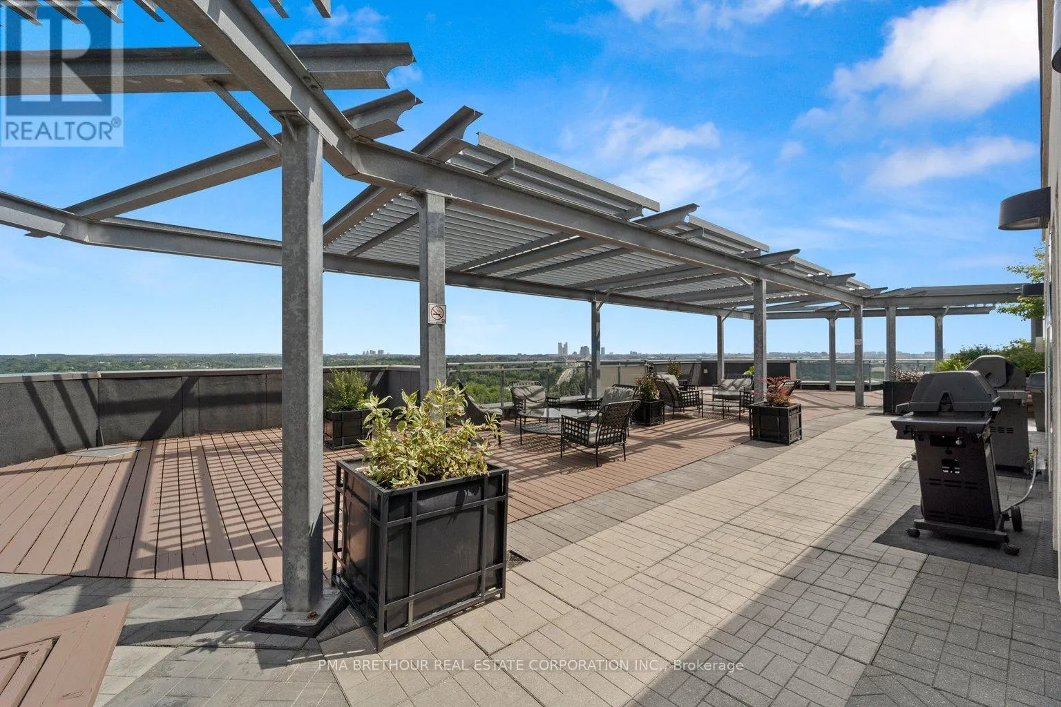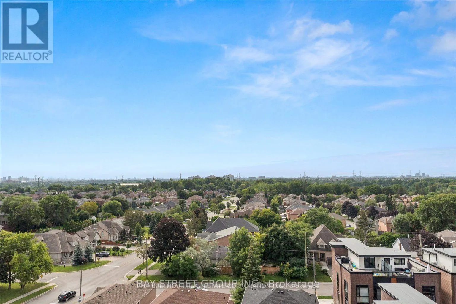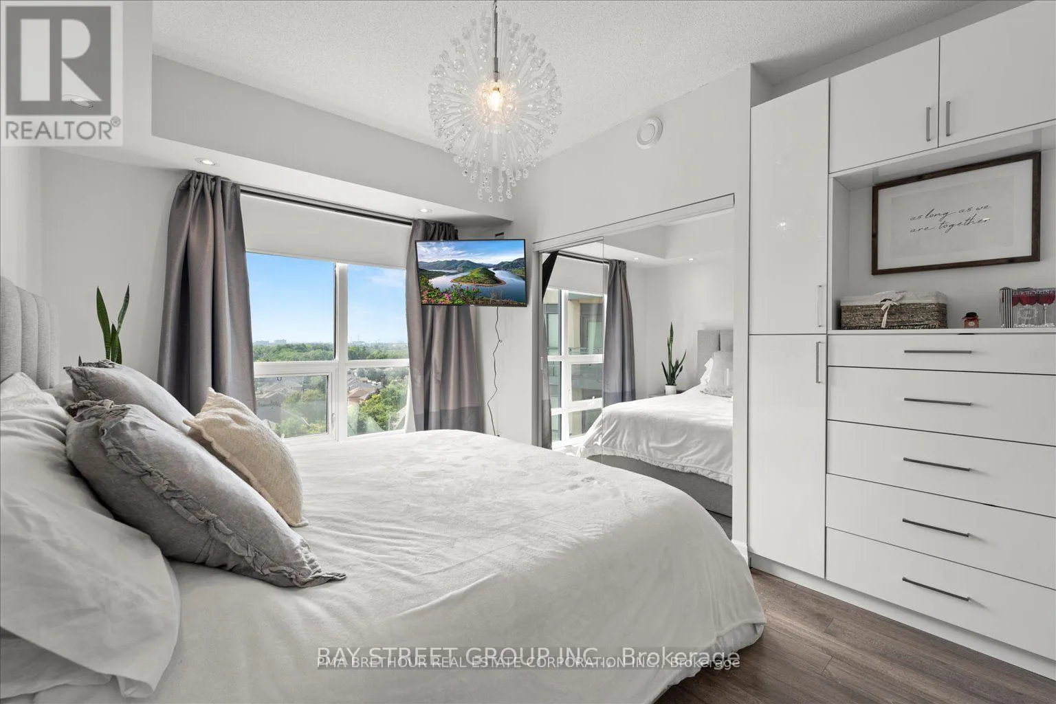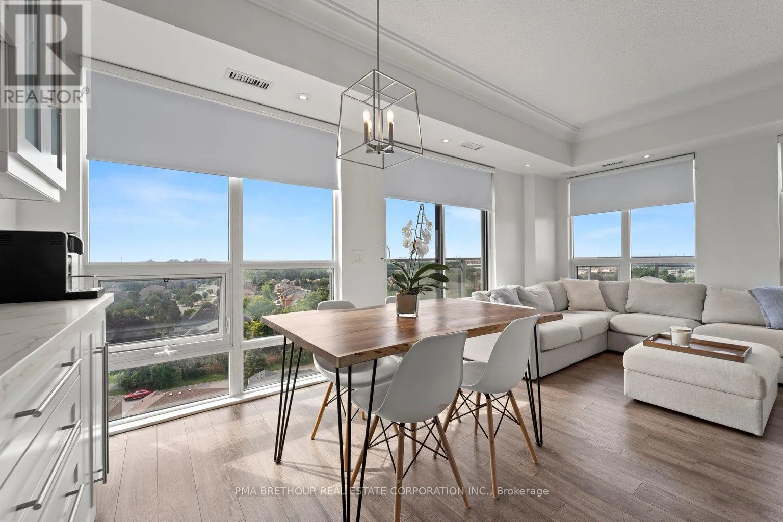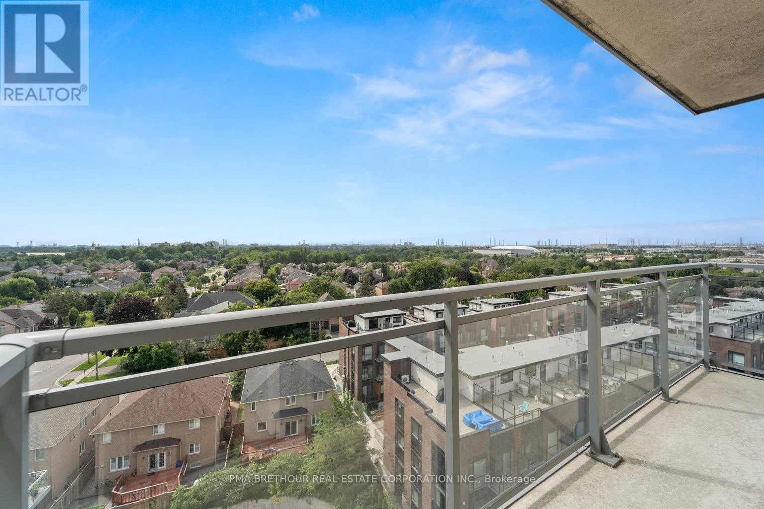Kipling & Highway 7 Absolutely stunning southwest-facing corner suite in the heart of Vaughan's West Woodbridge! This rare 2-bedroom, 2-bathroom layout offers approximately 920 sq ft of sun-filled, open-concept living and a spectacular wrap-around balcony with breathtaking, unobstructed views of the Veneto ravines and Toronto skyline. Floor-to-ceiling windows flood the space with natural light, complemented by motorized blinds and a modern rustic design that is both stylish and inviting. The chef-inspired kitchen features quartz countertops, custom backsplash, stainless steel appliances, centre island, valance lighting, crown moulding, and pot lights, flowing seamlessly into spacious living and dining areas with walk-out to your private outdoor retreat-perfect for entertaining. The primary bedroom offers a built-in closet and a beautifully upgraded 4-piece ensuite with marble floors and LED mirror, while the second bedroom showcases floor-to-ceiling windows and ample storage. Additional highlights include a large welcoming foyer, ensuite laundry, built-in speakers, upgraded lighting with USB outlets, 1 owned underground parking space, and 1 owned locker conveniently located on the same level. Well-managed building with premium amenities including gym, party room, rooftop terrace, sauna, security system, and visitor parking. Steps to parks, schools, transit, library, and recreation centre. A rare opportunity to own a bright, upgraded corner unit with incredible views-this one shows beautifully! (id:27476)