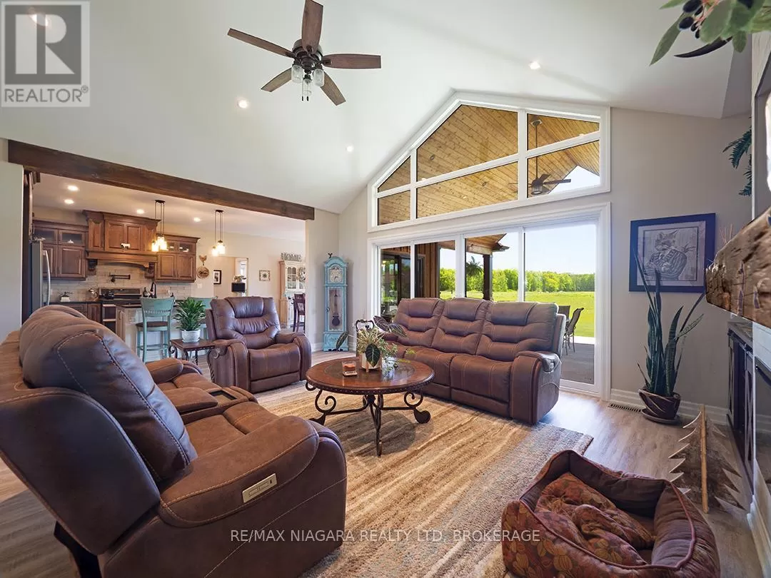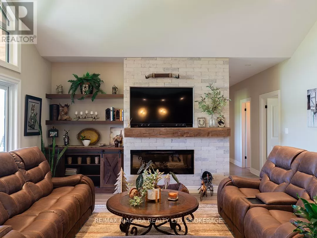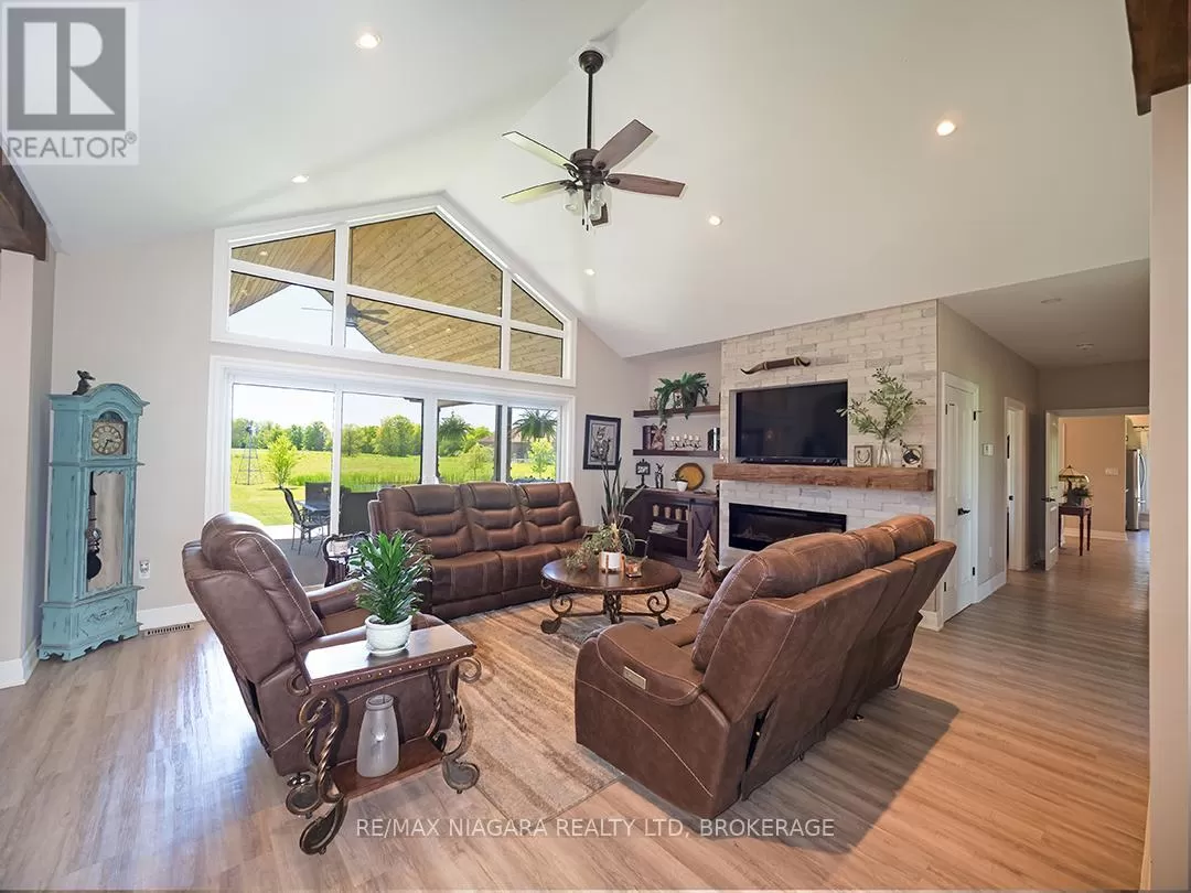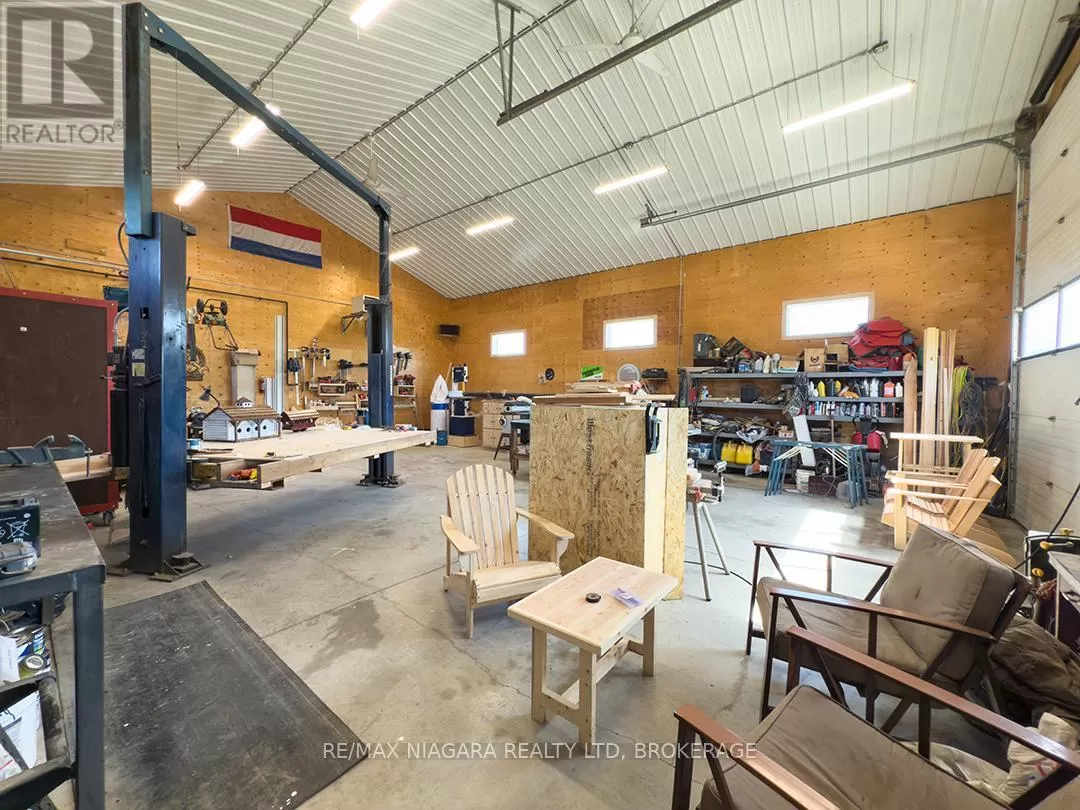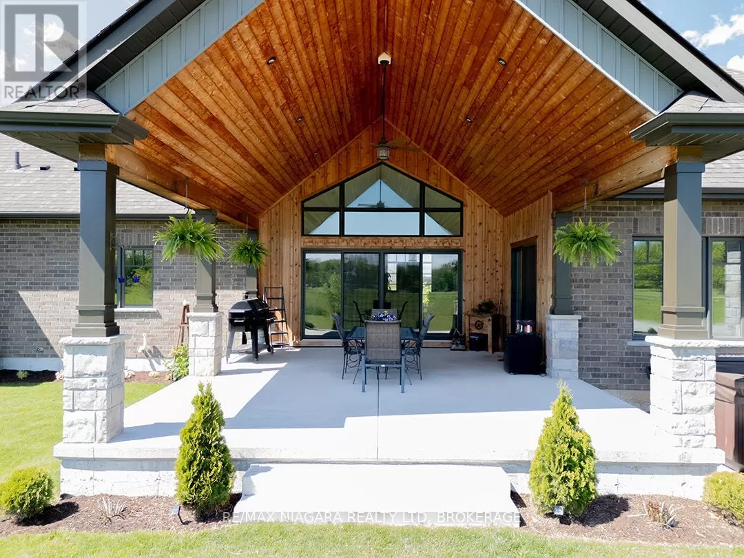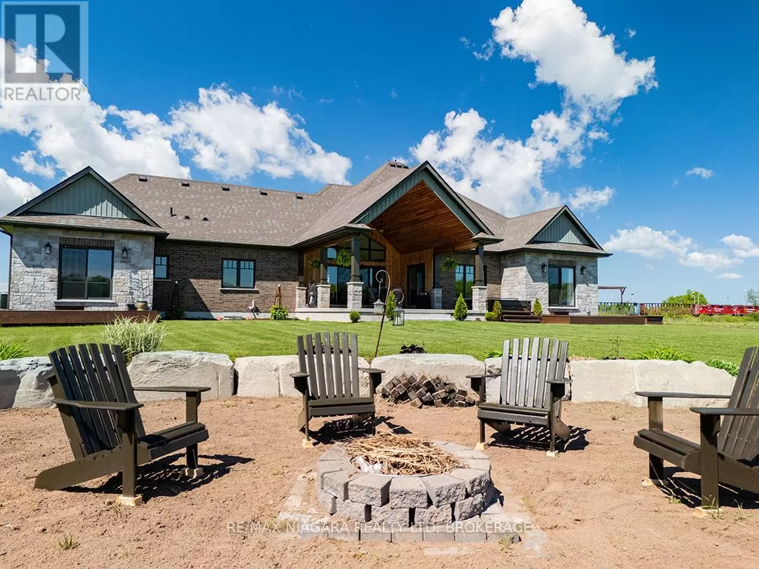 Cross Streets: Green Road. ** Directions: Phillps Road, south to Lambert, west to the home. Carefully designed, custom-built bungalow offering nearly 3,000 sqft of main floor living with 4 bedrooms, 3 bathrooms, and a full, unfinished basement on beautifully landscaped 2.11 Acre lot. A 32' x 40' detached garage/workshop that's fully outfitted with an auto hoist, compressor and airlines, overhead heater, concrete floor, and 200 Amp service is an added bonus! The home's layout was purposefully planned with two distinct living areas-an east wing & a west wing. The east wing features the primary suite, complete with a large walk-in closet, luxurious five-piece ensuite, and direct access to the backyard deck and hot tub. The west wing functions as a fully self-contained in-law suite with its own separate front entrance, spacious living room with kitchenette, bedroom with sliding doors to the backyard, laundry closet, and a three-piece bathroom with a zero-entry walk-in shower. At the heart of the home is an expansive open concept kitchen, dining, and living area that ties everything together. The Oakridge Premium kitchen is outfitted with granite counters and opens onto a bright dining room with sweeping backyard views. The living room is anchored by a stone fireplace and features vaulted ceilings with dramatic two-storey, floor-to-ceiling windows that lead out to a stunning covered pavilion designed to match the interior vaulted ceiling profile. An attached double garage leads into a large, bright laundry and mudroom with plenty of storage. Accessibility was top of mind in the home's design, with wide 36" doorways and 48" hallways throughout. Energy efficiency is another standout feature, with triple-pane windows, double-pane sliding doors, and on-demand hot water. The outdoor space is just as impressive, with extra parking, a landscaped sandy firepit area overlooking a serene pond with windmill aeration, and the kind of quiet country setting that's hard to find yet close to everything - offering central access to all points in Niagara, Haldimand, and Hamilt (id:27476)