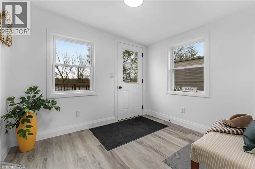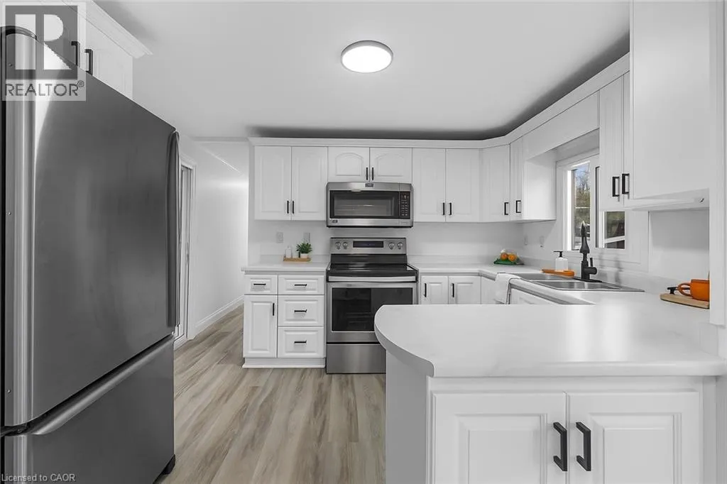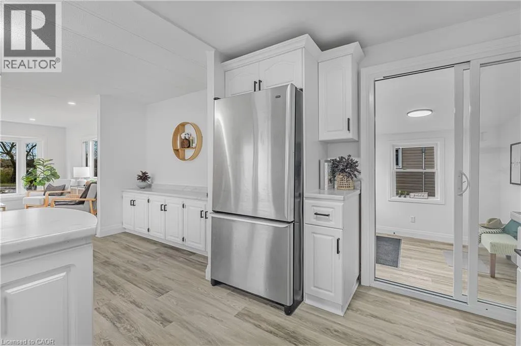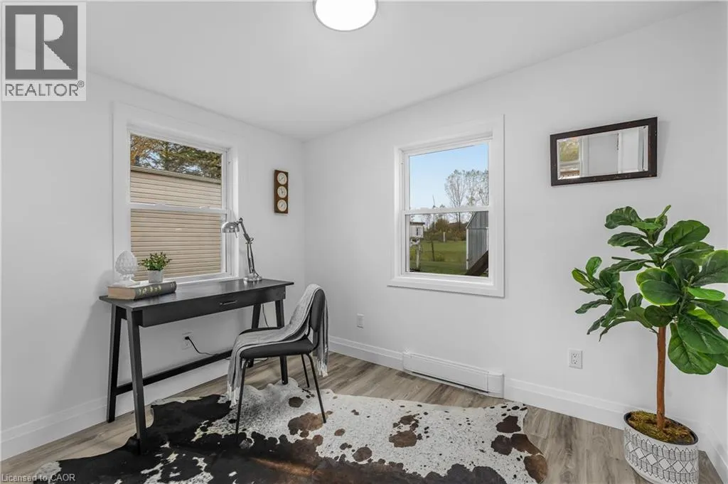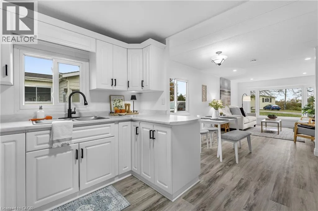 Wellandport Road to Highway 3 Welcome to Ellsworth Acres Mobile Home Community in Wainfleet! This beautifully updated mobile home has been extensively renovated and is move-in ready. The spacious, modern kitchen boasts stainless steel appliances, stylish flooring, new drywall with vapor barrier, and sleek pot lighting. The open-concept kitchen, living, and dining area is bright and inviting, featuring large vinyl/thermal windows and a charming coffee bar. The home includes two bedrooms plus a generous officeâperfect for hosting guests or working from home. The fully updated bathroom features a brand-new walk-in shower, ideal for those with mobility needs. Additional improvements include new PEX water lines, doors, trim, and a brand-new deck for outdoor enjoyment. With parking for two vehicles and a 10' x 10' storage shed, this move-in-ready home checks all the boxes. Monthly fees cover land lease, property taxes, garbage and snow removal, water, and septic services. Ideally situated just a short drive from Dunnville, Welland, and Smithville, this home offers the perfect blend of modern comfort and small-town charm. Note: some photos have been virtually staged. (id:27476)