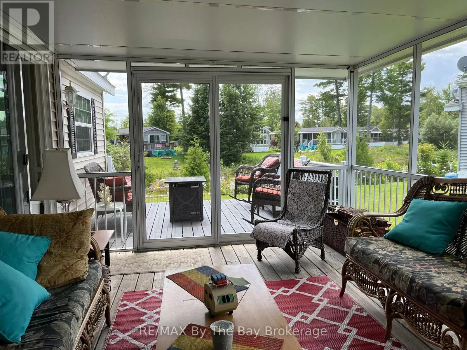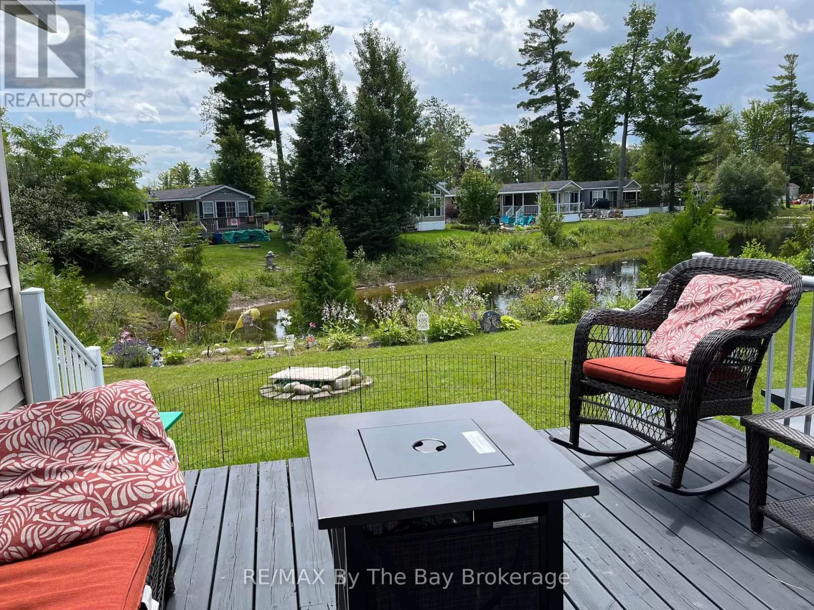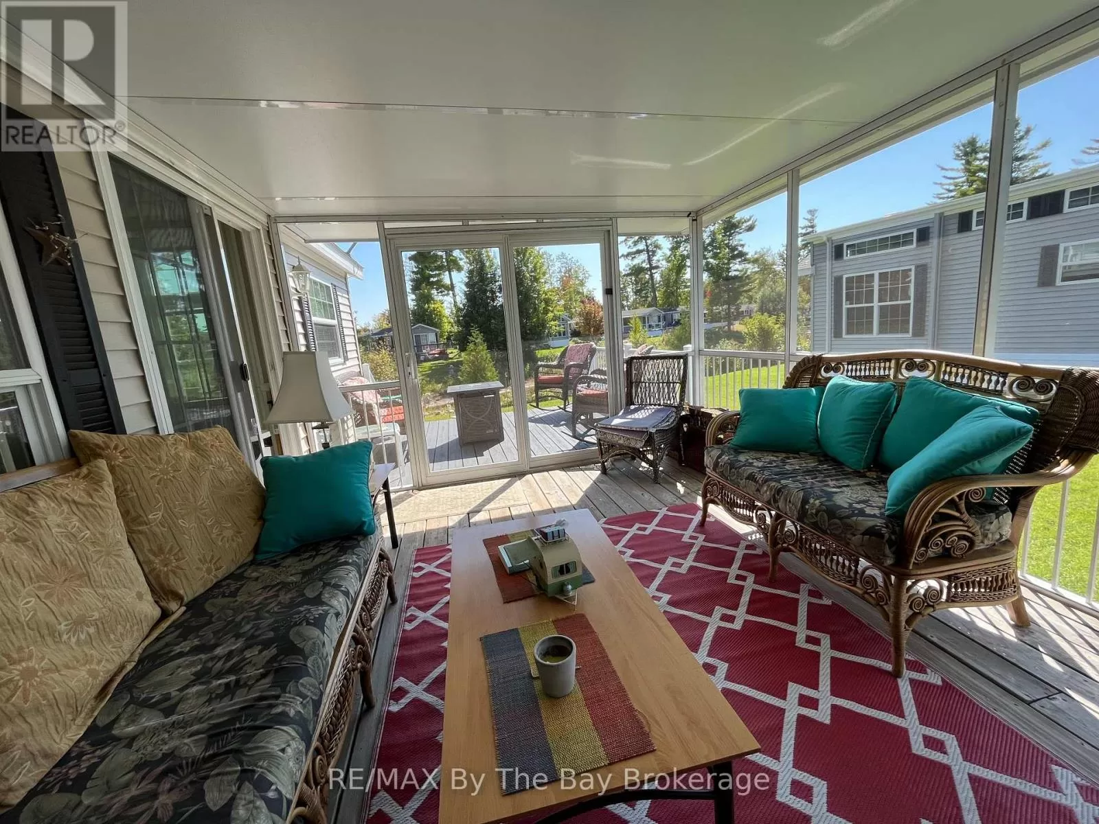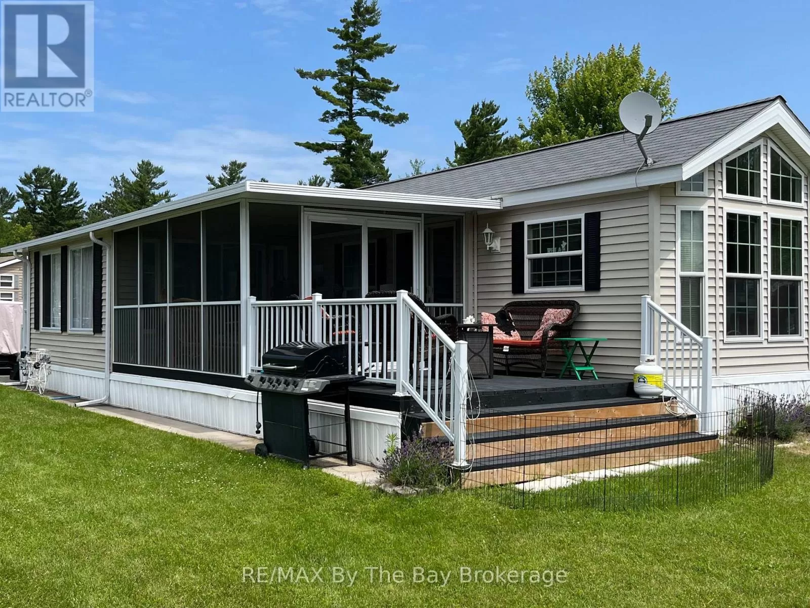 Theme Park Drive-River Road West Golf cart included! Embrace the charm of a seasonal retreat in the coveted Countrylife Resort, where tranquility meets recreation from end of April to mid November. Nestled on a premium waterfront lot, this 2011 Woodland Park Muskoka Model exudes a cozy allure. Boasting 2 bedrooms and 1 bathroom, along with two sunrooms, there's ample space to host family and friends. Step outside to a spacious deck, complete with a separate 15x11 screen room, all offering picturesque water views. With paved parking for two cars, convenience is at your fingertips, and a brief stroll leads you to the sandy shores. Enjoy modern comforts with central A/C, natural gas heat, and municipal water and sewer, ensuring minimal upkeep. This cottage is poised for your family's enjoyment. The resort itself offers an array of amenities including pools, a splash pad, clubhouse, tennis court, playgrounds, and mini golf, ensuring endless entertainment. Rest easy in this gated community with seasonal security. Meticulously maintained, this unit is a must-see. Secure your spot in this idyllic retreat with seasonal site fees for 2025 priced at $7,610. Don't miss the chance to create cherished memories in this welcoming lakeside haven. (id:27476)