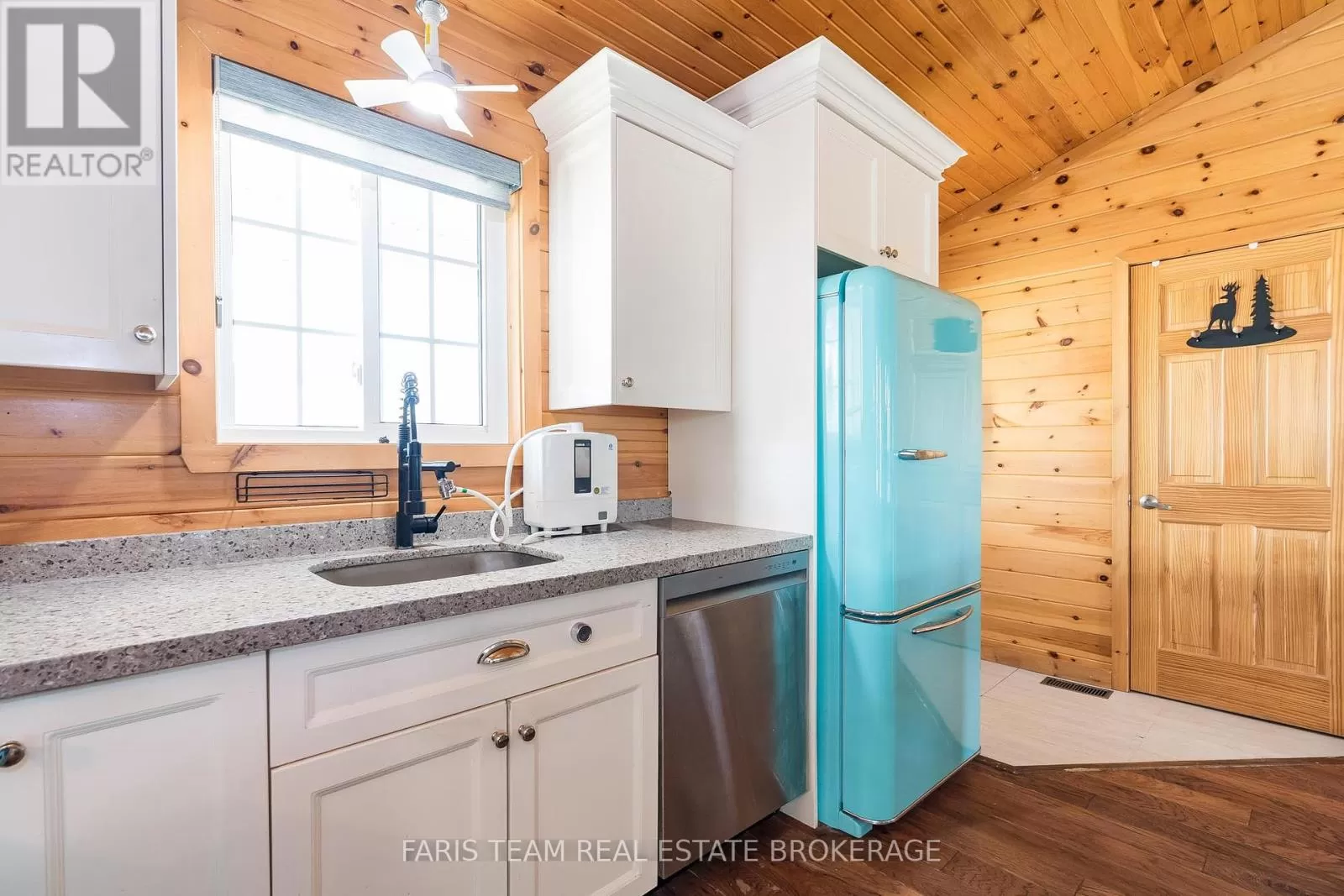Temagami Trl/Awenda Ave Top 5 Reasons You Will Love This Home: 1) Welcome to life in the gated community of CountryLife Resort, where every day feels like a getaway, residents enjoy an impressive array of amenities, including indoor and outdoor pools, a recreation centre, splash pad, bouncing pad, tennis and pickleball courts, mini golf, and a private walking trail leading straight to the sandy shores of Wasaga Beach 2) This charming chalet offers easy main level living with two bedrooms and a full bathroom, along with an open-concept kitchen and living area highlighted by cathedral ceilings and a cozy gas fireplace, while the bright four-season sunroom walks out to a wraparound deck overlooking a tranquil pond 3) The beautifully finished kitchen makes meal prep a delight, featuring granite countertops, a central island perfect for casual meals, a new dishwasher, and eye-catching Tropical Blue Elmira Stove Works appliances that add timeless character and charm 4) Start the day with coffee on the covered front porch and wind down on the spacious back deck, taking in peaceful pond views and the beauty of the surrounding nature, with the added benefit of a newly installed outdoor shower adding a touch of luxury and convenience, perfect for rinsing off after a beach day or cooling down on warm summer afternoons 5) Whether you're seeking a vacation home or retirement retreat, this location offers it all, close to grocery stores, cafés, and shops, with Collingwood, Blue Mountain, and the GTA just a short drive away. 890 fin.sq.ft. (id:27476)