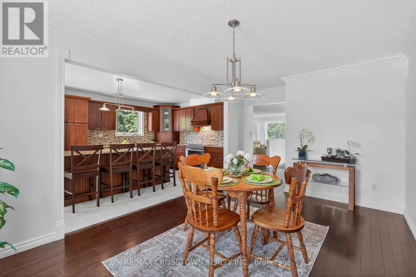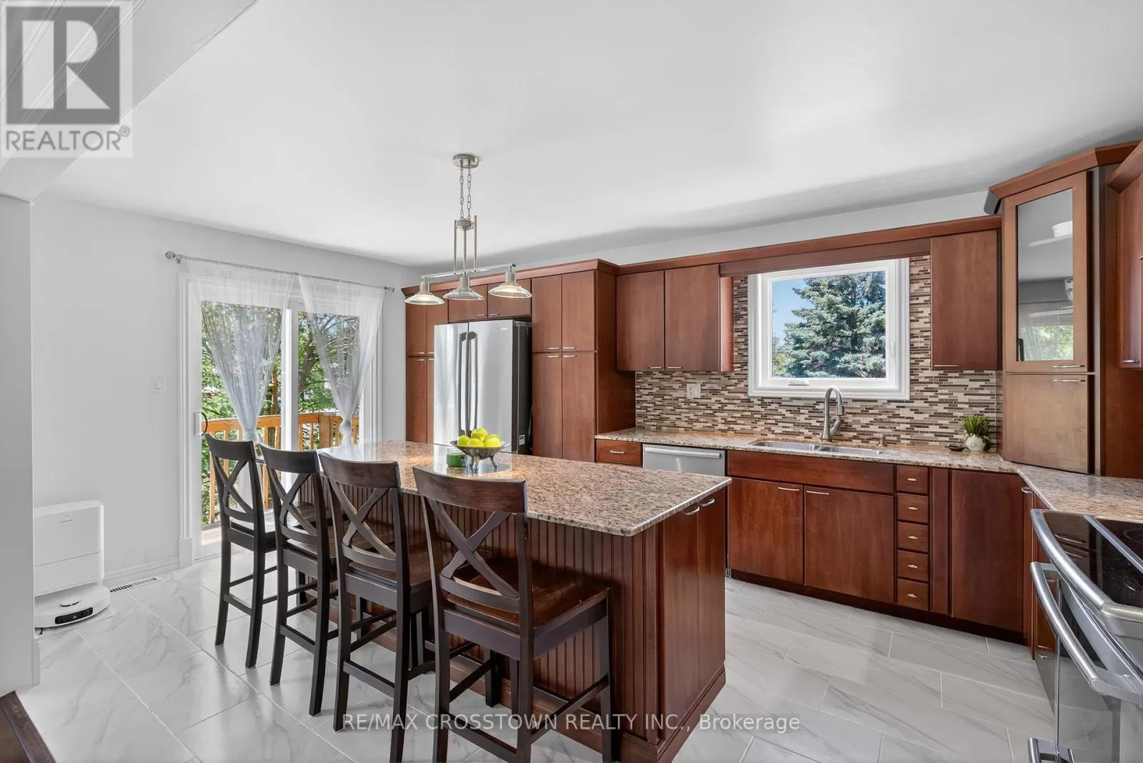 Cross Streets: River Rd to Blueberry Trail to Caribou to Birchmount. ** Directions: River Road to Blueberry Trail to Caribou to Birchmount. Renovated Raised Bungalow Move-In Ready!Welcome to this beautifully updated raised bungalow offering the perfect blend of comfort and modern style. Step inside to find a bright, open-concept layout featuring a large eat-in kitchen with granite countertops, stainless steel appliances, and abundant pantry space, plus a walk-out to the deck and backyard ideal for entertaining and family gatherings. A separate dining room and a spacious family room with a cozy gas fireplace complete the main living area.The main floor boasts hardwood floors, three generous bedrooms, including a primary suite with a walk-in closet. The finished basement offers incredible living space with three additional bedrooms, a 3-piece bathroom, a laundry room, and a large family room. With no carpet throughout, this home is perfect for easy maintenance and a clean, modern feel. Additional highlights include large windows bringing in natural light, plenty of storage, central vacuum, and central air. Major components such as roof, windows and furnace, are less than 10 years old, giving you peace of mind for years to come. Fully insulated and heated garage perfect for hobbies or Mechanic. (id:27476)