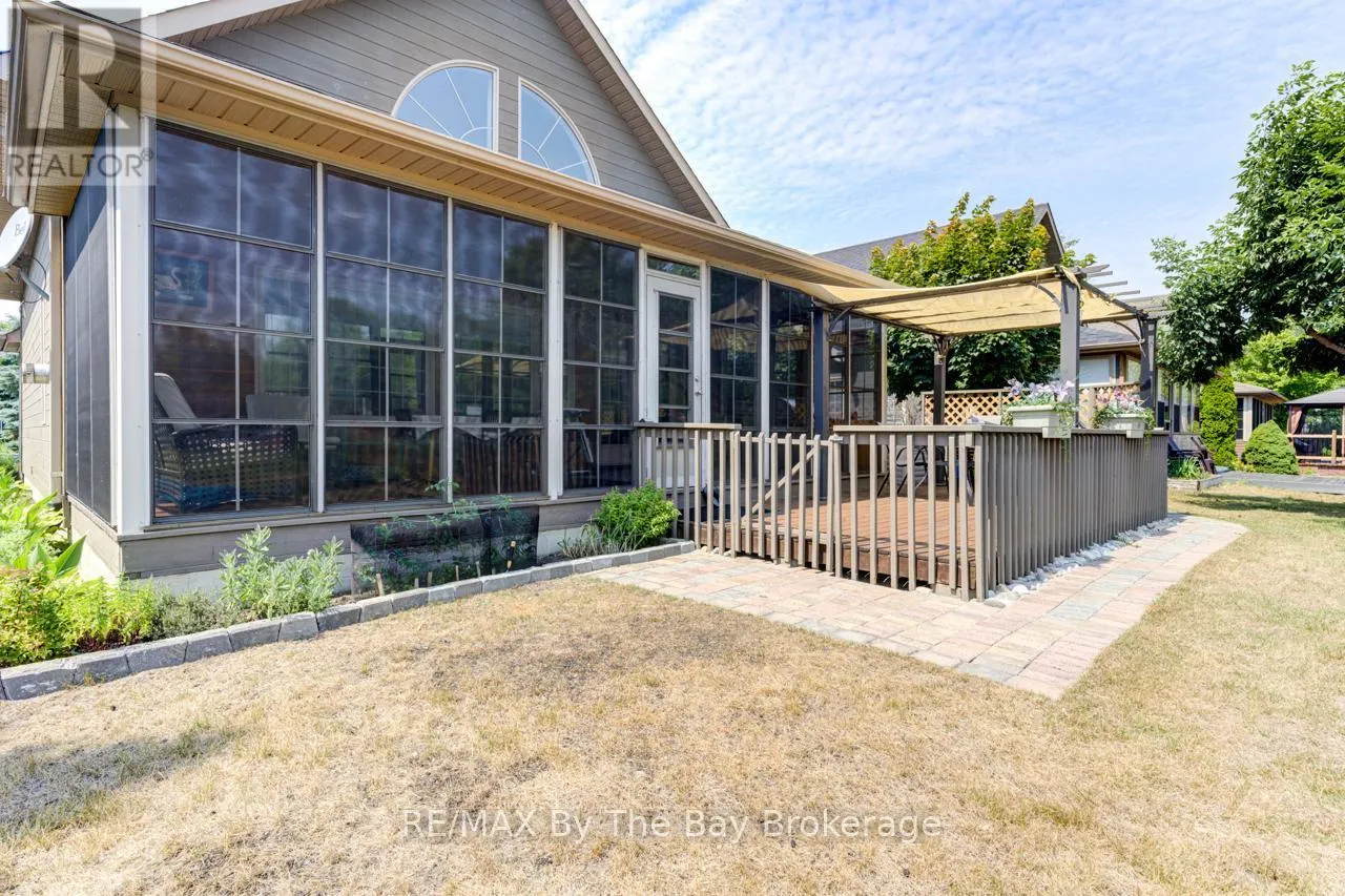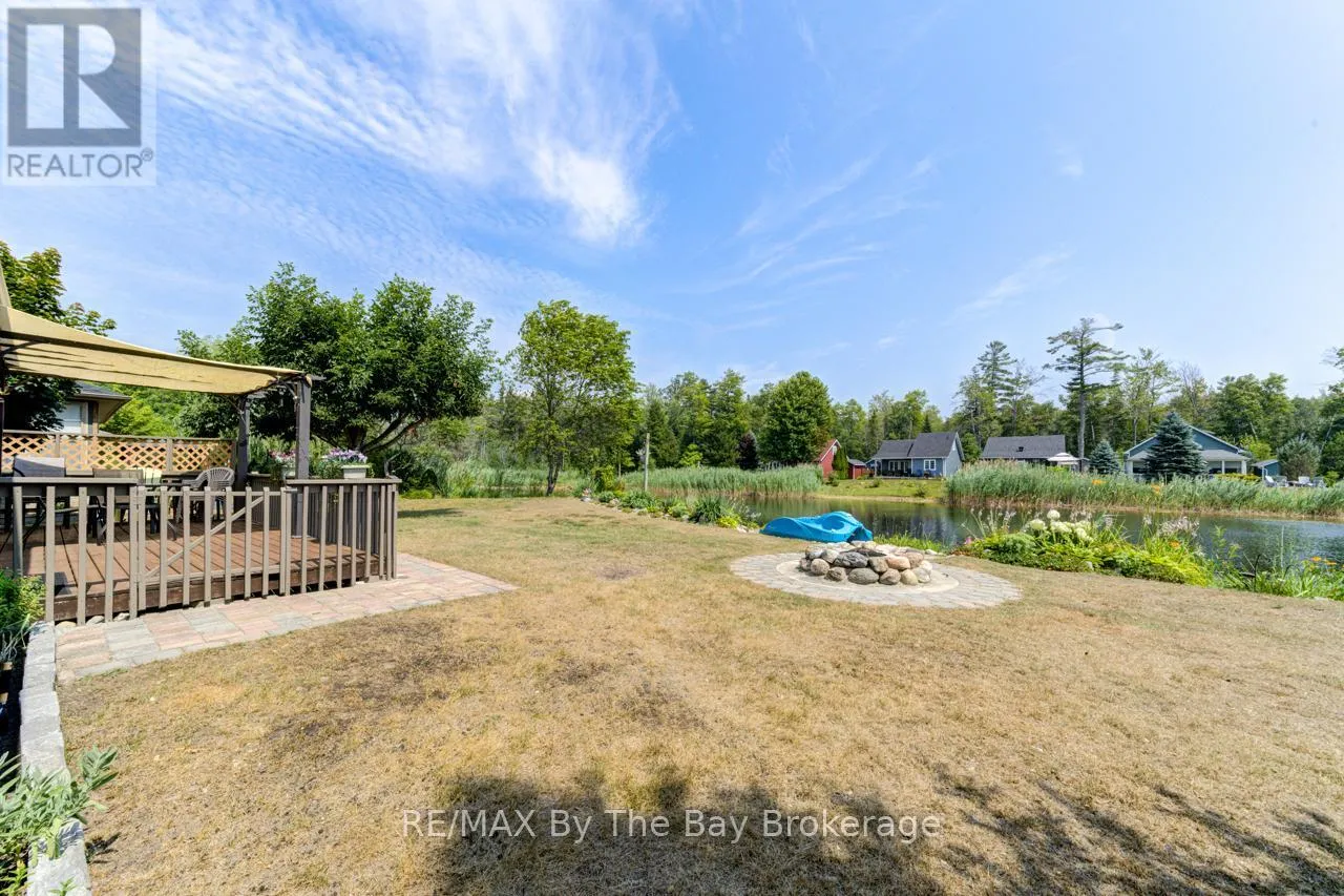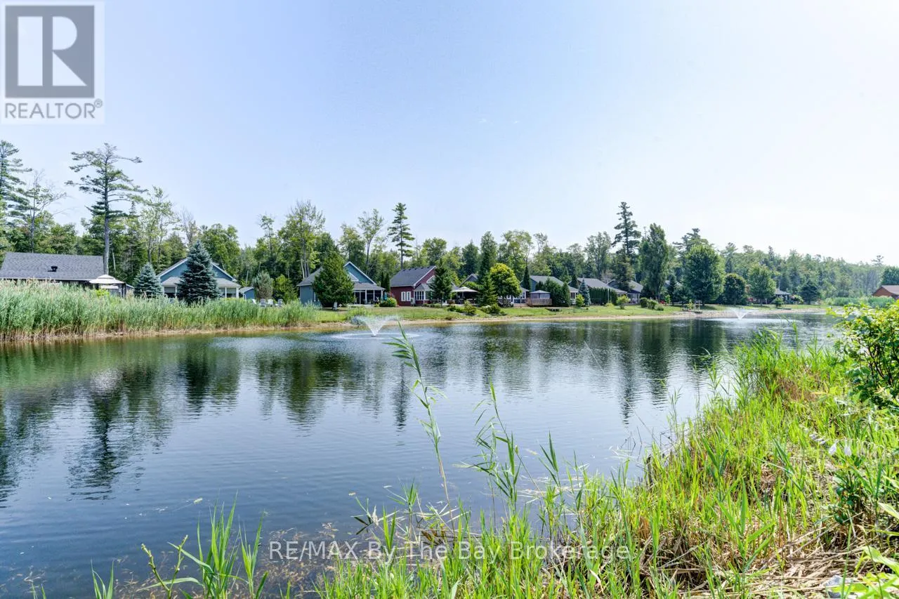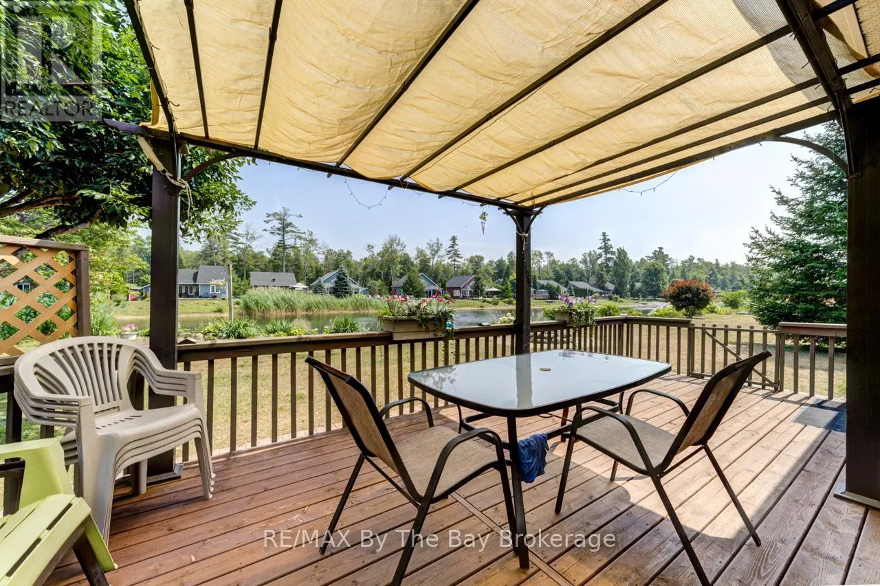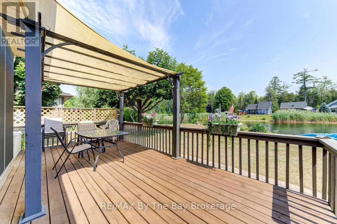 Theme Park Drive to Madawaska Trail Quite possibly one of the finest 'Muskoka' Models you'll find in the sought-after, gated family community of Wasaga CountryLife. This beautifully updated 1.5-storey, four-season wood chalet offers 1,635 sq/ft, including bonus sunroom with 278 sq/ft of luxurious living space backing onto scenic Lake Wasaga, providing peaceful water views. Located just a short walk to the shores of Georgian Bay, this 3-bedroom, 2-bathroom retreat features vaulted tongue-and-groove pine ceilings and an open-concept kitchen, dining, and living area anchored by a cozy gas fireplace. Enjoy the spacious 10' x 27' sunroom and adjoining sun deck both perfect for relaxing or entertaining while overlooking the pond. Tastefully updated since its original 2006 build, this home includes newer appliances (including an induction stove with double oven), wood laminate flooring, central air, a paved driveway, and extensive landscaping. As part of the resort community, residents have access to a wide range of amenities including indoor and outdoor pools, a splash pad, pickleball and tennis courts, a sandy beach area, and play grounds all nestled in a beautifully treed, secure setting. (id:27476)