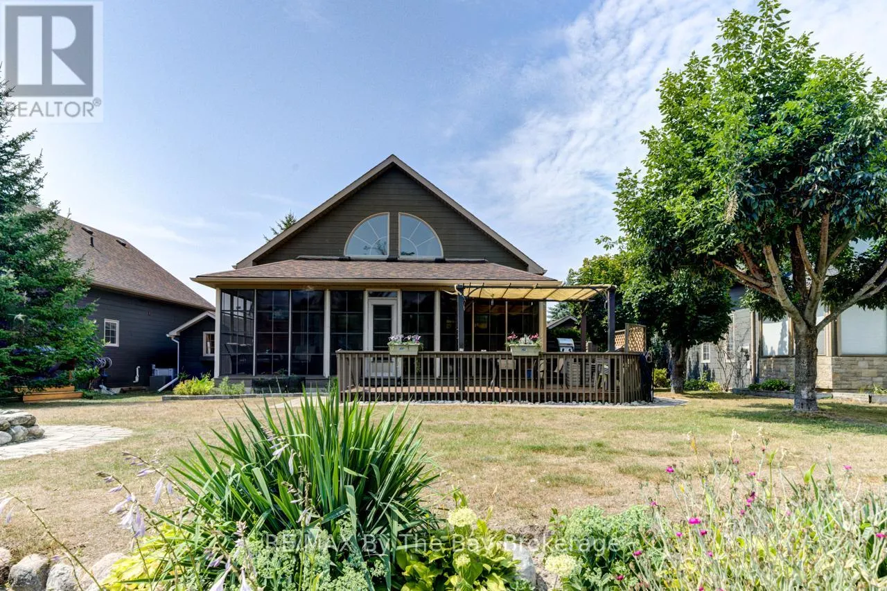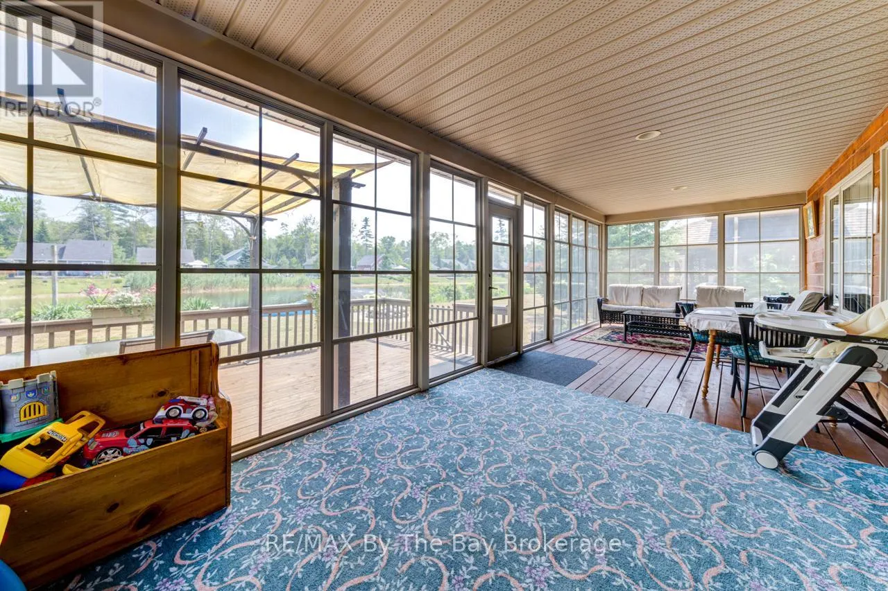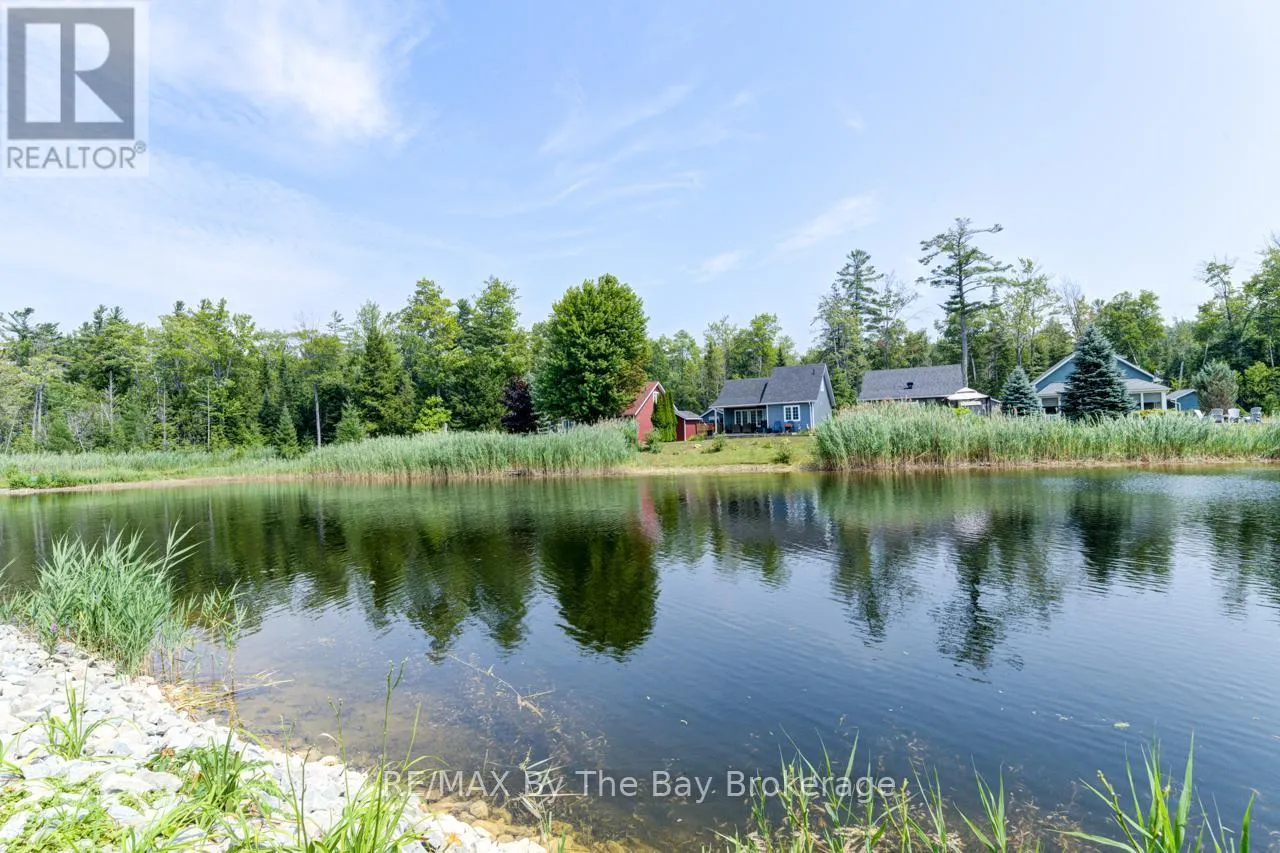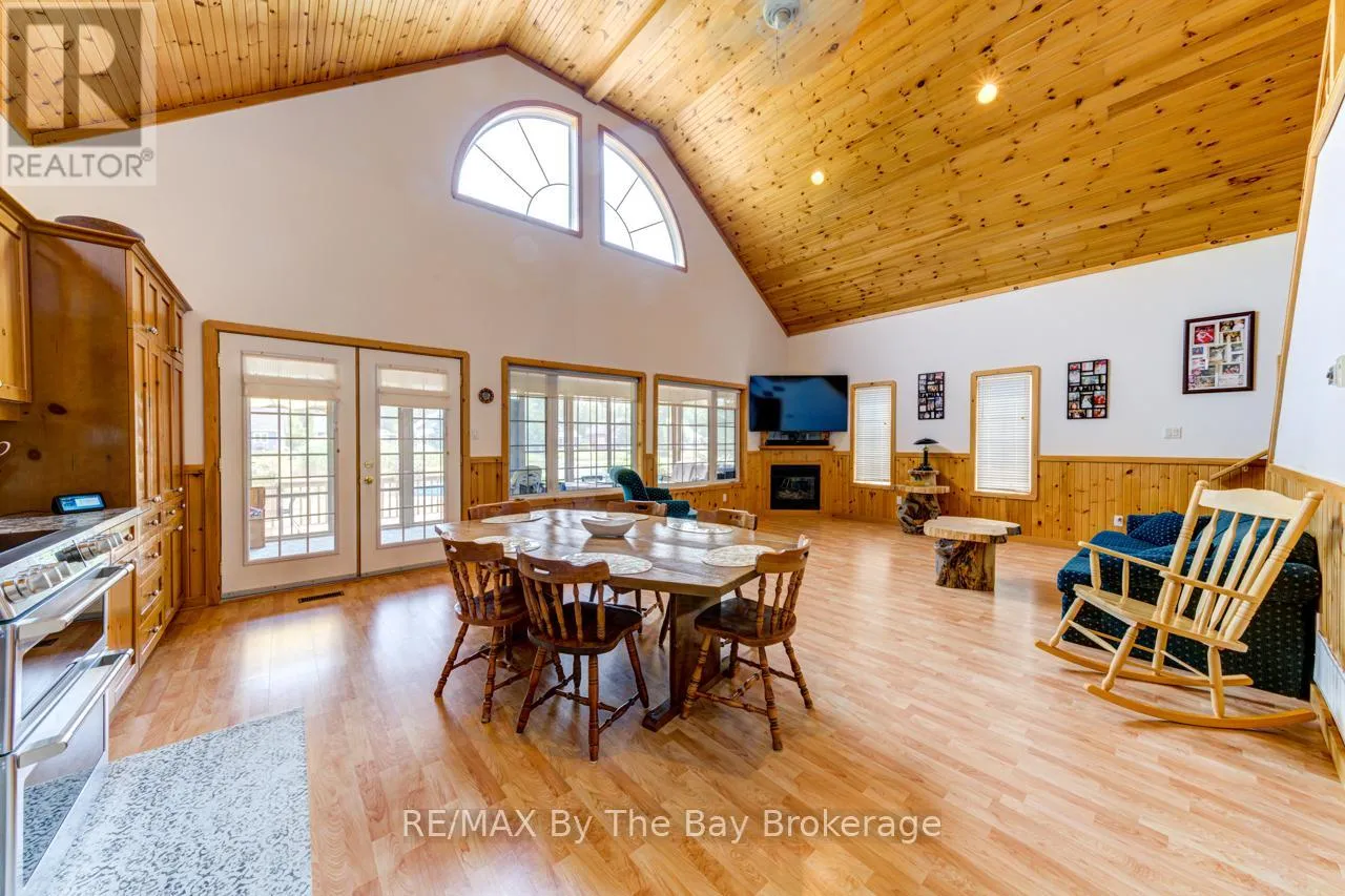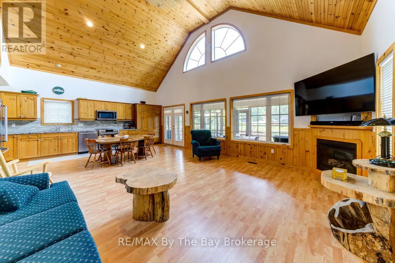 Theme Park Drive to Madawaska Trail Quite possibly one of the finest 'Muskoka' Models you'll find in the sought-after, gated family community of Wasaga CountryLife. This beautifully updated 1.5-storey, four-season wood chalet offers 1,635 sq/ft, including bonus sunroom with 278 sq/ft of luxurious living space backing onto scenic Lake Wasaga, providing peaceful water views. Located just a short walk to the shores of Georgian Bay, this 3-bedroom, 2-bathroom retreat features vaulted tongue-and-groove pine ceilings and an open-concept kitchen, dining, and living area anchored by a cozy gas fireplace. Enjoy the spacious 10' x 27' sunroom and adjoining sun deck both perfect for relaxing or entertaining while overlooking the pond. Tastefully updated since its original 2006 build, this home includes newer appliances (including an induction stove with double oven), wood laminate flooring, central air, a paved driveway, and extensive landscaping. As part of the resort community, residents have access to a wide range of amenities including indoor and outdoor pools, a splash pad, pickleball and tennis courts, a sandy beach area, and play grounds all nestled in a beautifully treed, secure setting. (id:27476)