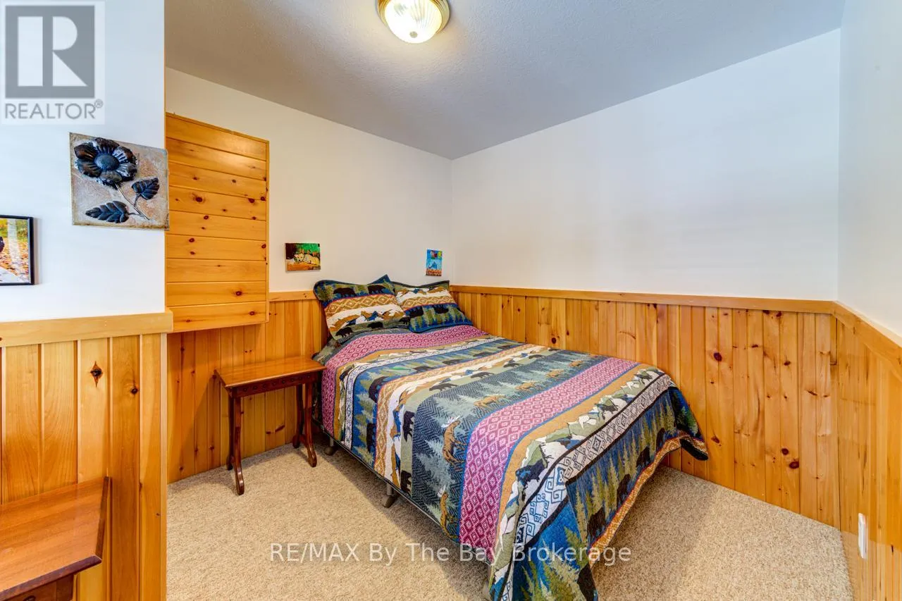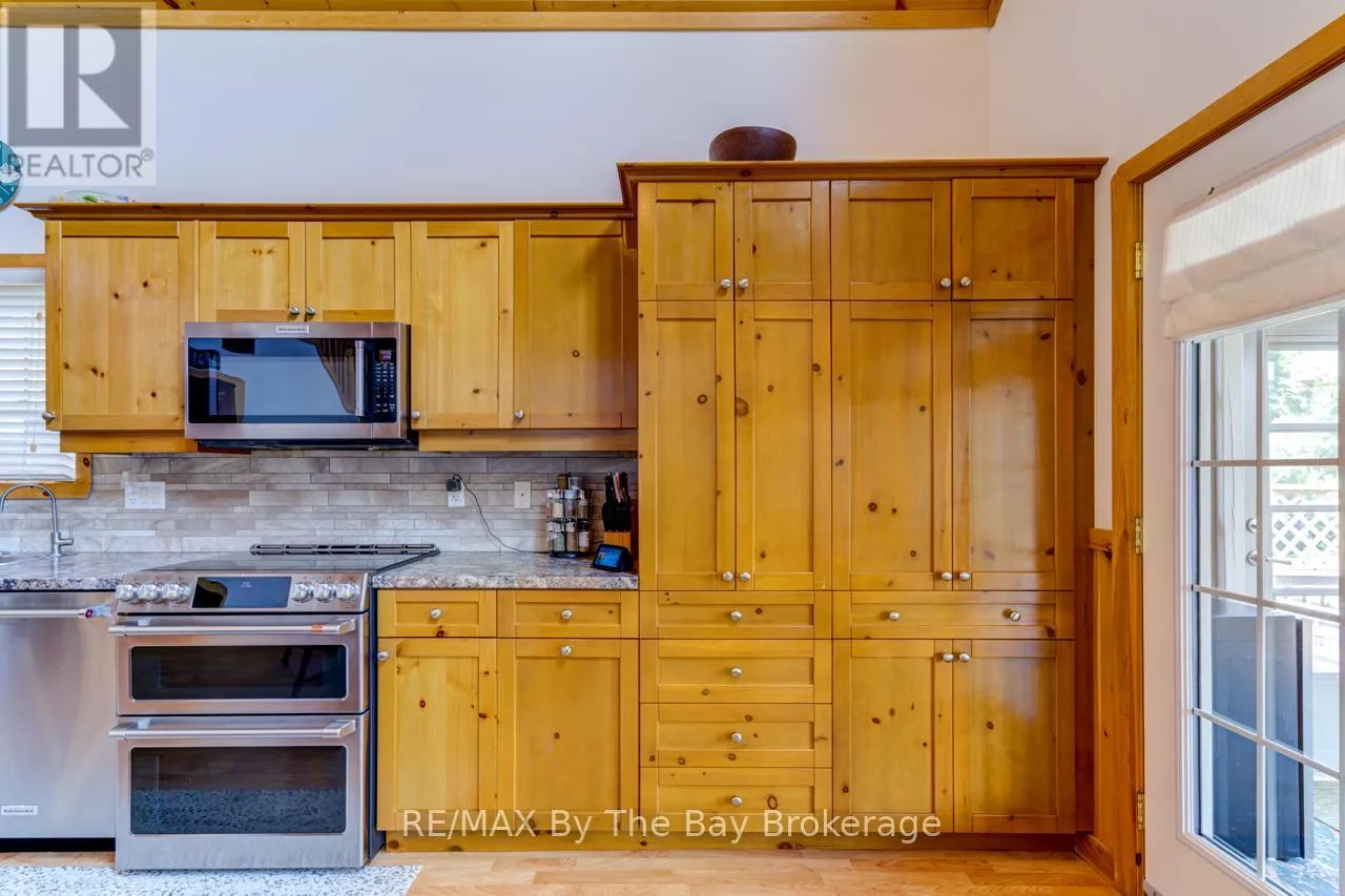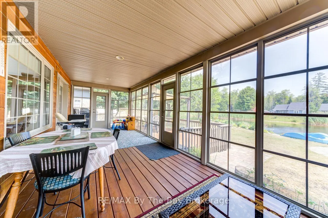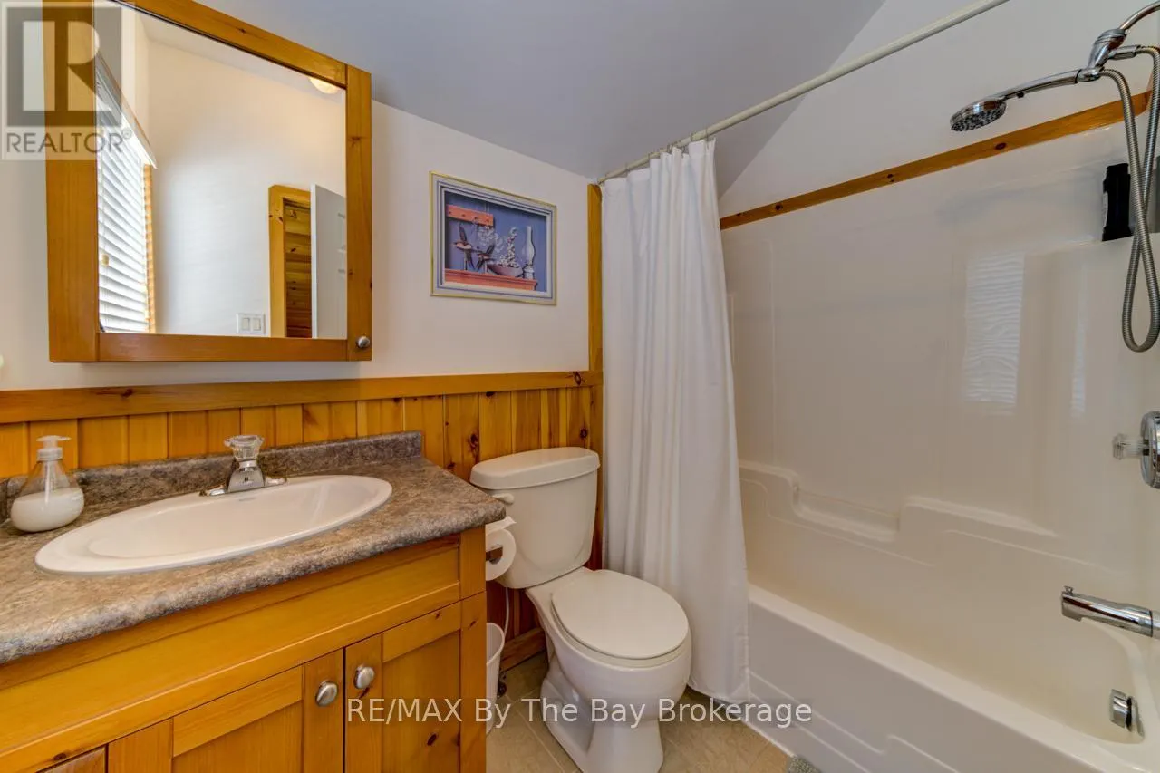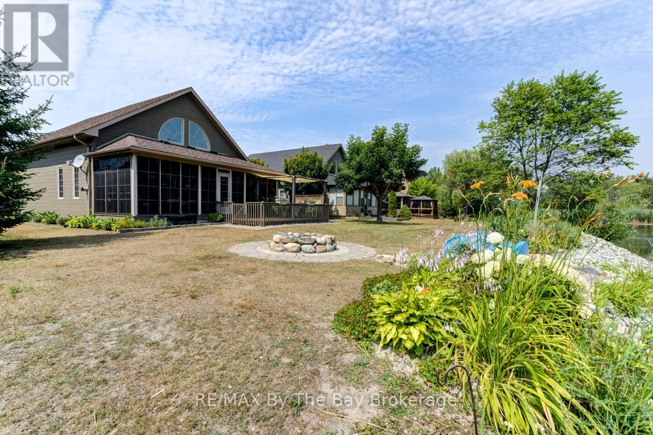 Theme Park Drive to Madawaska Trail Quite possibly one of the finest 'Muskoka' Models you'll find in the sought-after, gated family community of Wasaga CountryLife. This beautifully updated 1.5-storey, four-season wood chalet offers 1,635 sq/ft, including bonus sunroom with 278 sq/ft of luxurious living space backing onto scenic Lake Wasaga, providing peaceful water views. Located just a short walk to the shores of Georgian Bay, this 3-bedroom, 2-bathroom retreat features vaulted tongue-and-groove pine ceilings and an open-concept kitchen, dining, and living area anchored by a cozy gas fireplace. Enjoy the spacious 10' x 27' sunroom and adjoining sun deck both perfect for relaxing or entertaining while overlooking the pond. Tastefully updated since its original 2006 build, this home includes newer appliances (including an induction stove with double oven), wood laminate flooring, central air, a paved driveway, and extensive landscaping. As part of the resort community, residents have access to a wide range of amenities including indoor and outdoor pools, a splash pad, pickleball and tennis courts, a sandy beach area, and play grounds all nestled in a beautifully treed, secure setting. (id:27476)