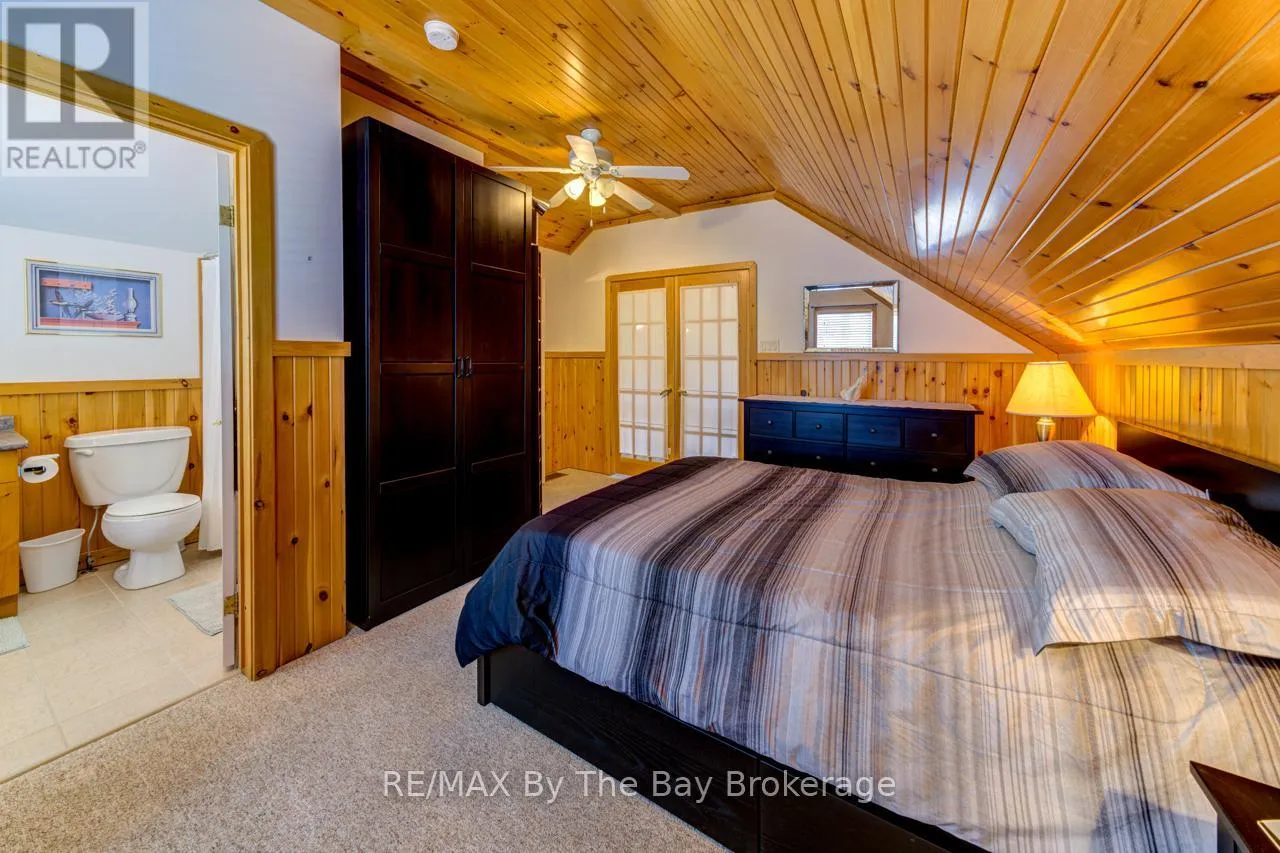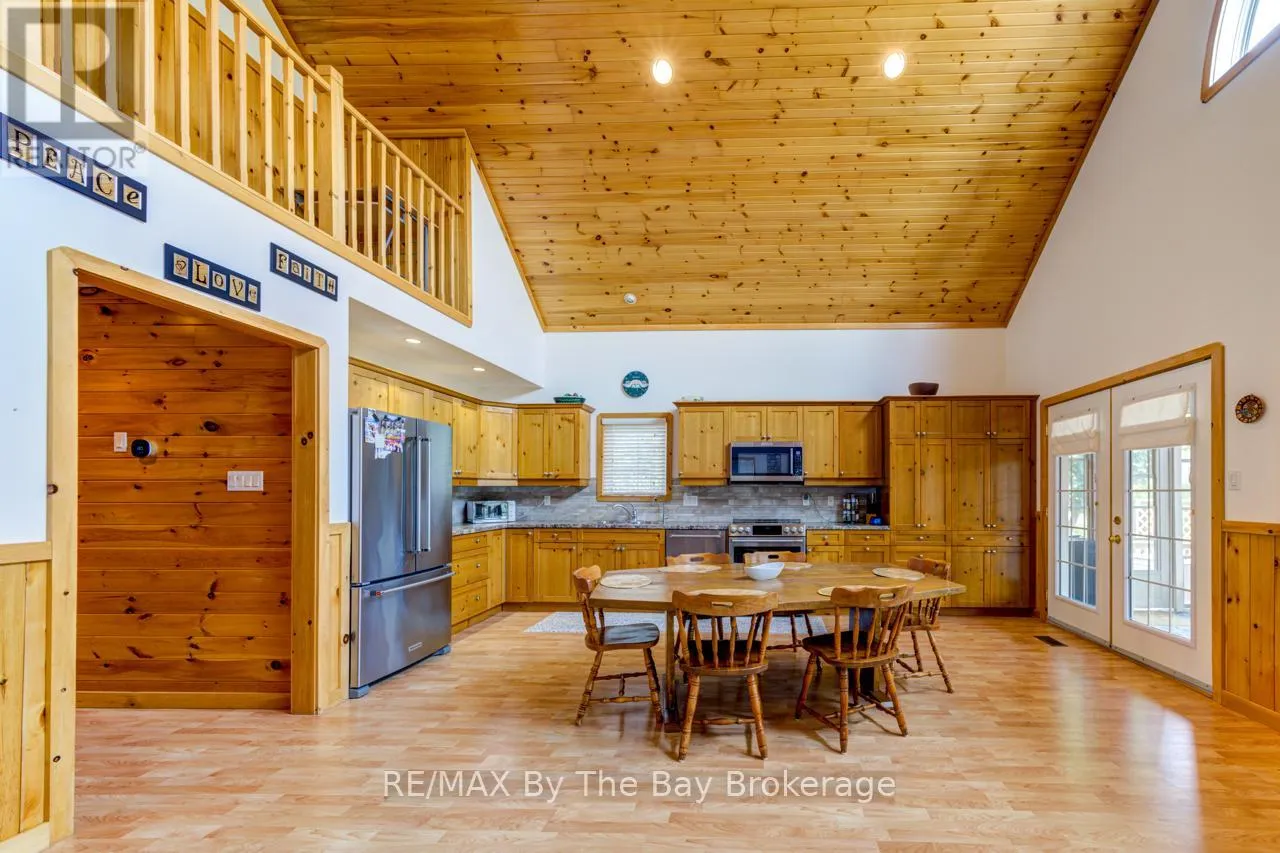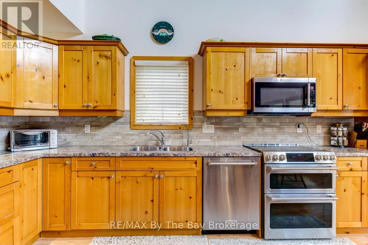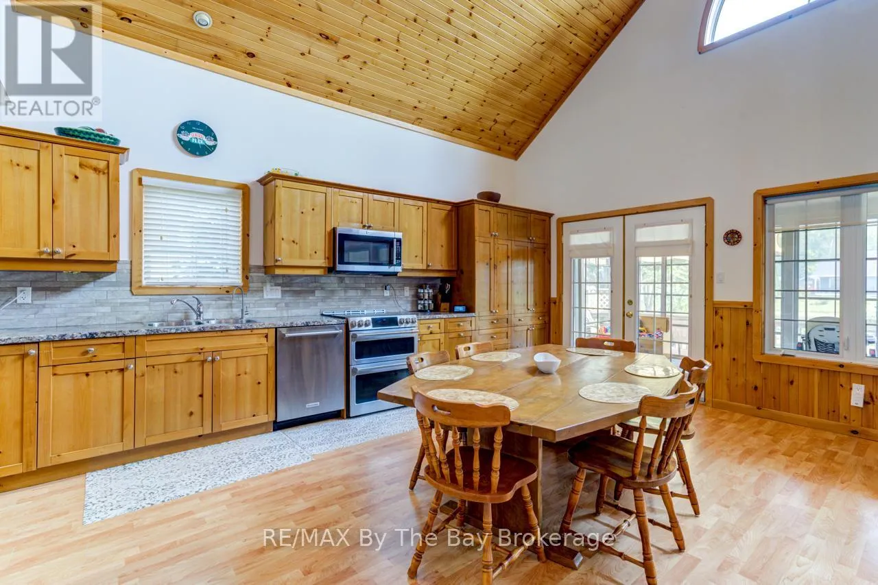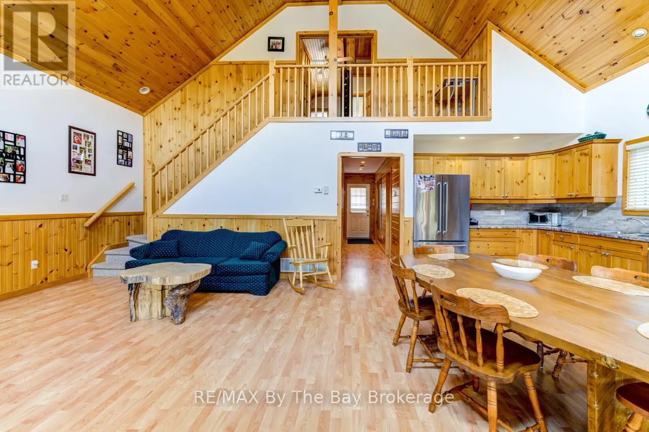 Theme Park Drive to Madawaska Trail Quite possibly one of the finest 'Muskoka' Models you'll find in the sought-after, gated family community of Wasaga CountryLife. This beautifully updated 1.5-storey, four-season wood chalet offers 1,635 sq/ft, including bonus sunroom with 278 sq/ft of luxurious living space backing onto scenic Lake Wasaga, providing peaceful water views. Located just a short walk to the shores of Georgian Bay, this 3-bedroom, 2-bathroom retreat features vaulted tongue-and-groove pine ceilings and an open-concept kitchen, dining, and living area anchored by a cozy gas fireplace. Enjoy the spacious 10' x 27' sunroom and adjoining sun deck both perfect for relaxing or entertaining while overlooking the pond. Tastefully updated since its original 2006 build, this home includes newer appliances (including an induction stove with double oven), wood laminate flooring, central air, a paved driveway, and extensive landscaping. As part of the resort community, residents have access to a wide range of amenities including indoor and outdoor pools, a splash pad, pickleball and tennis courts, a sandy beach area, and play grounds all nestled in a beautifully treed, secure setting. (id:27476)