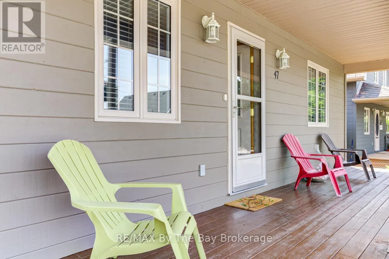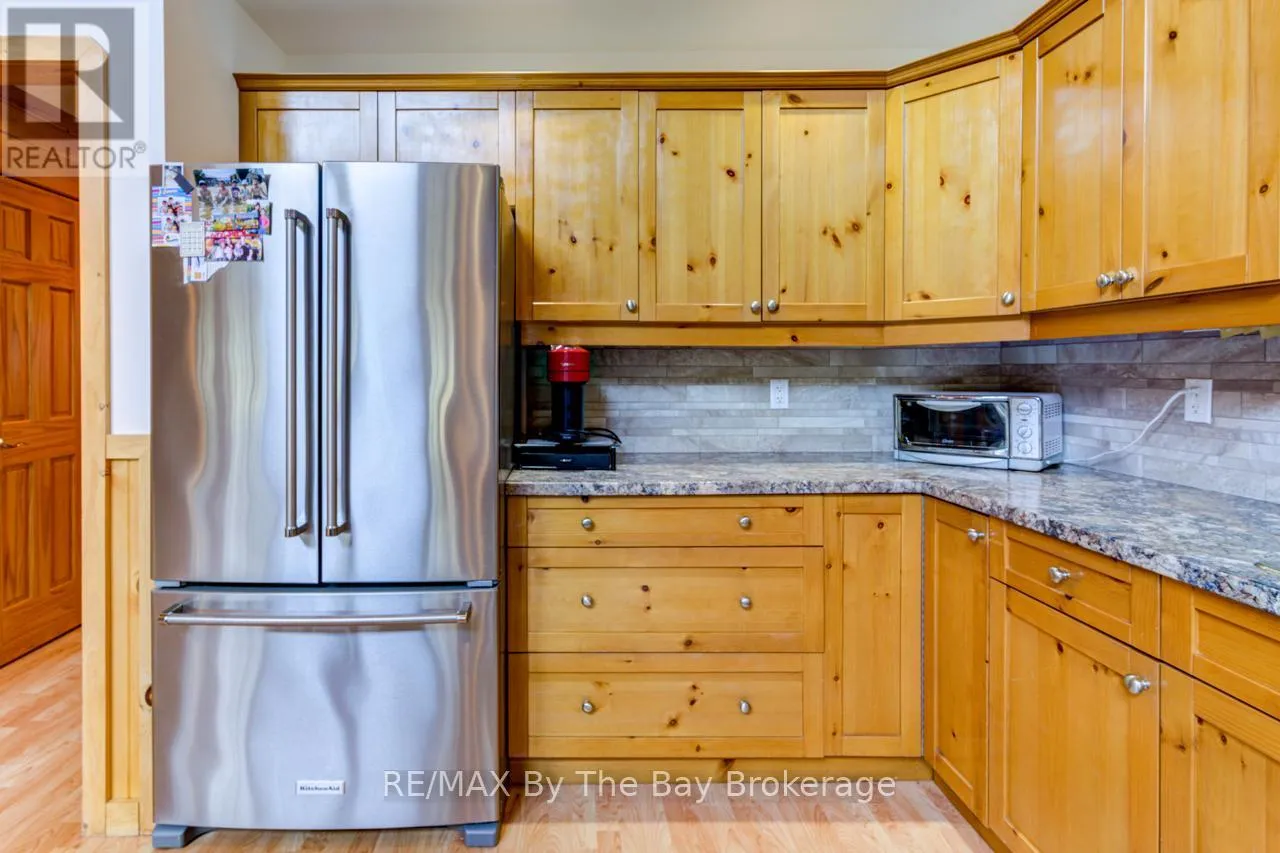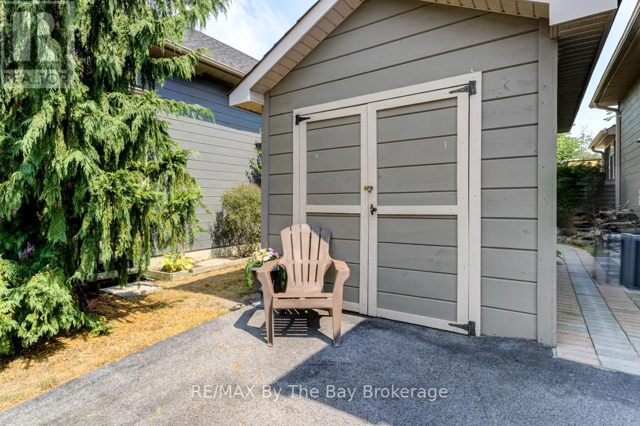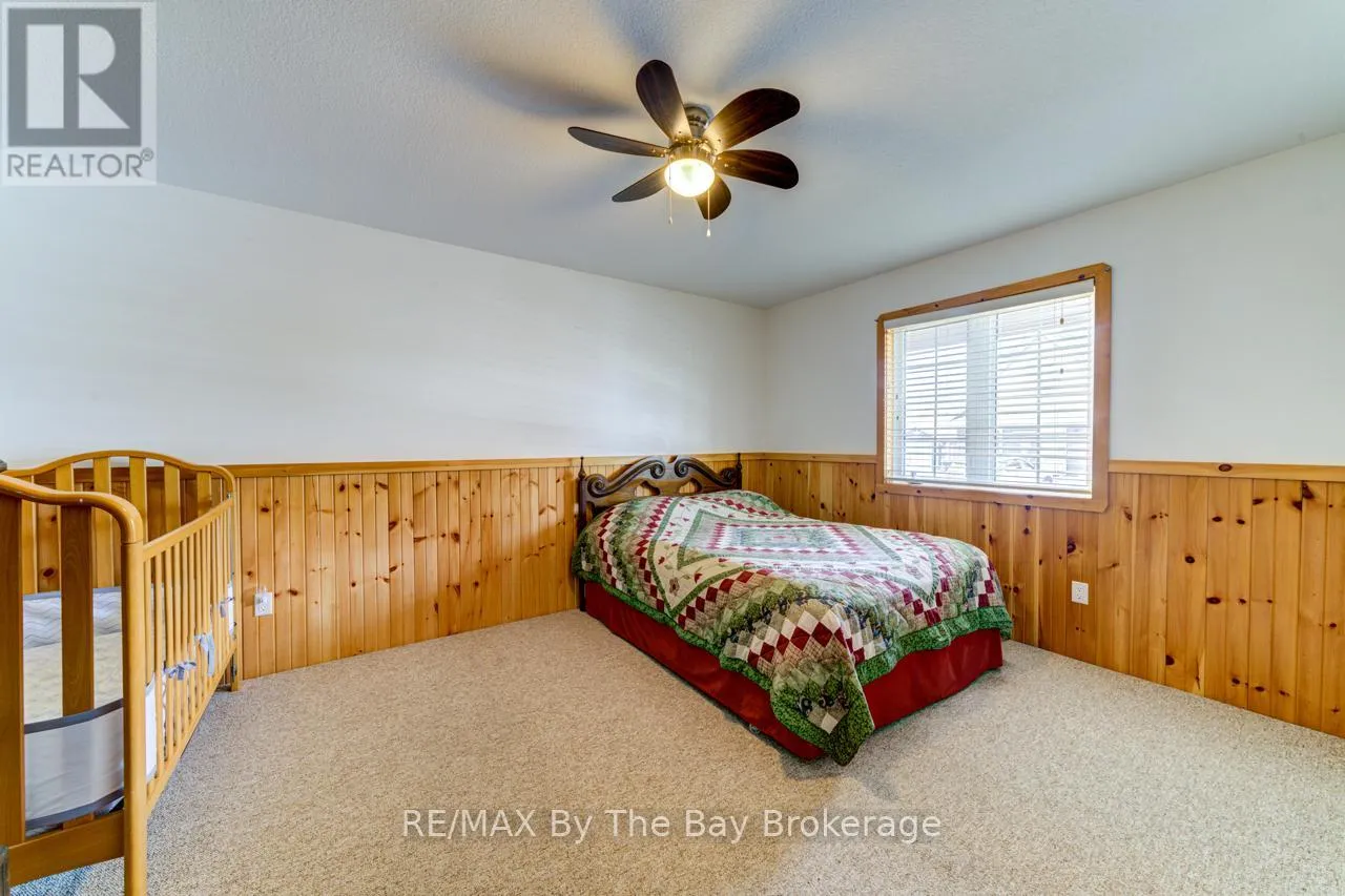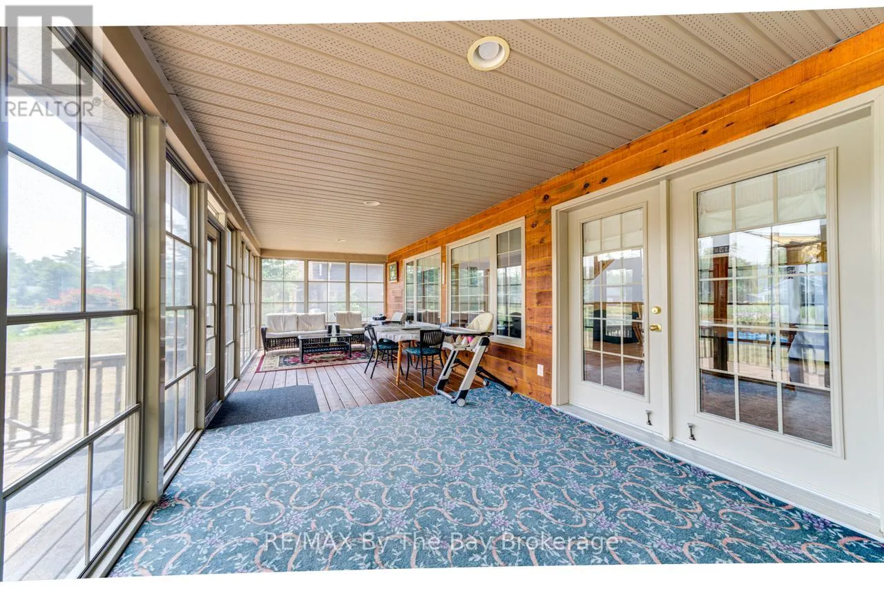 Theme Park Drive to Madawaska Trail Quite possibly one of the finest 'Muskoka' Models you'll find in the sought-after, gated family community of Wasaga CountryLife. This beautifully updated 1.5-storey, four-season wood chalet offers 1,635 sq/ft, including bonus sunroom with 278 sq/ft of luxurious living space backing onto scenic Lake Wasaga, providing peaceful water views. Located just a short walk to the shores of Georgian Bay, this 3-bedroom, 2-bathroom retreat features vaulted tongue-and-groove pine ceilings and an open-concept kitchen, dining, and living area anchored by a cozy gas fireplace. Enjoy the spacious 10' x 27' sunroom and adjoining sun deck both perfect for relaxing or entertaining while overlooking the pond. Tastefully updated since its original 2006 build, this home includes newer appliances (including an induction stove with double oven), wood laminate flooring, central air, a paved driveway, and extensive landscaping. As part of the resort community, residents have access to a wide range of amenities including indoor and outdoor pools, a splash pad, pickleball and tennis courts, a sandy beach area, and play grounds all nestled in a beautifully treed, secure setting. (id:27476)