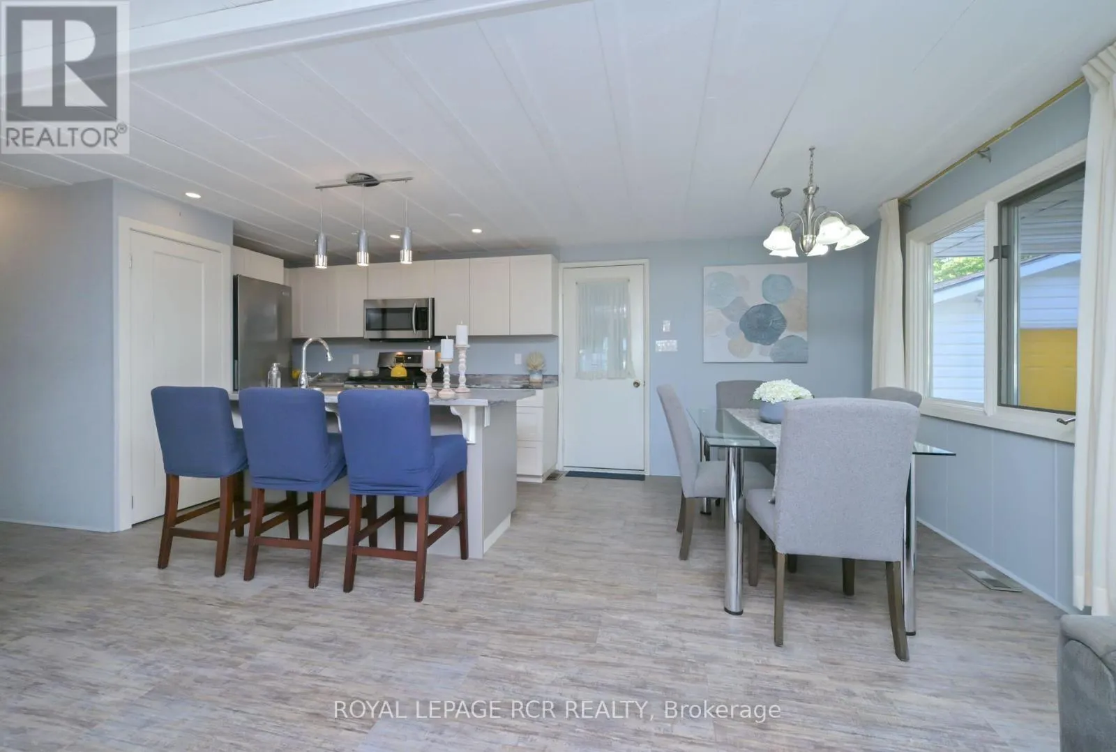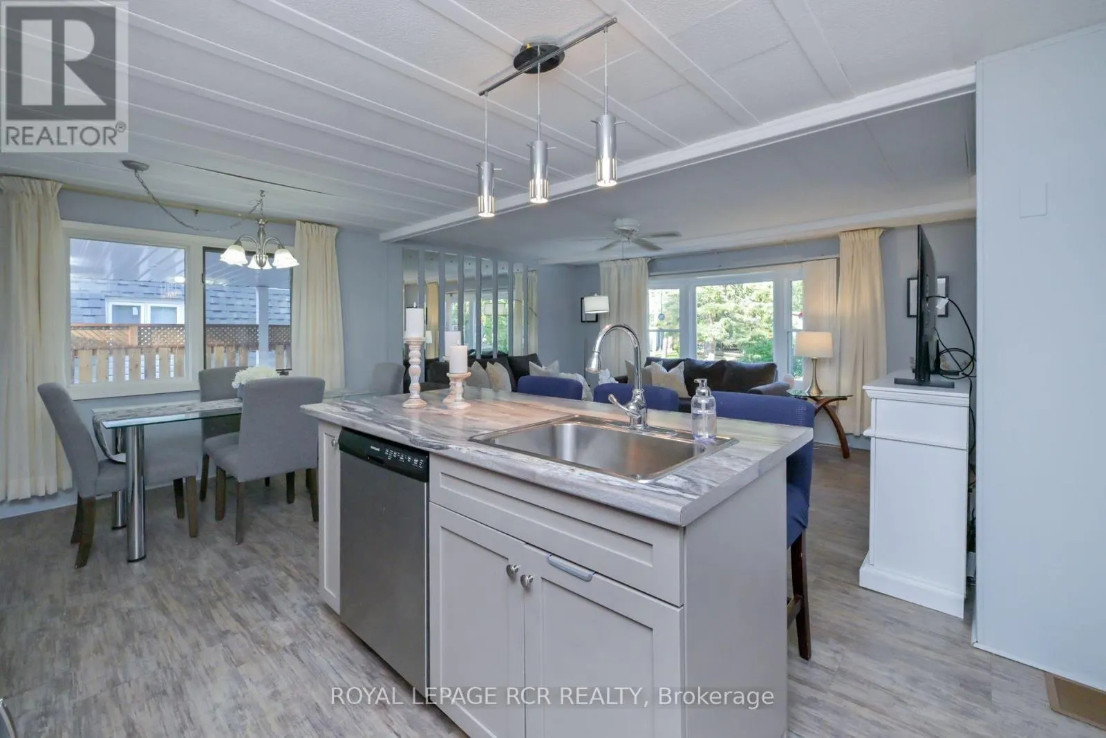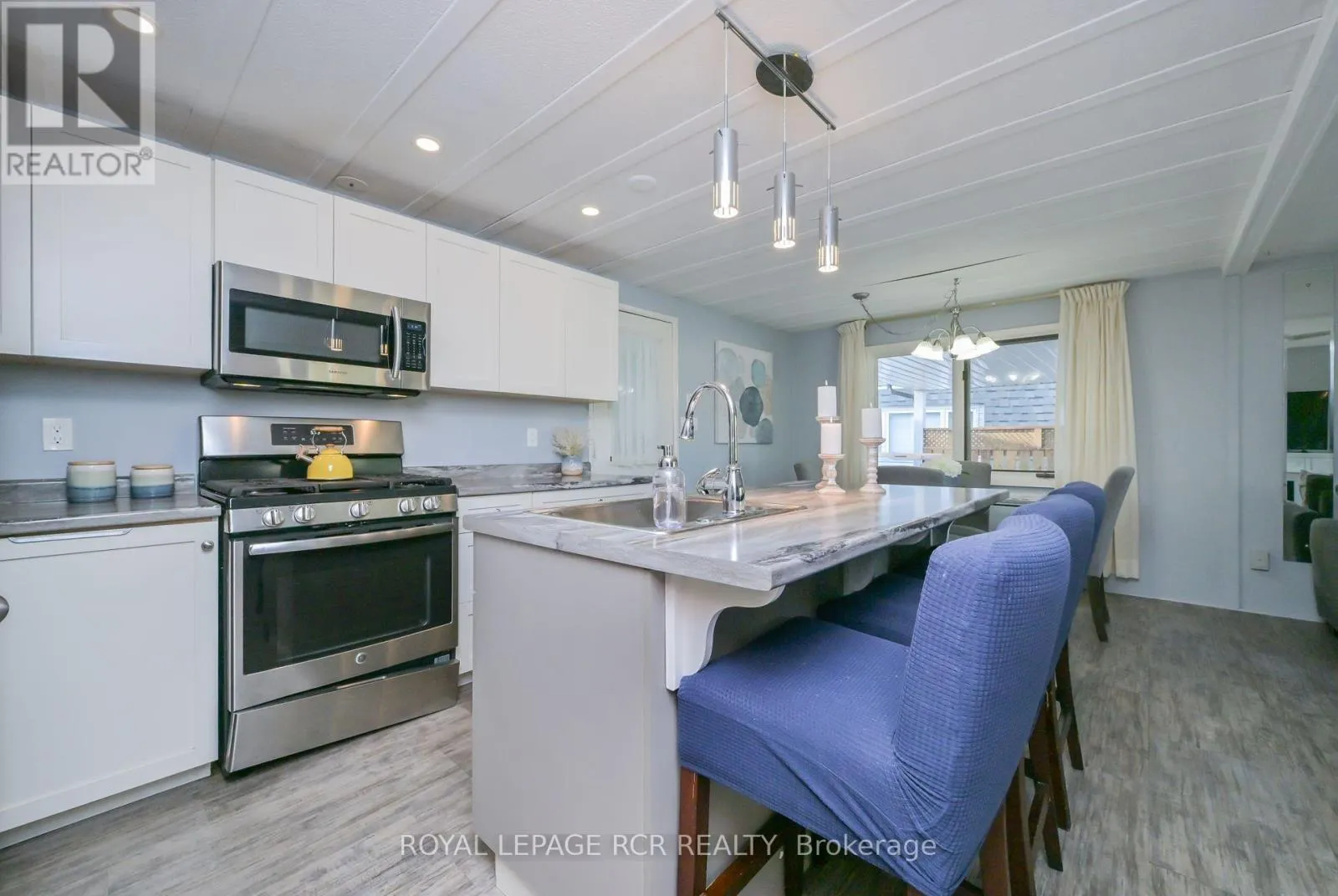 Klondike Park Rd & Watson Ave Welcome to your perfect blend of comfort, convenience, and community living at Hometown, a tranquil adult lifestyle community nestled just minutes from the shores of scenic Wasaga Beach. This beautifully updated 2-bedroom, 1-bah bungalow is a true gem-offering modern functionality in a quiet, friendly neighborhood designed for relaxed, carefree living. Generous three-car parking, covered carport, private storage shed for seasonal items, golf clubs, tools & maintenance free vinyl siding-everything you need to settle in & start living your best life. Gardens & front porch welcome you inside to a spacious open concept living/dining/kitchen area, designed to offer both comfort & style. Large bright window floods the space with natural light, & at the heart of the home, you'll find a beautifully updated kitchen boasting center island w/breakfast bar seating, soft-close cupboards/pot drawers galore, sleek stainless-steel appliances, including a 5-burner gas range, dishwasher, fridge & microwave. A cozy, functional space for entertaining family & friends. This home offers two spacious bedrooms, primary bedroom features a double closet, ensuring plenty of storage for clothing & personal items. Updated 4-piece bath offers convenience & style. It includes a full bathtub w/shower, modern vanity with storage, & quality fixtures. Ensuite laundry & walk in pantry complete this exceptional home. Off the dining area a bright 3-season sunroom extends your living space & accesses the private covered patio for outdoor dining & relaxing. One of the biggest perks of living in Hometown is the vibrant, active community lifestyle that comes with it. As a resident, you'll have access to the heated outdoor pool, on-site 9-hole golf course & Community Clubhouse. Shopping, restaurants & all amenities minutes away, come live your best life at 15 Carruthers! Monthly Fees are: Land Lease $725, Monthly Site taxes $35.49, Monthly house taxes $63.91 Total $824.40. Water meter is billed quarterly. (id:27476)