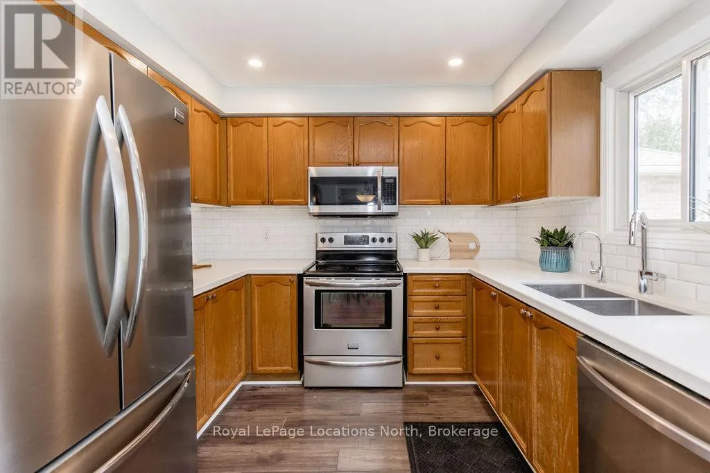 Cross Streets: River Rd W and Blueberry Trail south. ** Directions: River Rd W to Blueberry Trail south to Royal Beech. House hunting can be stressful. You want a home that's solid, practical and ready to enjoy. This one checks a lot of boxes. Built on a generous 61 x 181 ft lot with mature trees, this well-maintained family home offers 3+1 bedrooms and 2 full bathrooms plus a half bath, with approximately 1,400 sq ft on the main level plus a spacious finished basement. Recent updates give peace of mind: a new roof (2025, 40-year shingles) and new eaves with gutter guards front and back (2025), new furnace/AC, plus windows (2013) and a new front door. The heart of the home is the eat-in kitchen with quartz counters, stainless steel appliances and laminate flooring that flows through the main living areas - there's even a RO water system for added convenience. The primary suite is thoughtfully arranged and features a semi-ensuite with double quartz sinks and a luxurious soaker tub, and the main bath features an updated walk-in glass shower with contemporary tile. Main-floor laundry keeps everyday living easy. Downstairs the freshly painted basement adds real usable space: a legal-sized bedroom, a 3-pc bathroom, a large rec room plus a second rec room finished in warm pine, and a big storage room. Additional features include a 100-amp panel, a updated garage door with loft storage and a fully fenced (fence 2024) yard for privacy. This is a comfortable, move-in ready property with all major updates completed, giving long-term value. Walking distance to school is a great draw for families plus trails, beach and shopping/transit are a short walk away. (id:27476)