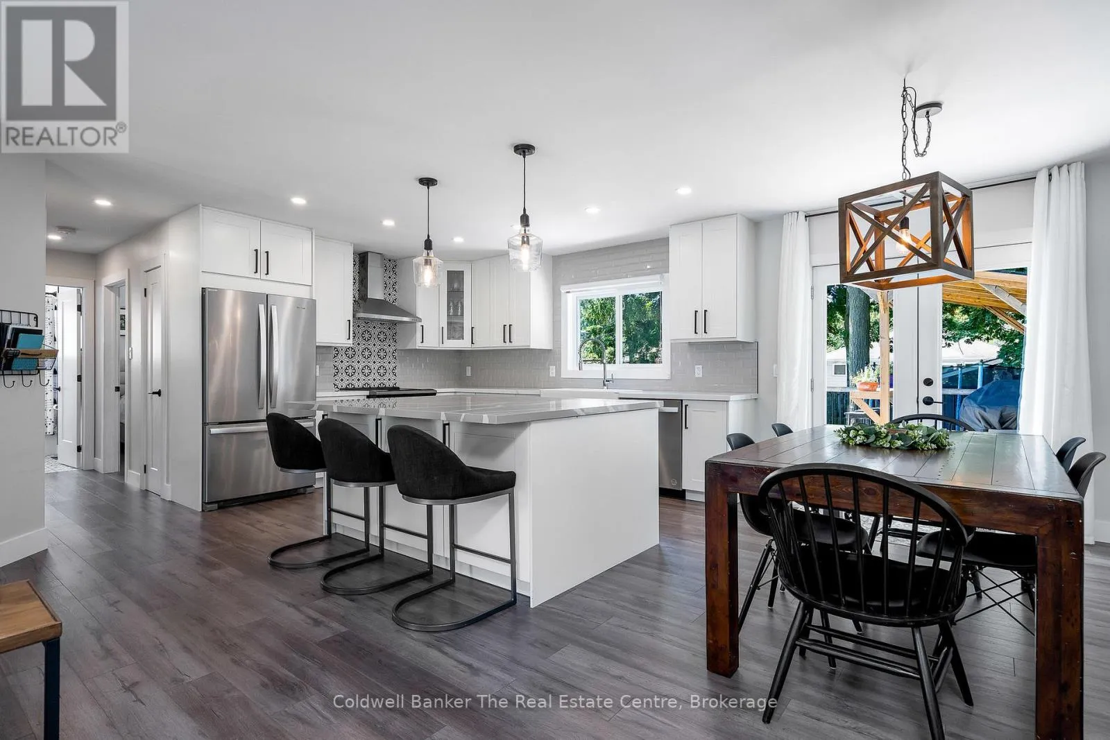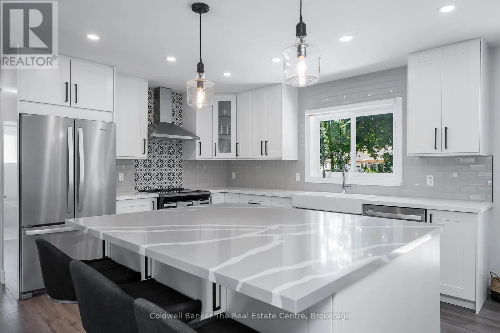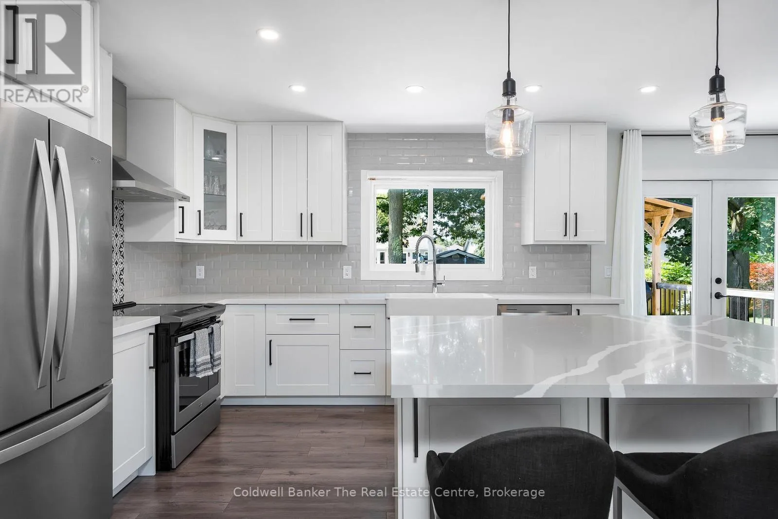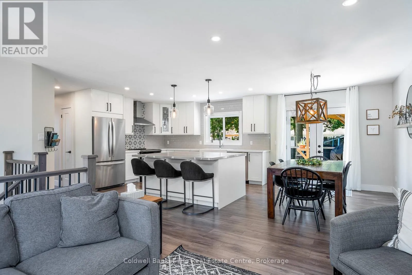 Cross Streets: Leo Blvd and zoo park rd. ** Directions: Zoo park road to Leo Blvd and Langevin. Welcome to this fully renovated raised bungalow nestled in a mature, family-friendly area of Wasaga Beach. Surrounded by tall, established trees and set in a quiet, convenient location, this home offers the perfect balance of comfort, style, and lifestyle amenities. The property features three well-appointed bedrooms on the main floor and a bright, open-concept layout designed for modern living. The heart of the home is the newly renovated kitchen, showcasing a large quartz island, updated cabinetry, and contemporary finishes-ideal for cooking, gathering, and entertaining. This space flows effortlessly into the main living and dining areas, creating a warm and inviting environment filled with natural light. This home has been thoughtfully updated throughout, including new electrical completed in 2019 and new windows installed in 2021 and 2022, providing improved efficiency and peace of mind. New Garage Door 2019 with R16. New shingled roof 2016, Updated Furnace 2014. The finished basement extends your living space with a cozy fireplace, perfect for relaxing evenings or hosting guests. There's also a generous workout area, providing flexibility for fitness, hobbies, or additional family space. Outside a large backyard deck that's perfect for BBQs and outdoor dining, along with a practical storage shed for tools and seasonal items. Home is located within walking distance to parks, beaches, shops and restaurants, perfect location for families, retirees and investors. (id:27476)