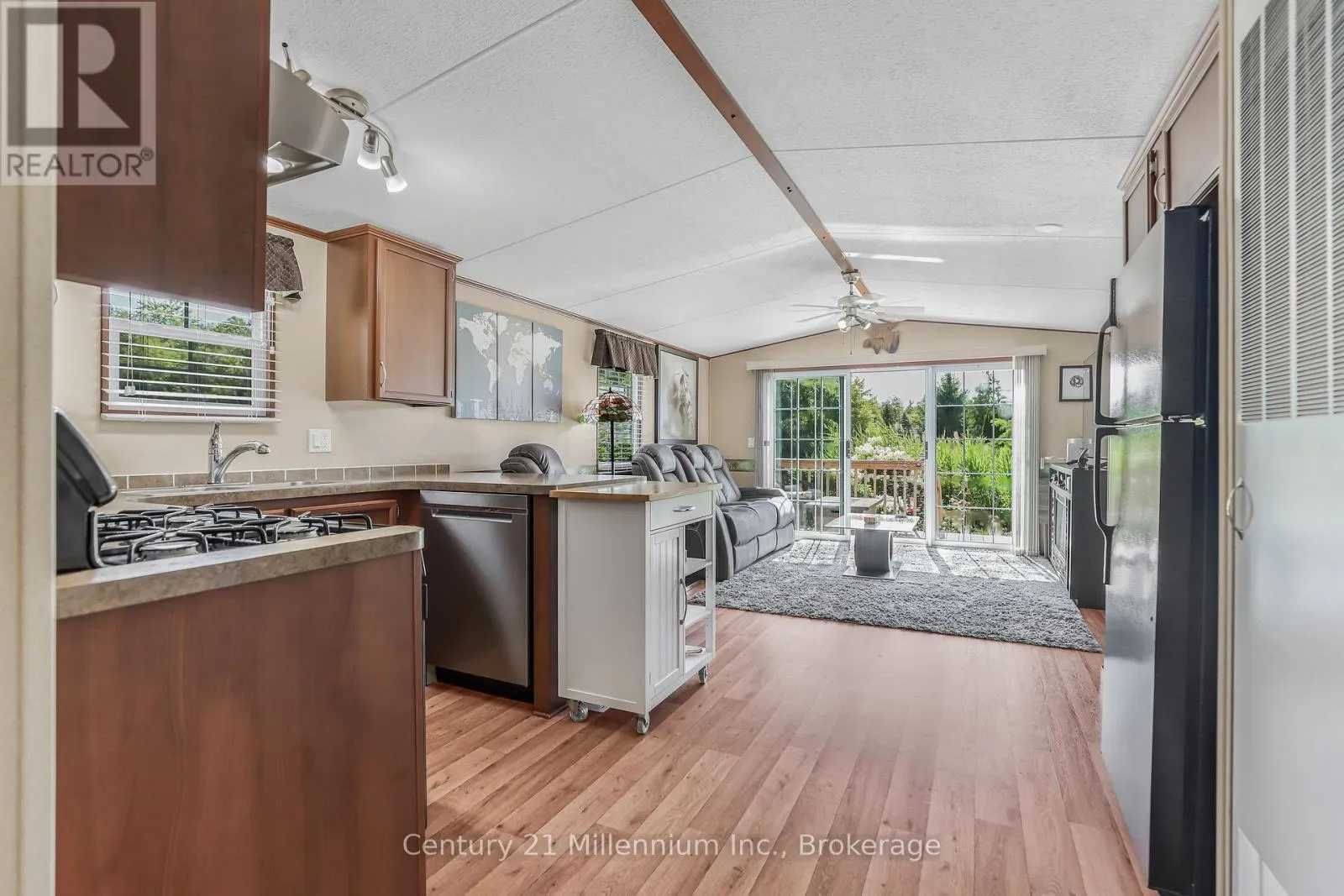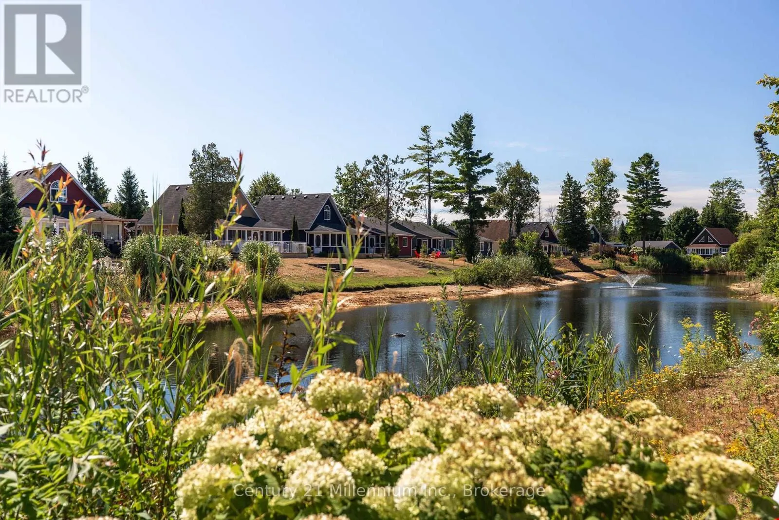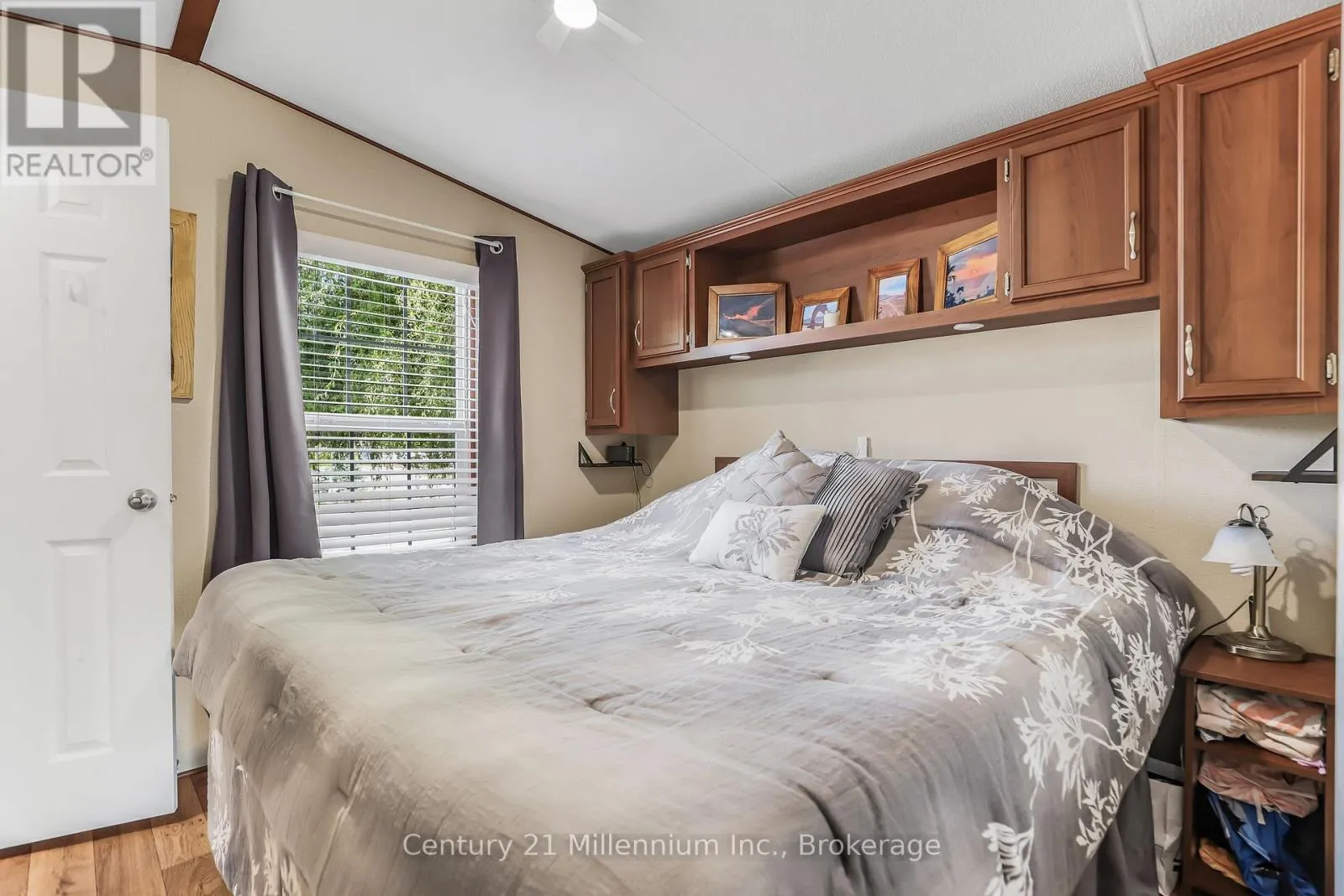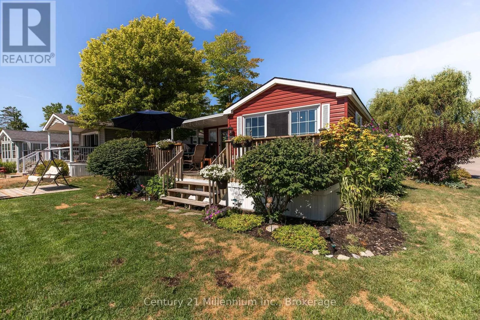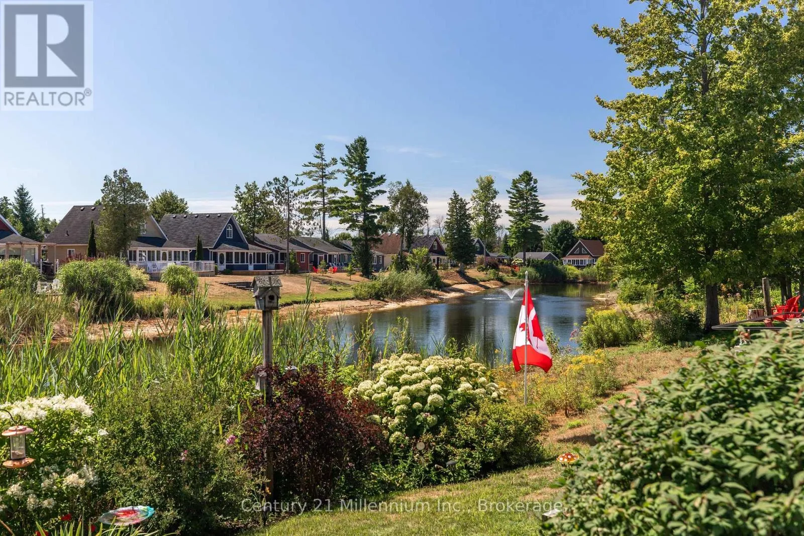 Cross Streets: Madawaska + White Pines Trail. ** Directions: Theme park drive to Madawaska to White Pines Trail. Welcome to your perfect seasonal getaway in the highly sought-after Countrylife Resort! This partially-furnished, charming 2-bedroom, 1-bathroom retreat offers everything you need for relaxing escapes or family fun by the beach. See long list of furnishings included. Upon arrival you are greeted by a large front deck with a cozy sitting area. Step inside and enjoy the spacious 19' x 9' sunroom, ideal for morning coffee or evening gatherings. Step outside to a spacious deck, offering picturesque water views. Relax and enjoy the view of the pond or take a brief walk to the beach on Georgian Bay. Enjoy modern comforts with central A/C, natural gas heat, and municipal water and sewer. The oversized yard provides plenty of space for entertaining around the fire pit, and endless manicured gardens. The 2 dedicated parking spaces add convenience for you and your guests. Countrylife Resort is known for its incredible amenities, including:5 pools for endless swimming, Pickleball & tennis courts for active living, Kids play areas, splash pad & mini golf to keep the little ones entertained, Clubhouse & social activities for the whole family and a secure, gated community for peace of mind. All this, just minutes from Wasaga Beach's shops, restaurants, library, and the new twin arenas. Whether you're looking for family fun or quiet relaxation, this seasonal retreat offers the best of both worlds in a resort-style setting. This is designated a premium large lot and as such the anticipated seasonal site fees for 2026 will be approximately $9,250 plus HST. (id:27476)