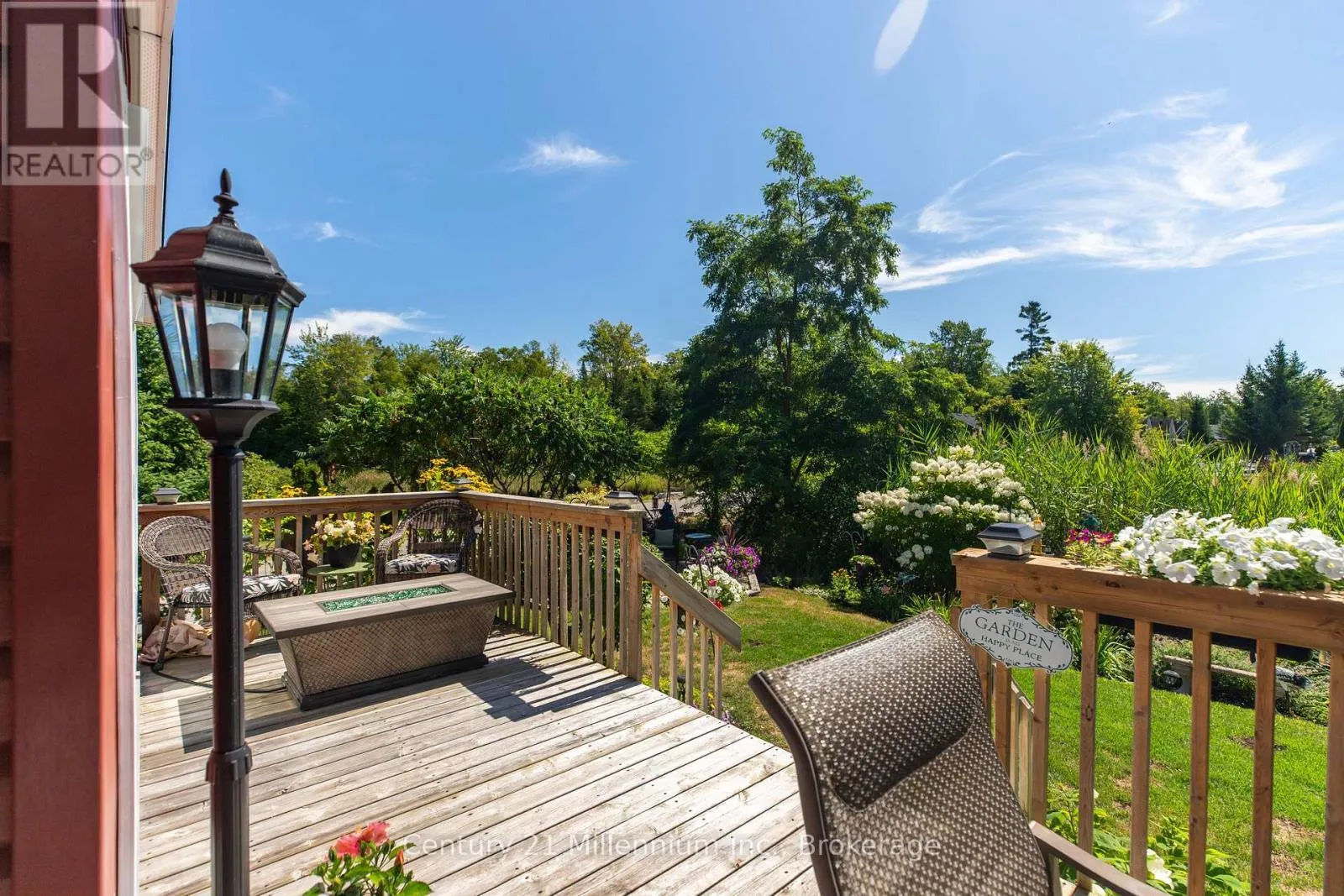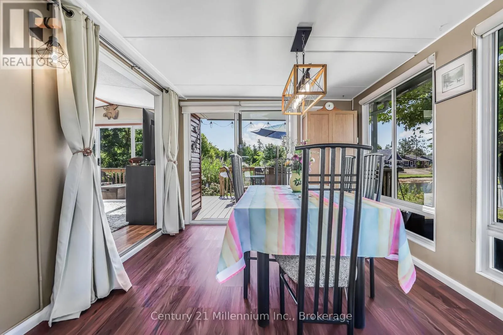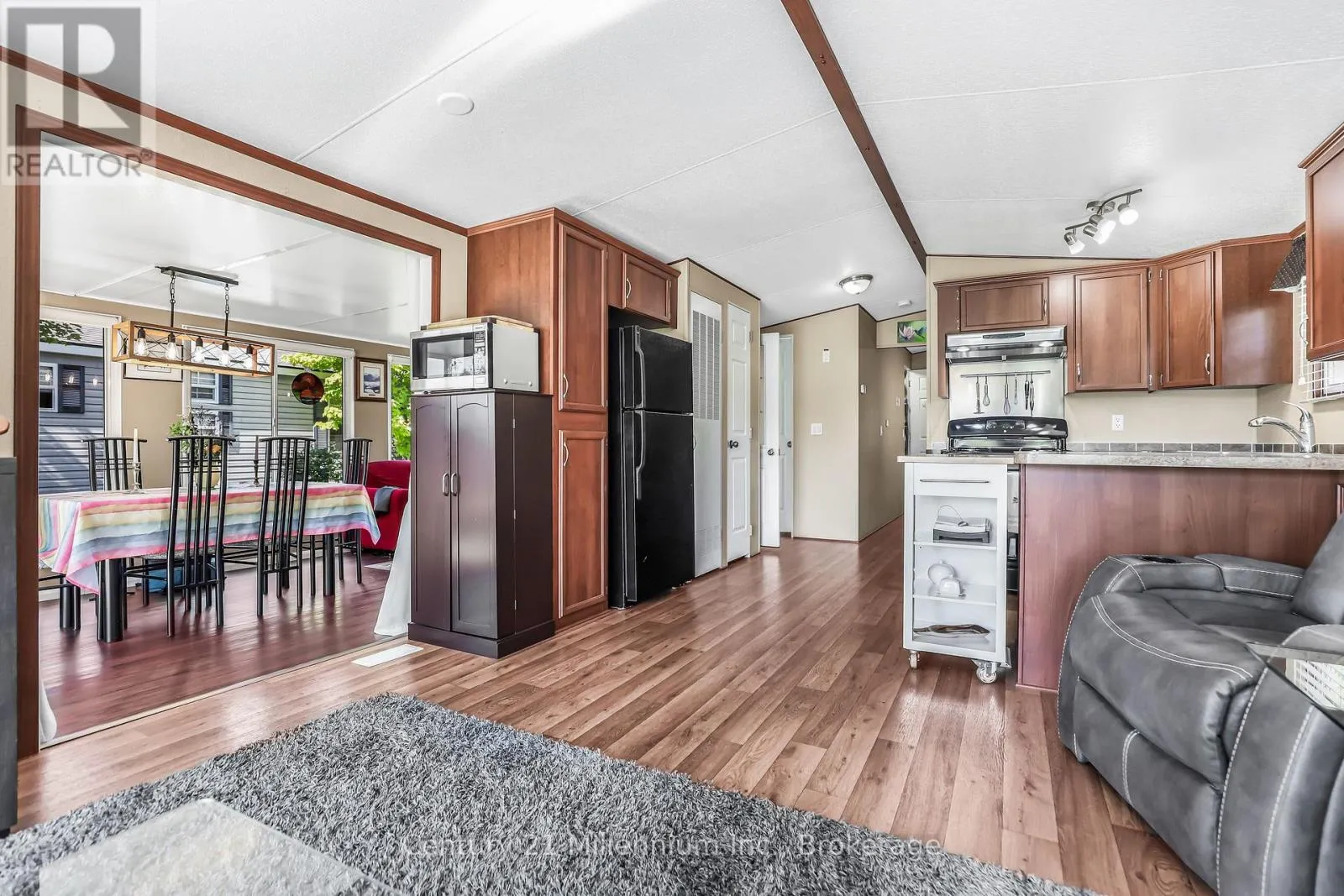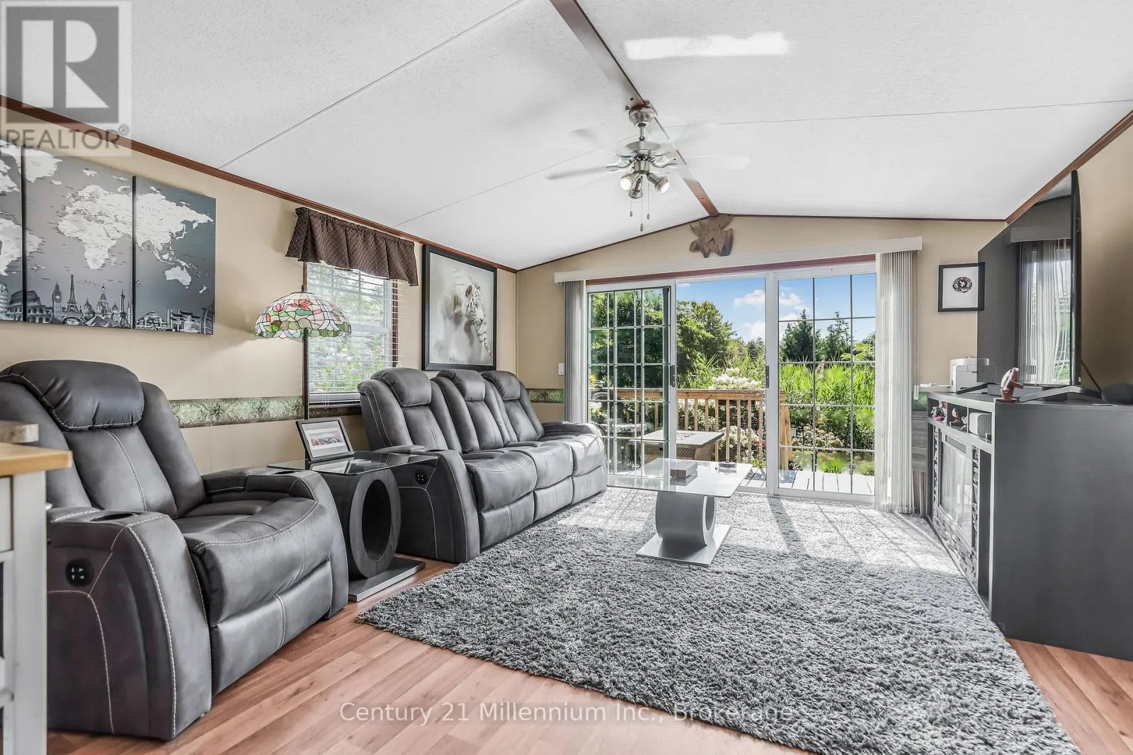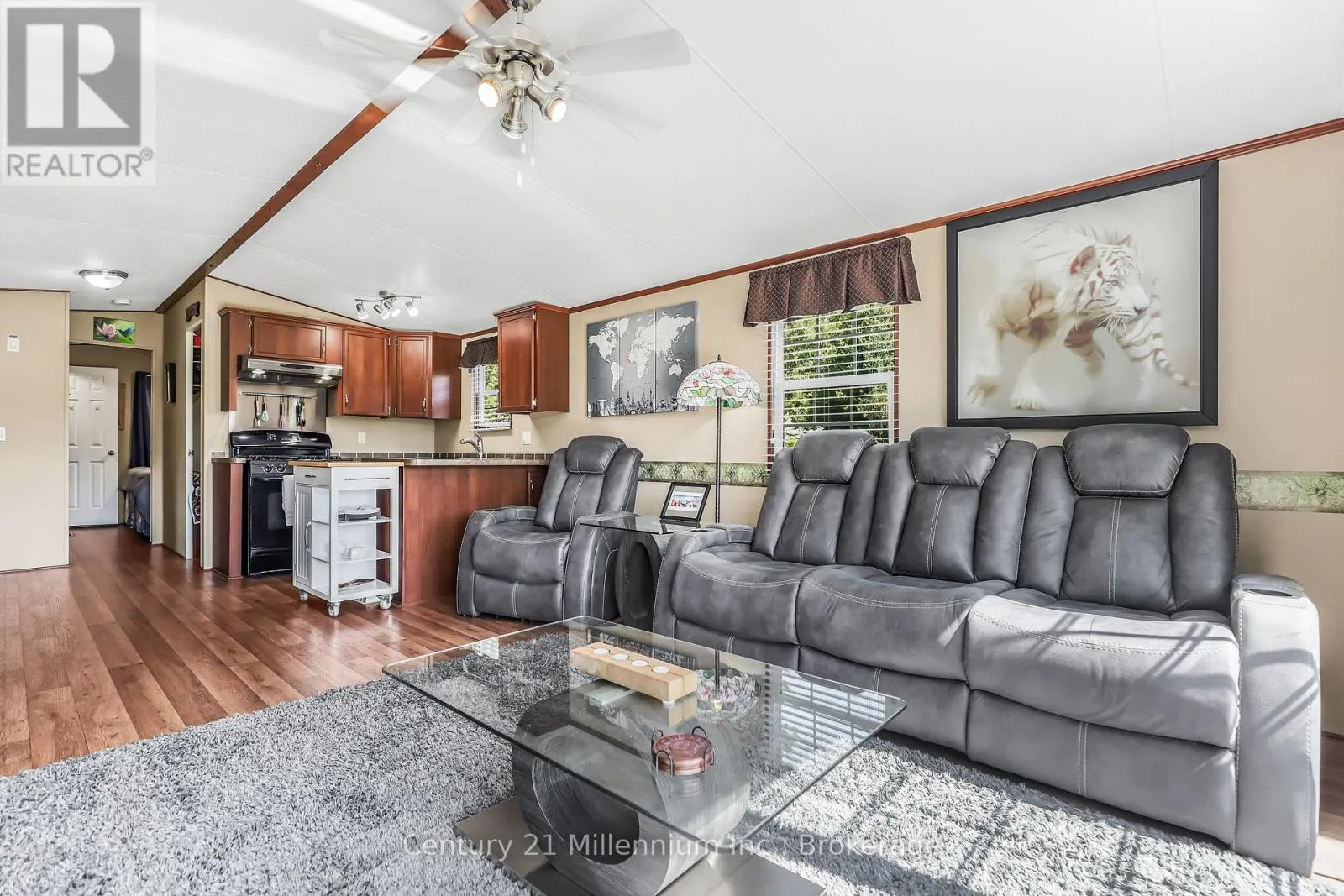 Cross Streets: Madawaska + White Pines Trail. ** Directions: Theme park drive to Madawaska to White Pines Trail. Welcome to your perfect seasonal getaway in the highly sought-after Countrylife Resort! This partially-furnished, charming 2-bedroom, 1-bathroom retreat offers everything you need for relaxing escapes or family fun by the beach. See long list of furnishings included. Upon arrival you are greeted by a large front deck with a cozy sitting area. Step inside and enjoy the spacious 19' x 9' sunroom, ideal for morning coffee or evening gatherings. Step outside to a spacious deck, offering picturesque water views. Relax and enjoy the view of the pond or take a brief walk to the beach on Georgian Bay. Enjoy modern comforts with central A/C, natural gas heat, and municipal water and sewer. The oversized yard provides plenty of space for entertaining around the fire pit, and endless manicured gardens. The 2 dedicated parking spaces add convenience for you and your guests. Countrylife Resort is known for its incredible amenities, including:5 pools for endless swimming, Pickleball & tennis courts for active living, Kids play areas, splash pad & mini golf to keep the little ones entertained, Clubhouse & social activities for the whole family and a secure, gated community for peace of mind. All this, just minutes from Wasaga Beach's shops, restaurants, library, and the new twin arenas. Whether you're looking for family fun or quiet relaxation, this seasonal retreat offers the best of both worlds in a resort-style setting. This is designated a premium large lot and as such the anticipated seasonal site fees for 2026 will be approximately $9,250 plus HST. (id:27476)