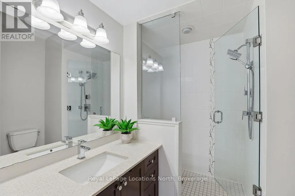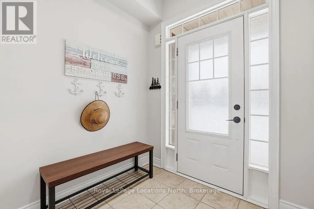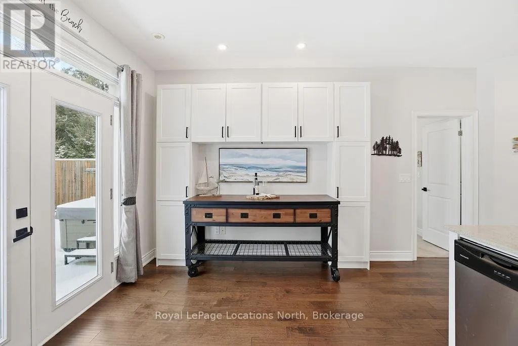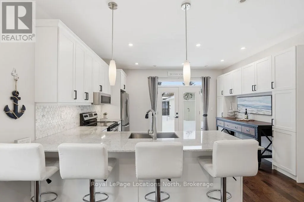 Cross Streets: Zoo Park Rd & Wally Drive. ** Directions: Zoo Park Road to Wally Drive. Beautifully finished True Ranch bungalow | Freehold semi-detached | No condo fees. Welcome to this beautifully finished True Ranch bungalow in the heart of Wasaga Beach, offering easy one-level living in a freehold semi-detached home with no condo fees. This 2-bedroom, 2-bathroom home features an attached garage with inside entry to a thoughtfully designed laundry room complete with a custom live-edge wood countertop, laundry sink, and extra cabinetry. Freshly painted in 2025, the home offers 9' ceilings, hardwood flooring, pot lights, custom blinds, and upgraded hardware on all doors and cabinets throughout. The spacious kitchen features ample cabinetry, a quartz breakfast bar, tiled backsplash, and stainless steel appliances, great for both everyday living and entertaining.The bright living area is filled with natural light and invites you to cozy up to the shiplapped gas fireplace on winter nights. French doors lead to a private, fully fenced backyard with a concrete patio, retractable awning for shade, and storage shed.The primary suite offers 11' vaulted ceilings, a walk-in closet, and a private ensuite with a glass shower. The guest bedroom is conveniently located near a full 4-piece bathroom with tub/shower combo, large vanity, and quartz countertops. Additional highlights include on-demand hot water, parking for two vehicles, and a quiet, well-kept neighbourhood. Just a short walk to the beach, restaurants, shopping, and the local community centre with an indoor walking track.An ideal option for first-time buyers, retirees or empty nesters, or a low-maintenance weekend getaway in Wasaga Beach. (id:27476)