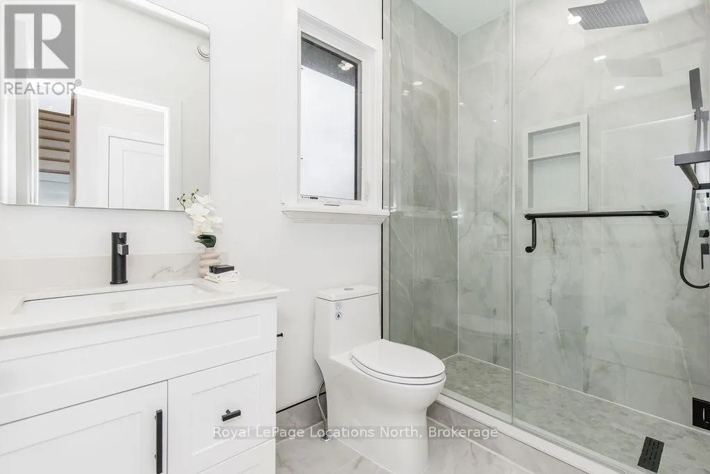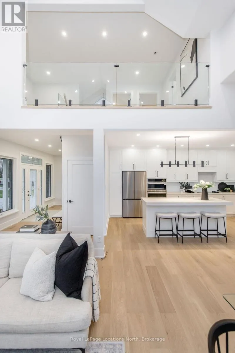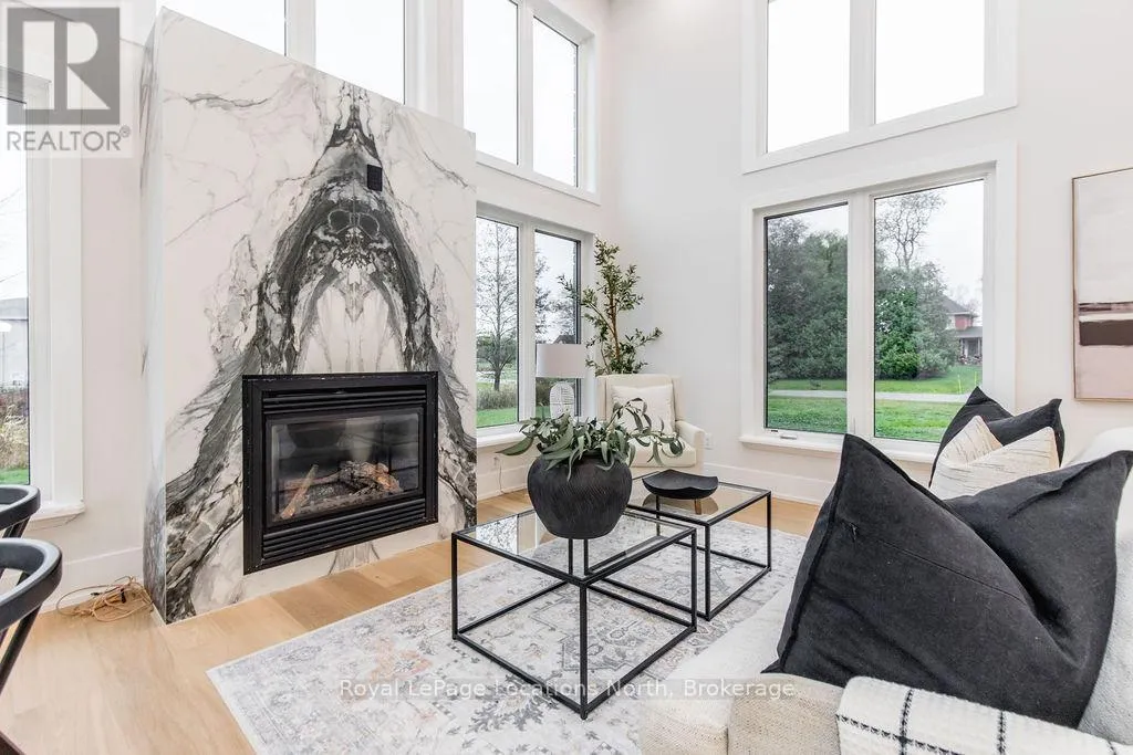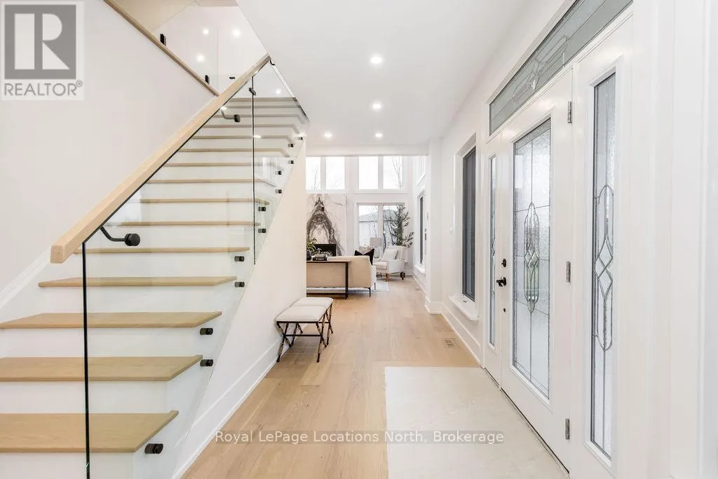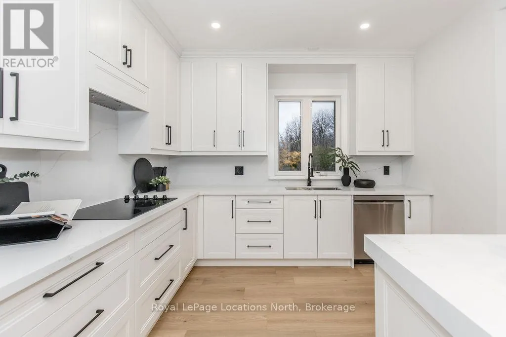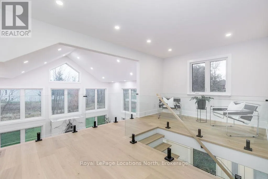 Cross Streets: Sunnidale/Maple/Butternut. ** Directions: Sunnidale Road S to Maple Drive to Butternut Crescent. Welcome to 6 Butternut Crescent, a fully renovated estate home located in one of Wasaga Beach's most sought-after areas, Wasaga Sands. Sitting on a half-acre lot (131 x 216 ft) with no neighbour on one side, this property offers rare privacy and plenty of outdoor space. The custom stone and stucco home, built by Alan Timlock, stands out for its unique architectural design with vaulted ceilings and floor-to-ceiling windows that fill every room with natural light.Inside, you'll find an open and consistent flow across the main floor, featuring a spacious living area, brand-new kitchen with quartz counters and new stainless-steel appliances, and a modern 3-piece bathroom. There's also a main floor bedroom, laundry room with inside entry to the oversized double garage, and new engineered hardwood flooring throughout. Every detail has been updated from new doors, hardware, pot lights, glass railings, and a beautiful new fireplace surround.The finished lower level adds even more living space with 2 additional bedrooms, a full bathroom, and a large open area perfect for a rec room, gym, or guest suite. With 3+2 bedrooms and 4 bathrooms in total, this home offers the space and flexibility families are looking for.The property features 9-ft ceilings, forced-air gas heating, central air conditioning, municipal water, and a septic system.If you've been searching for a modern, move-in-ready home on a large lot in a quiet, high-end neighbourhood close to golf, schools, and the beach, this one checks every box. (id:27476)