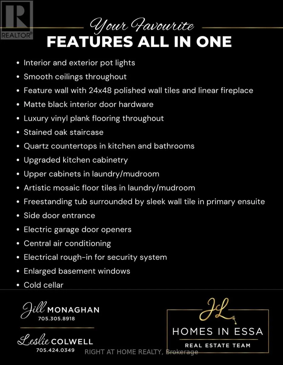 Cross Streets: Sunnidale, Sun Valley Ave. ** Directions: Sunnidale Rd to Sun Valley Ave. Welcome to River's Edge-where modern design meets everyday comfort. This stunning 2-storey brick and stone home offers 2,715 sq. ft. of beautifully finished living space with 4 bedrooms and 3.5 baths. From the dramatic stone entrance and spacious sun-filled foyer, luxury vinyl plank flooring in a stylish light tone, oak staircase, smooth ceilings throughout, and sleek matte black door hardware, every detail is thoughtfully designed. The chef-inspired kitchen features quartz countertops and backsplash and upgraded cabinetry, positioned next to the dining room. An impressive 8-ft sliding door floods the space with natural light and provides seamless backyard access. The open-concept living and great room create an inviting main living area, highlighted by a sleek linear fireplace with custom tile surround. The living room offers flexibility as a playroom or home office. A large laundry/mudroom with upper cabinetry and mosaic tiled floors adds convenience and style. Upstairs, enjoy four generous bedrooms, a reading nook, and spa-like en-suites, all with quartz counters, including a luxurious primary retreat with free-standing tub and glass shower. Additional conveniences include garage door openers, central air conditioning, pot lights inside and out, and a side entrance to the unfinished basement with enlarged windows and bathroom rough-in, offering excellent potential for future finishing. Electrical rough-ins for a security system and EV charger add extra convenience. Perfectly situated just minutes to the beach and close to walking trails, this home blends style, functionality, and location. Quick closing available-just move in and enjoy! (id:27476)