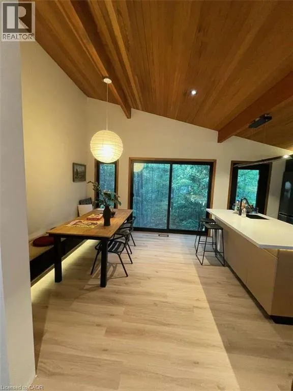 River Road East to Eastdale Dr. (Flos Rod 11 E), turn right, follow to Cedarlane Dr., turn left on Cedarlane and follow to Birch Trail, turn right and go to #28 For more info on this property, please click the Brochure button. Welcome to this mid-century modern four-season home, just a short walk from the sandy shores of Wasaga Beach. Nestled on a quiet cul-de-sac and surrounded by mature trees, this 90' x 187' lot offers a peaceful and private setting with easy access to forest trails, biking paths, and outdoor recreation. This property is ideal for those seeking a full-time residence, a tranquil weekend retreat, or a high-end investment opportunity. This fully renovated property blends original charm with thoughtful upgrades. The interior features preserved 1970s cedar ceilings (15ft), natural materials and clean architectural lines. Slab on grade construction. 3 bed, 2 bath, plus separate office. Brand new custom designed kitchen, quartz countertops, Bosch and LG appliances. Dining room with custom cabinetry. Upper level laundry. Separate family room with bar/sink. Steam shower. Large windows offering calming views of the trees and natural surroundings. Recent upgrades include a new steel roof (2021), 80,000 BTU gas furnace (2025), central A/C (2022), updated insulation, fully updated plumbing, and full electrical rewire with new panel (2022). Private, fully treed half-acre lot includes a firepit, natural landscaping, and offers a 5 minute walk to the beach via quiet, private pathways. Designed with inspiration from Japanese minimalism and Scandinavian warmth, the home offers calm, curated spaces throughout, making it a rare opportunity in one of Wasaga Beachâs most desirable locations. (id:27476)