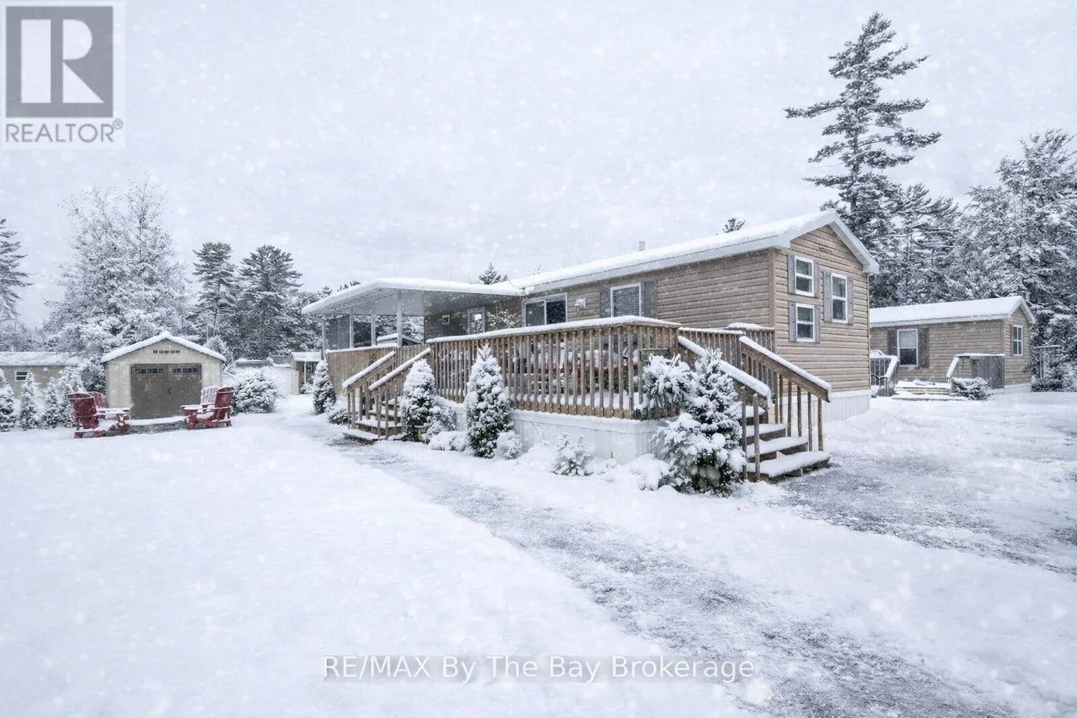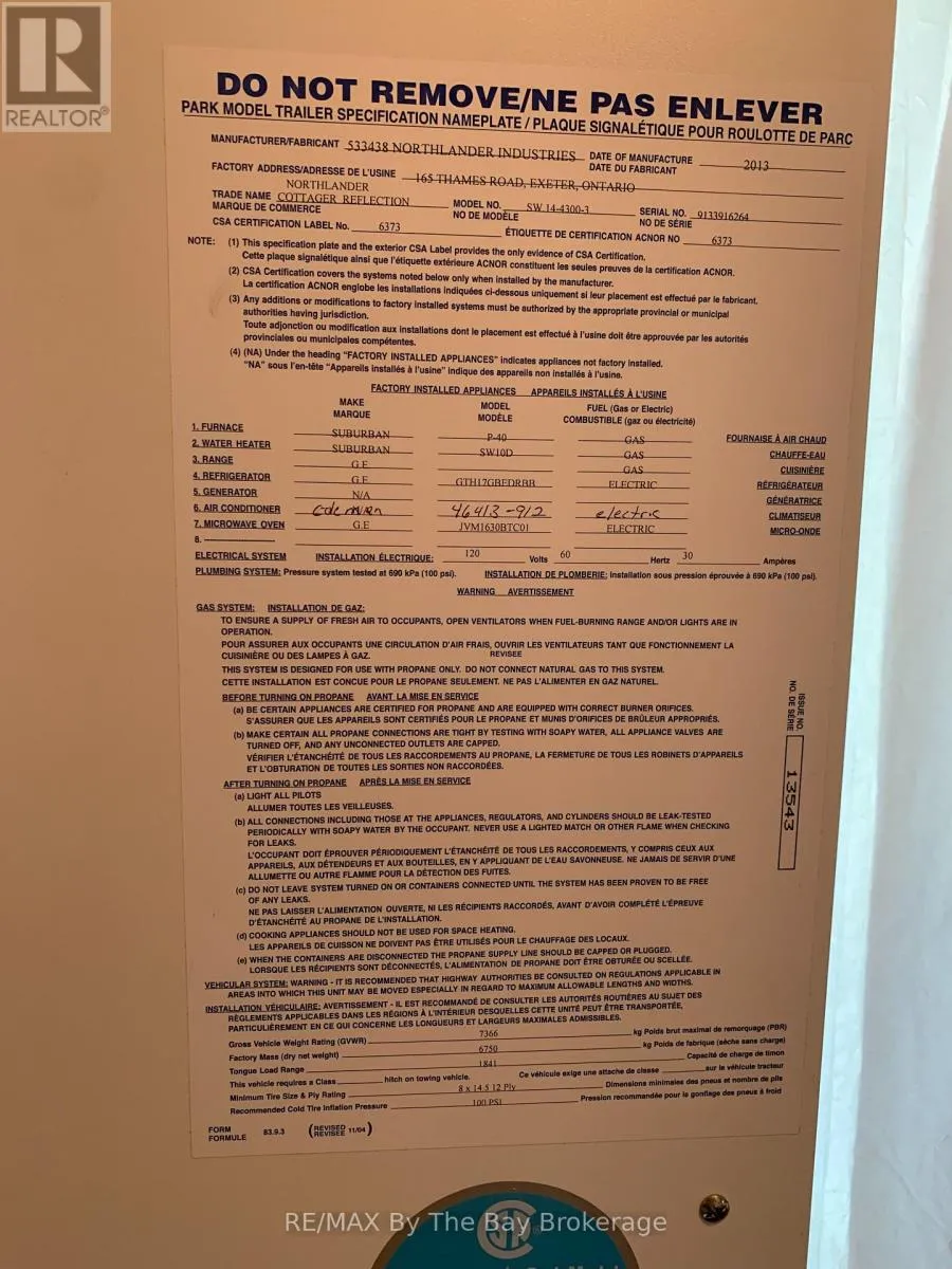 RIVER ROAD WEST TO THEME PARK DRIVE. SIGN IN AT RESORT OFFICE. Short walk to the beach! Seasonal retreat in popular Countrylife Resort. (7 months April 28th-Nov 15th). This 2014 model year Northlander Cottager Reflection features a 12x35 foot deck with 11x18 hard roof. Centrally located lot with plenty of space and parking for two cars and a very short walk to the beach. 3 bedrooms 1 bathrooms with lots of room for family and friends. Low maintenance exterior with full lawn irrigation, paved driveway, engineered concrete pad under unit and nice size storage shed. Fully furnished with central A/C. This Cottage is ready for your family to start enjoying the summer! Resort features pools, splash pad, clubhouse, tennis court, play grounds, mini golf and short walk to the beach. Gated resort w/security. This unit has been very well maintained and is a pleasure to show! 2026 Seasonal Site fees are $6,740 plus HST (id:27476)