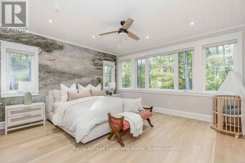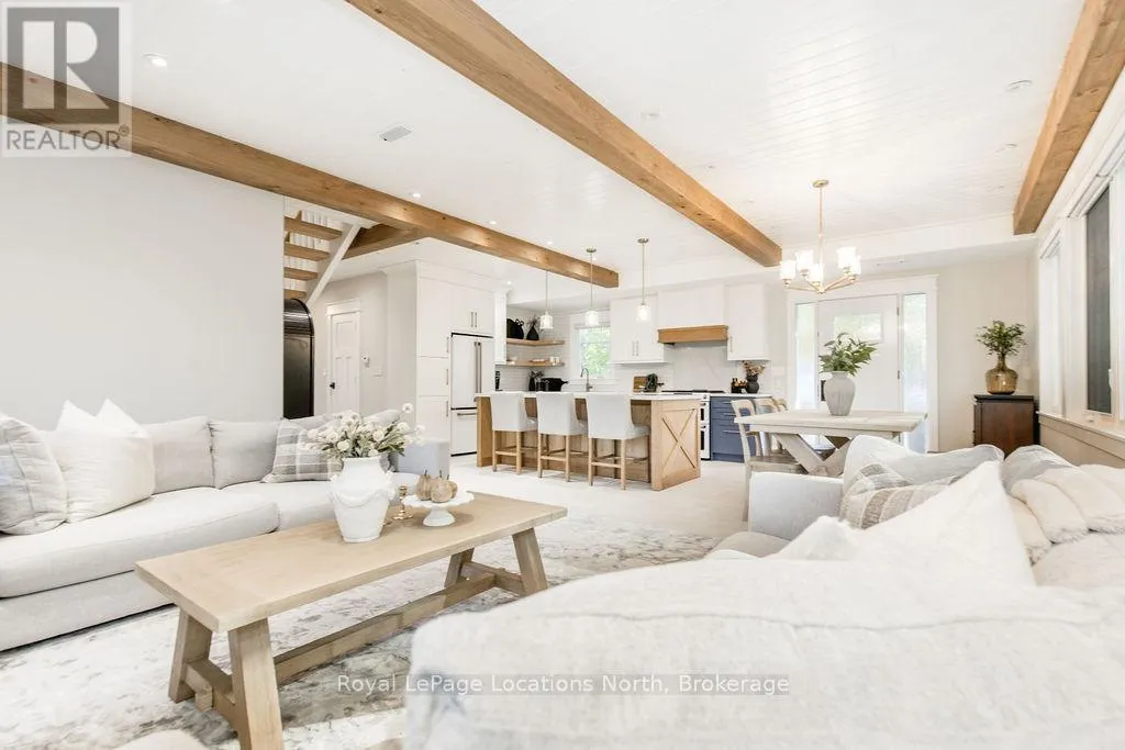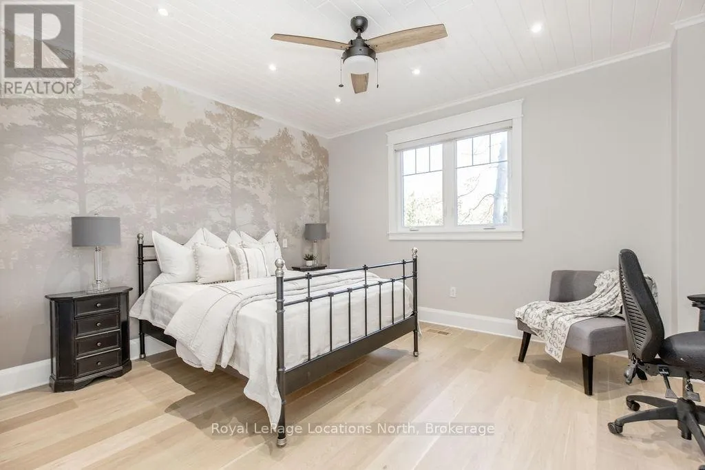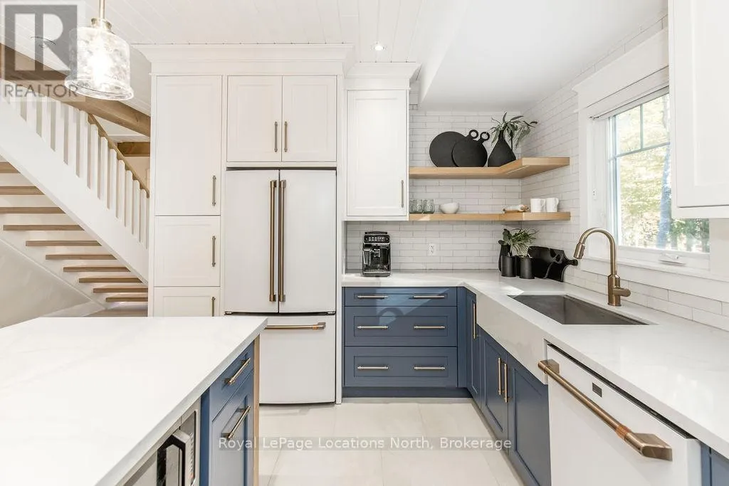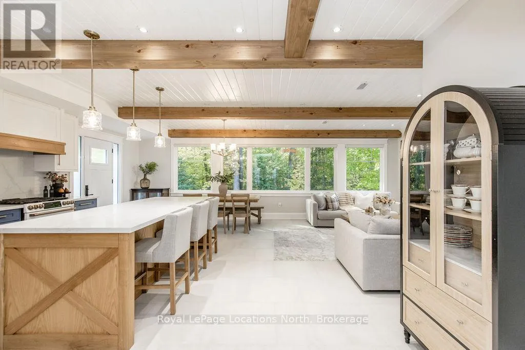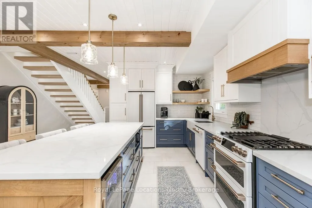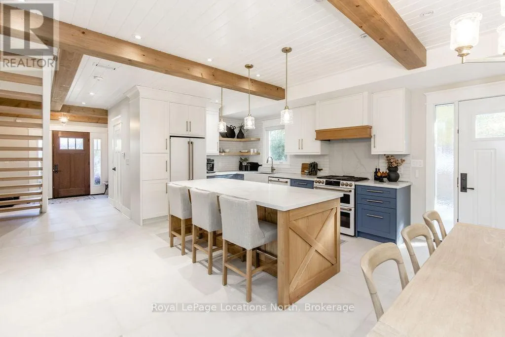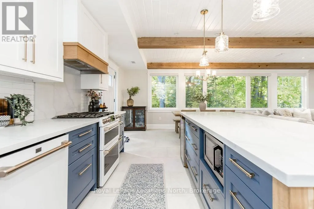 Cross Streets: Mosley Street and Oxbow Park Drive. ** Directions: Mosley Street to Oxbow Park Drive. DREAM HOME WITH HEATED DRIVEWAY & WALKWAYS - Welcome to this stunning, custom-built 3 bed, 3 bath home showcasing exceptional craftsmanship, built in 2023, perfectly positioned backing onto protected land & directly across from the river in beautiful Wasaga Beach. Designed w/ a mix of modern luxury & timeless character, this home captures a century-home feel with its large mouldings, custom doors & wood beams w/ a custom-built stone fireplace accenting the main floor. Inside, the bright open-concept layout features wall-to-wall windows overlooking the forest, flooding the space w/ natural light. The custom kitchen is a true showpiece, showcasing a large quartz island, blue & white cabinetry, a mini wine fridge, & a full quartz backsplash. It's finished w/ a high-end signature line of Wi-Fi-enabled appliances, combining elegance & smart convenience for the modern homeowner. The dining area sits beside large windows, while the living room offers aged wood ceiling beams and tongue-and-groove ceilings that bring warmth & texture throughout along w/ the wide-plank white oak hardwood. Upstairs the hardwood stairs, lead to spacious bedrooms, each w/ custom walk-in closets, built-in desks, shiplap ceilings, & designer touches like wallpaper accents & skylights. The primary suite feels like a retreat, featuring a cozy fireplace, luxurious ensuite w/ floating tub, double quartz sinks, black cabinetry, & a walk-in closet w/ custom cabinetry & make up desk perfect for getting ready for the day.Luxury features include- Inside entry to garage with epoxy flooring + custom storage, hydronic in-floor heating, heated driveway & walkways while outdoors, enjoy the built-in BBQ, rubberized surfacing on patios w/ hot tub hook up, sprinkler system, & tranquil forest backdrop w/ cedar trees surround the patio for privacy.Interior features include motorized blinds, smart home system, security cameras, spray-foam insulation, high-efficiency boiler system, & a hard-wired generator. (id:27476)