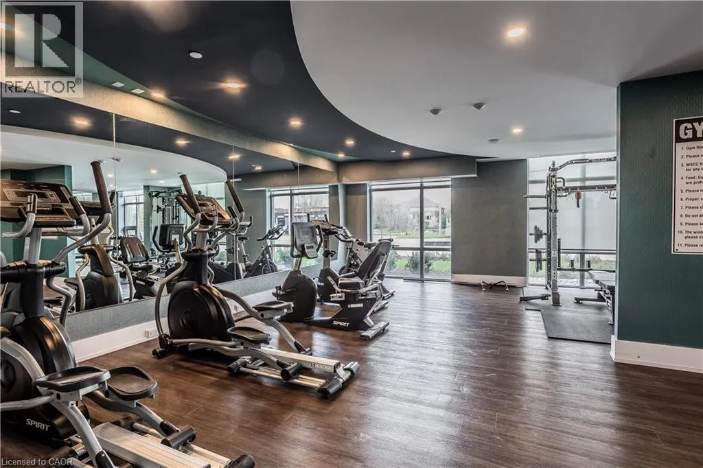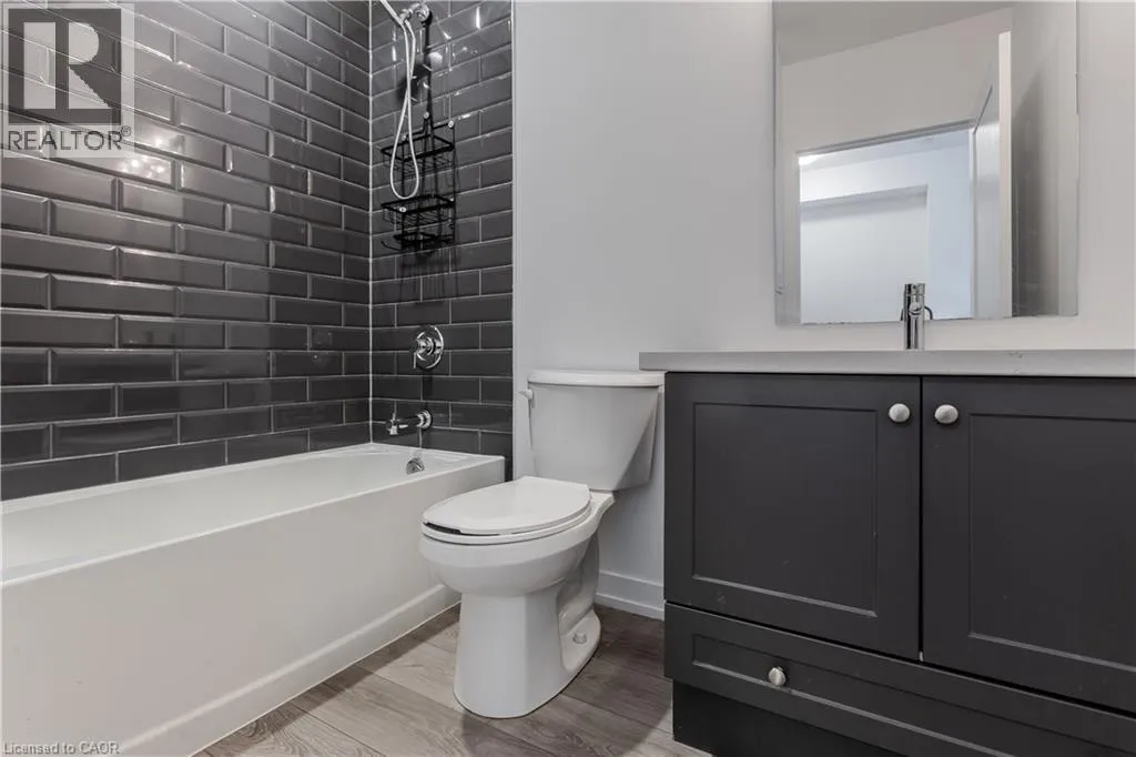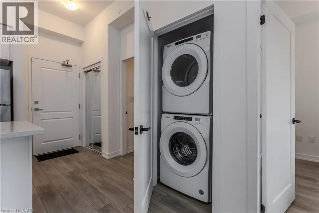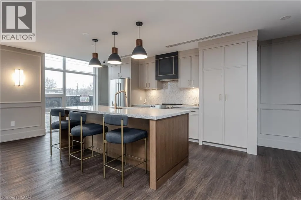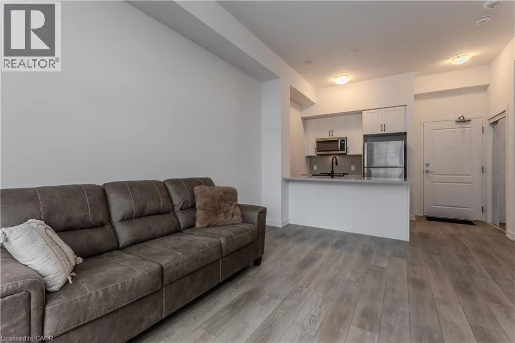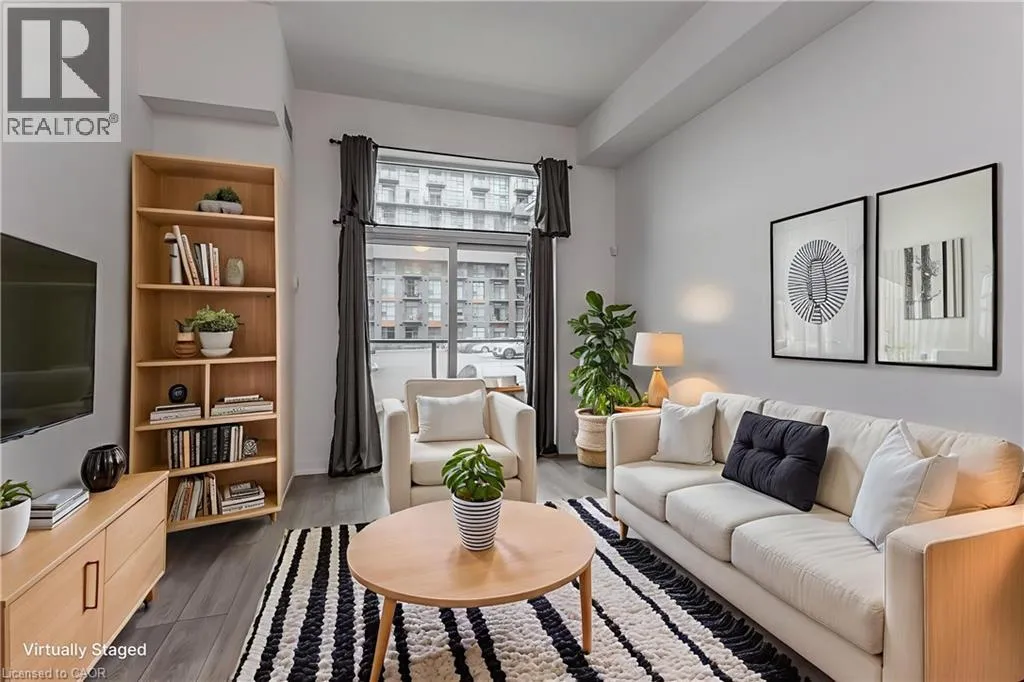 Hamilton Street N to Dundas Street E A perfect opportunity for first-time buyers looking to step into homeownership with style, comfort, and convenience. This beautifully appointed ground-floor condo offers modern living in one of Waterdownâs most desirable neighbourhoodsâclose to everything you need for your daily lifestyle. Enjoy walking distance to shops, dining, parks, and essentials, plus easy access to highways and public transit for a seamless commute. Inside, youâll love the bright open-concept layout designed for both everyday living and entertaining. Hardwood flooring flows throughout, adding warmth and elegance to the space. The sleek, modern kitchen features quartz countertops, stainless steel appliances, an undermount sink, and a peninsula with a breakfast barâperfect for morning coffee, casual meals, or hosting friends. The living area is filled with natural light and extends to your own private balconyâa cozy spot to unwind, enjoy fresh air, or create your own little outdoor oasis. The spacious bedroom offers floor-to-ceiling windows and a calming atmosphere, ideal for relaxation after a busy day. A stylish 4-piece bathroom with modern subway tile, in-suite laundry, one parking space, and a storage locker complete the suite, offering comfort and everyday convenience. This thoughtfully designed building enhances your lifestyle with desirable amenities, including a fitness centre, party room, community BBQ area, rooftop deck/garden, bicycle storage, and a contemporary lobby lounge. Whether you're working out, hosting friends, or enjoying sunset views from the rooftop, youâll love the sense of community and ease of condo living. Plus, downtown Burlington waterfront and restaurants are just minutes away. Ideal for those entering the market or seeking a low-maintenance lifestyle, this move-in-ready condo blends modern finishes, great amenities, and a location that truly supports your day-to-day needs. (id:27476)