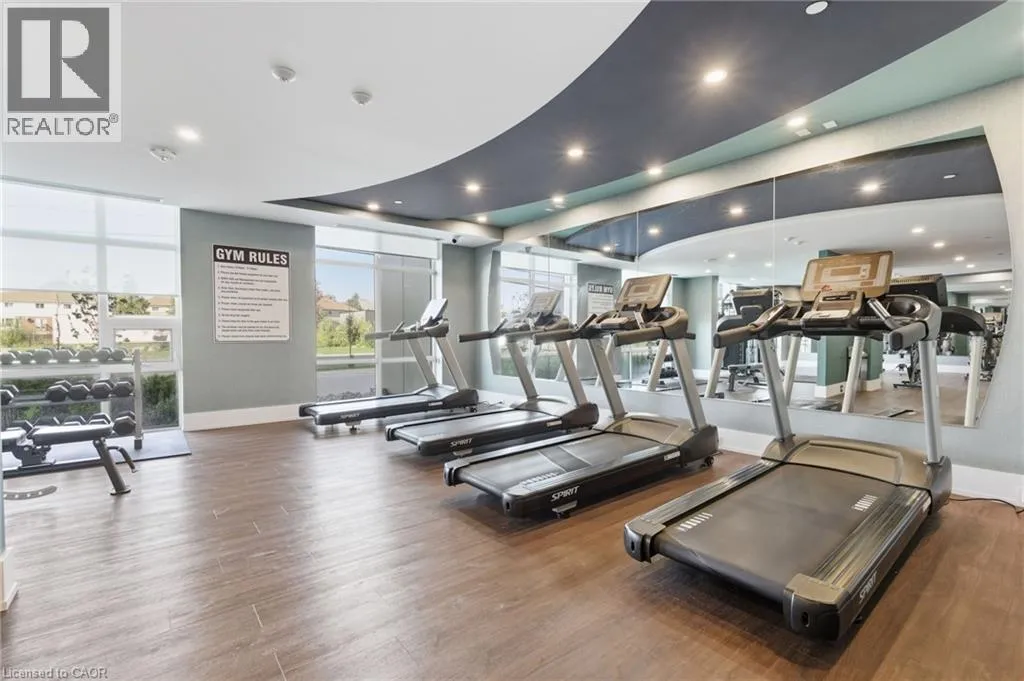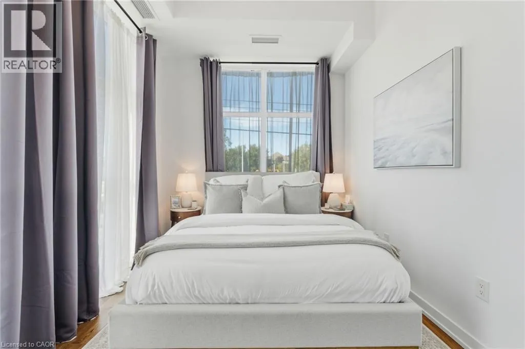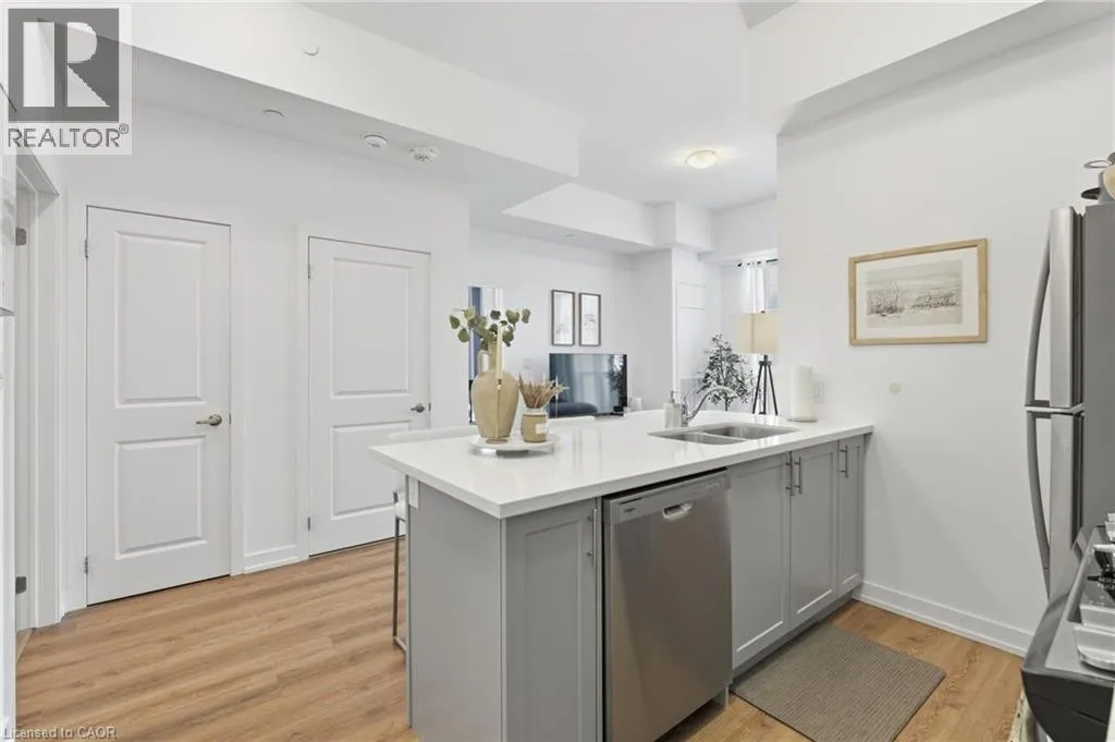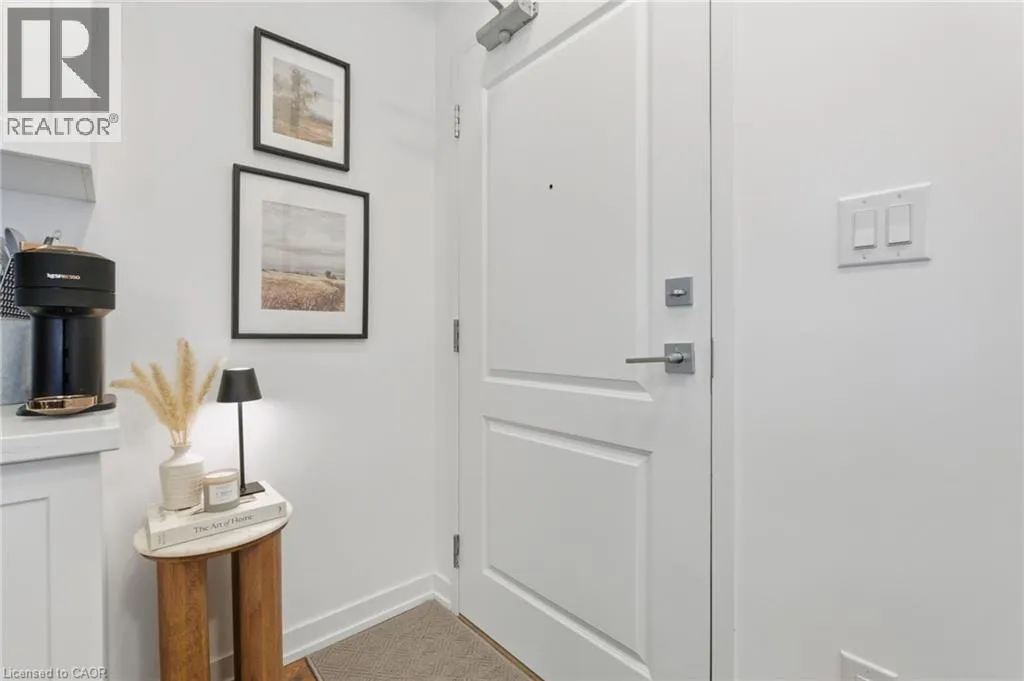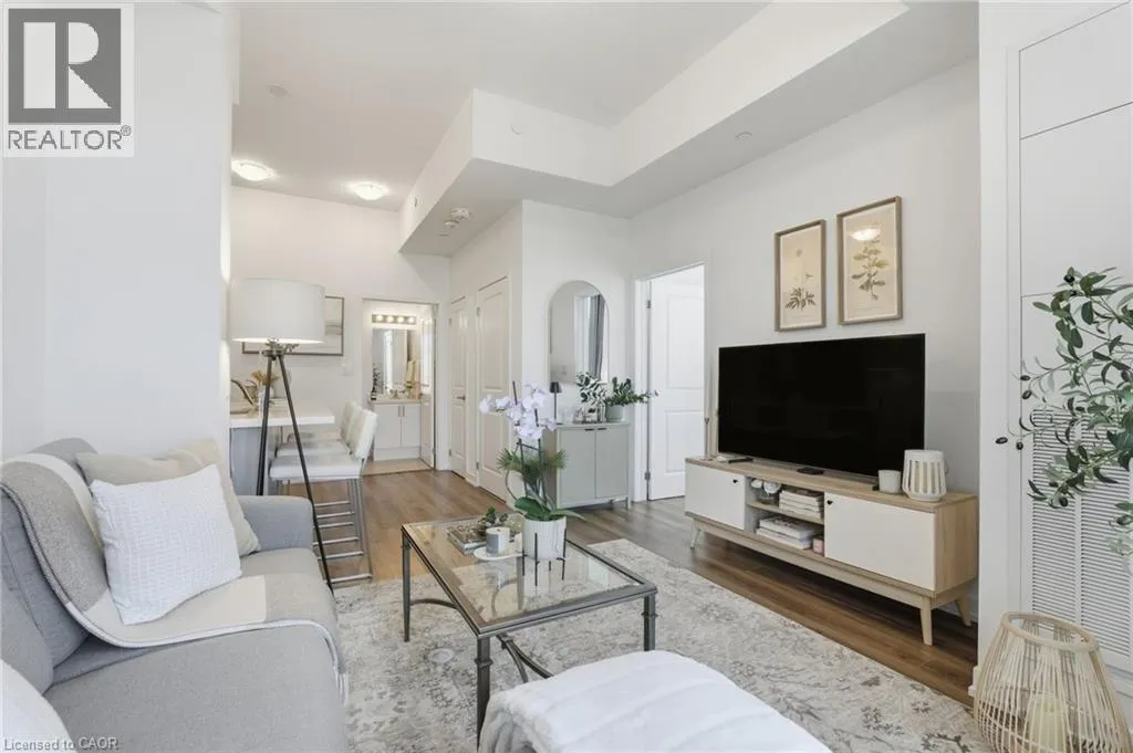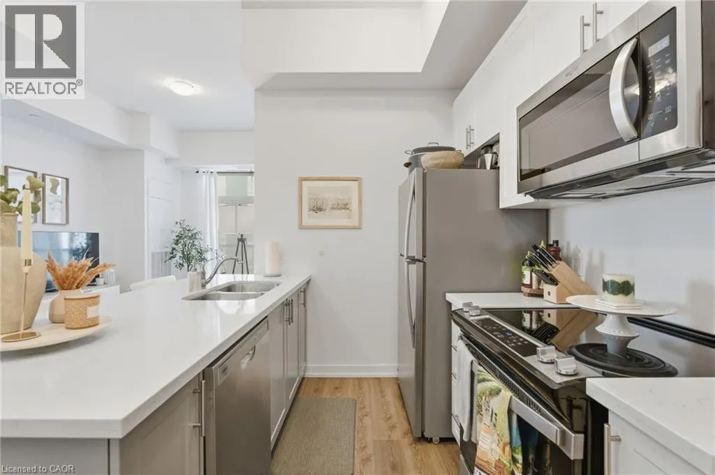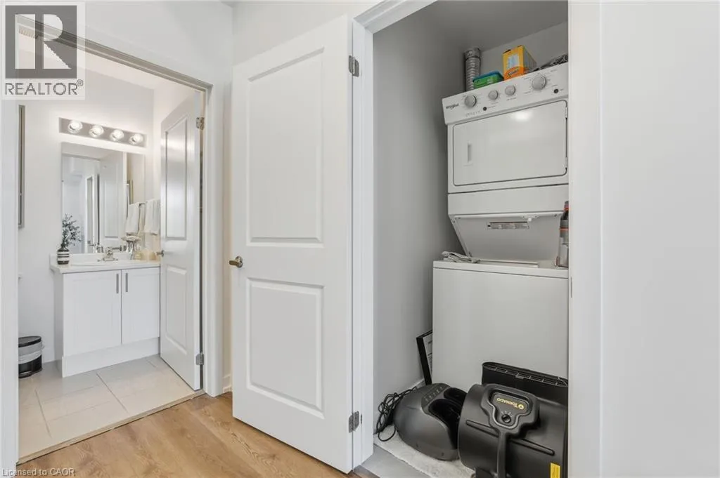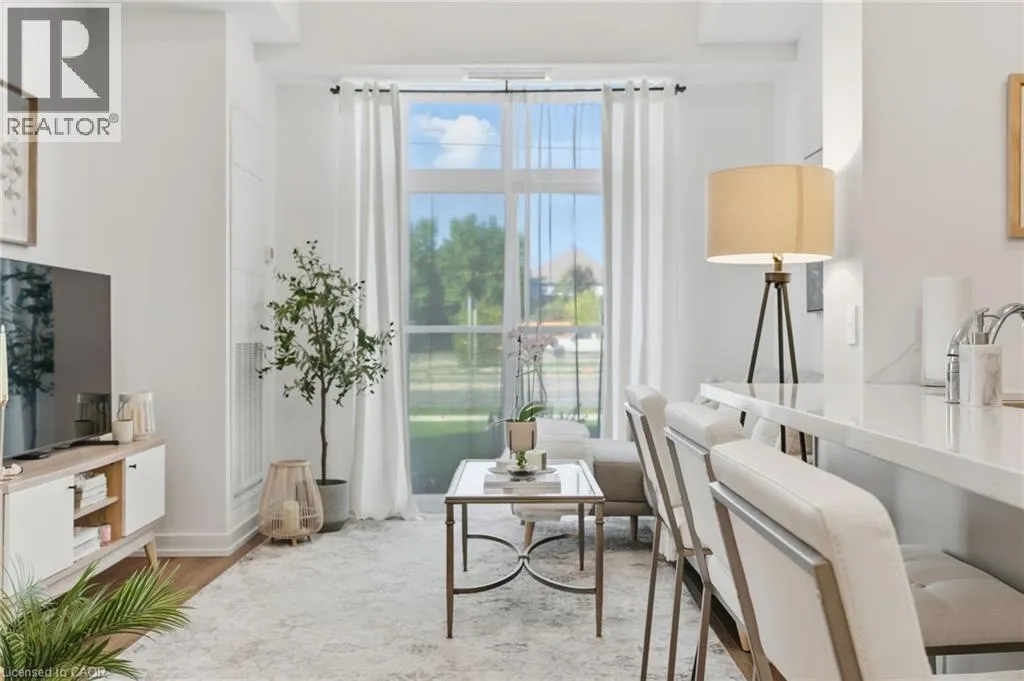 Dundas St E between Riverwalk Dr and Mallard Trl Welcome to this unique, move-in ready, one-bedroom corner unit. The interior boasts high ceilings, upgraded flooring throughout, quartz countertops, an open-concept kitchen and living area with stainless steel appliances, a large bedroom with a walk-in closet and in-suite laundry for added convenience. Thoughtfully designed for comfort, convenience and efficiency, this stylish condo includes one parking space, a private storage locker, and features an energy-efficient geothermal heating and cooling system. Residents enjoy access to an impressive array of building amenities, including party room, modern fitness facility, rooftop patio, and secure bike storage. Located in the sought-after Waterdown community, youâre just minutes from charming local shops, restaurants, schools, scenic parks, highway access and the Aldershot GO âideal for professionals and commuters alike. Donât miss the opportunity to make this contemporary condo your new home! Donât be TOO LATE*! *REG TM. RSA. (id:27476)