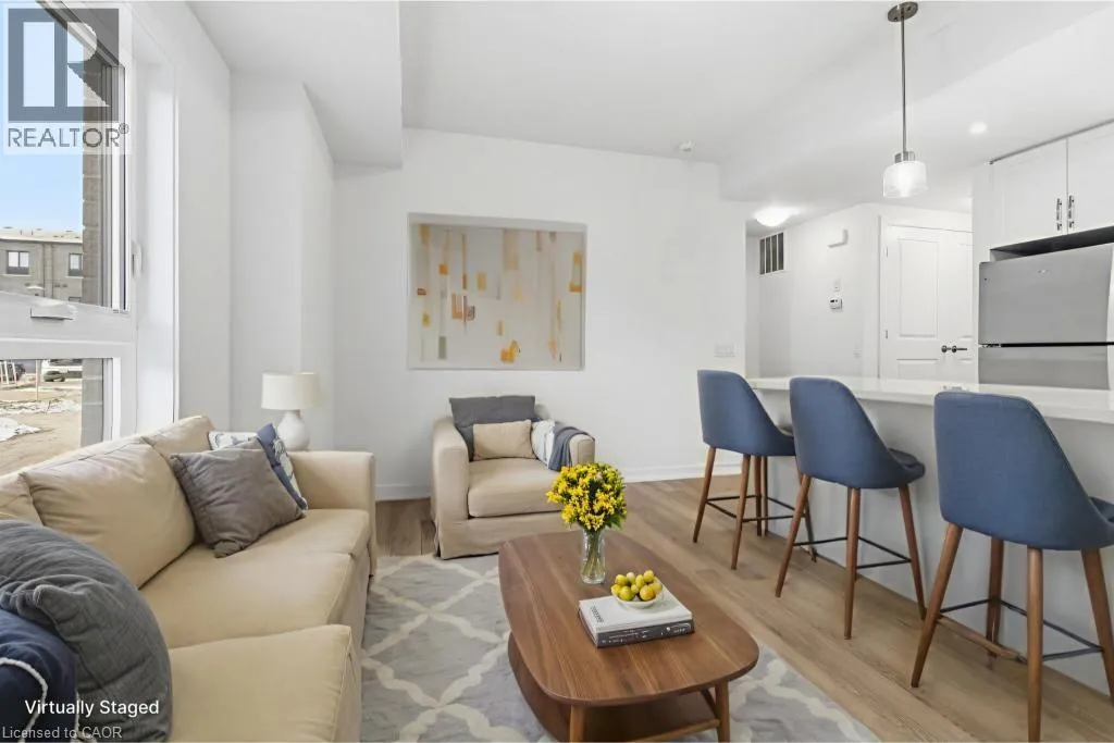 Dundas St E to Burke St to Kenesky Dr Newly built and never lived in! This main-floor townhome is ideally located just minutes from downtown Waterdown, shopping and restaurants. This modern, upgraded one-bedroom home is completely carpet-free, featuring an open-concept layout and a stylish kitchen with beautiful quartz counters, an island, pendant and valance lighting and vinyl flooring throughout. The sun-filled living room offers a bright and welcoming space, while the bedroom provides good closet space. Thoughtful design elements add convenient storage nooks, ensuring no space goes to waste. Enjoy the ease of in-suite laundry and a four-piece bathroom that completes this fantastic living space. The garage with inside entry means youâll never have to deal with the weather. The area offers hiking trails, excellent access to highways and transit and close proximity to the Aldershot GO Station. Donât be TOO LATE*! *REG TM. RSA. (id:27476)