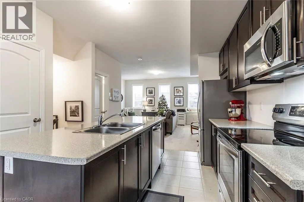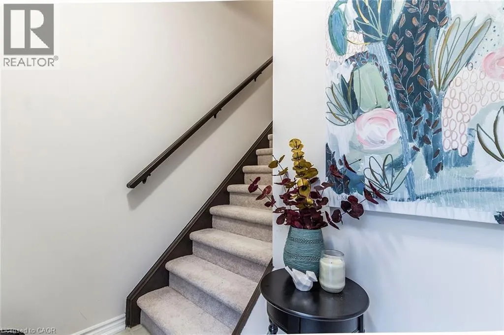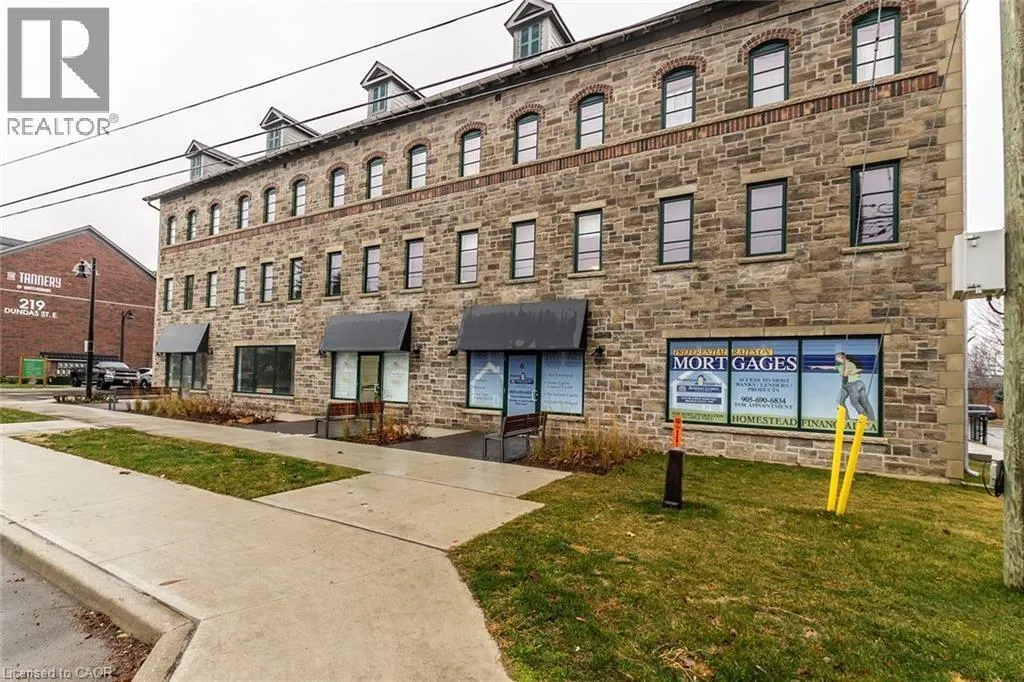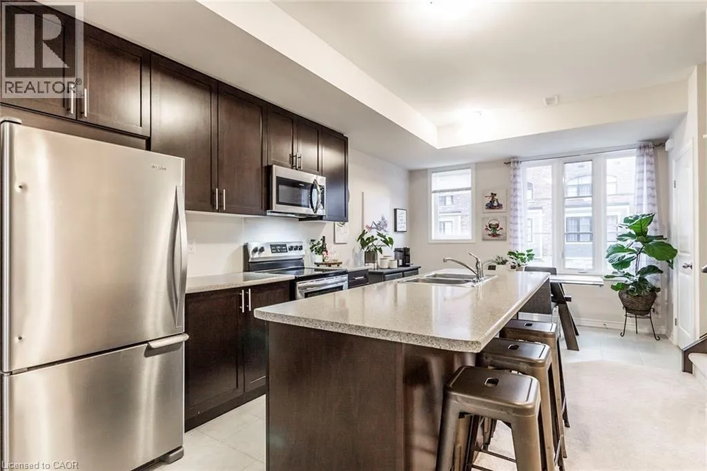 Hamilton St. N to Dundas St E Nestled in the vibrant heart of Waterdown, this modern 3-level townhome offers an urban oasis with exclusive CTOR rooftop terrace. Perfectly positioned for convenience, The Tannery is steps from local dining, shops, parks, and the library, ideal for those desiring upscale amenities with a charming small-town ambiance. Easy access to 407/403/QEW & Aldershot GO Station. The open-concept main floor is designed for seamless entertaining, featuring a spacious layout and an eat-in kitchen equipped w SS appliances & expansive island/breakfast bar. Retreat to the upper floors where two sizable bedrooms await, each with W/I closets. The master boasts a Juliet balcony with sliding doors & ensuite bath. A convenient in-suite laundry & 2nd full bathroom add to the thoughtful layout. The pinnacle of this unique property is the private rooftop terrace. Enjoy serene evenings under a partially covered area. Including 1 parking space. The perfect package for stylish, convenient living. (id:27476)