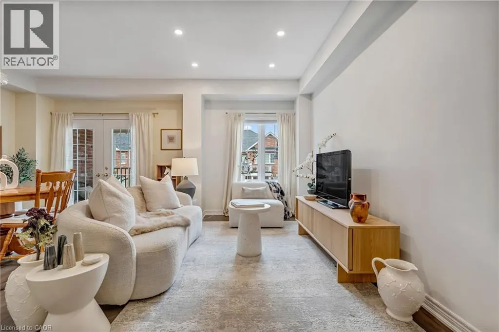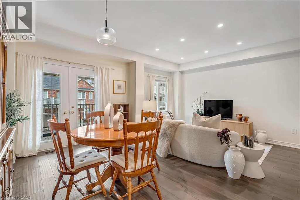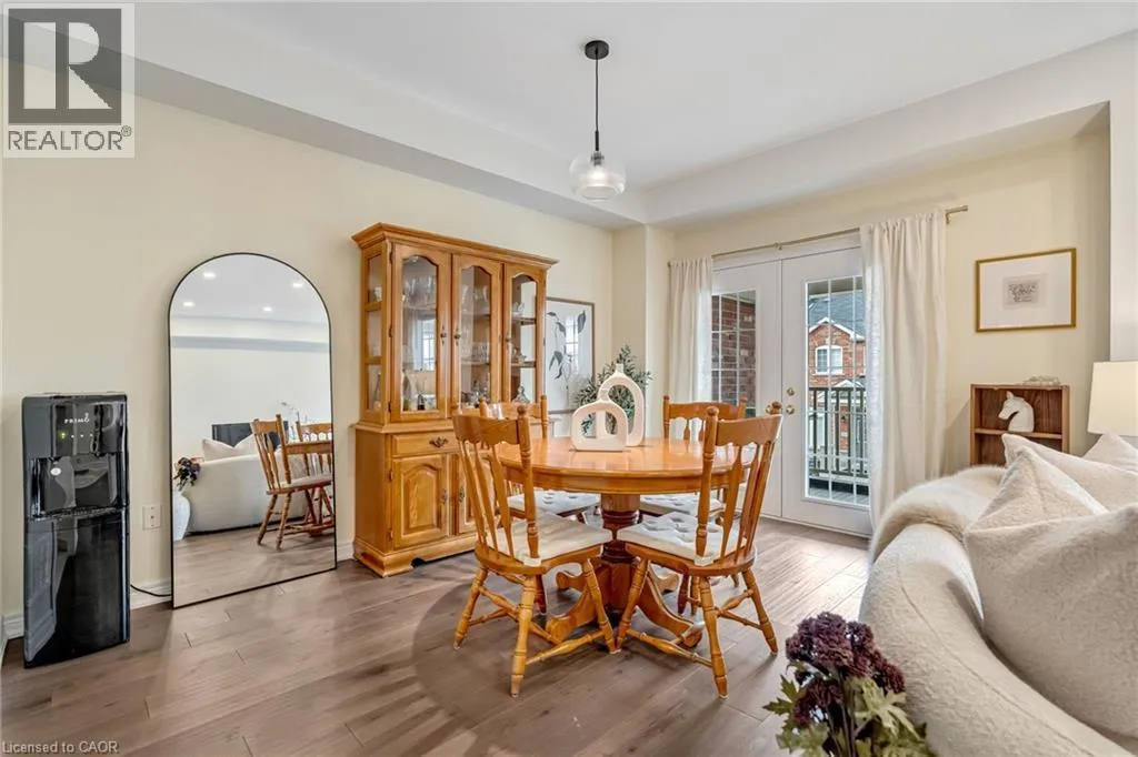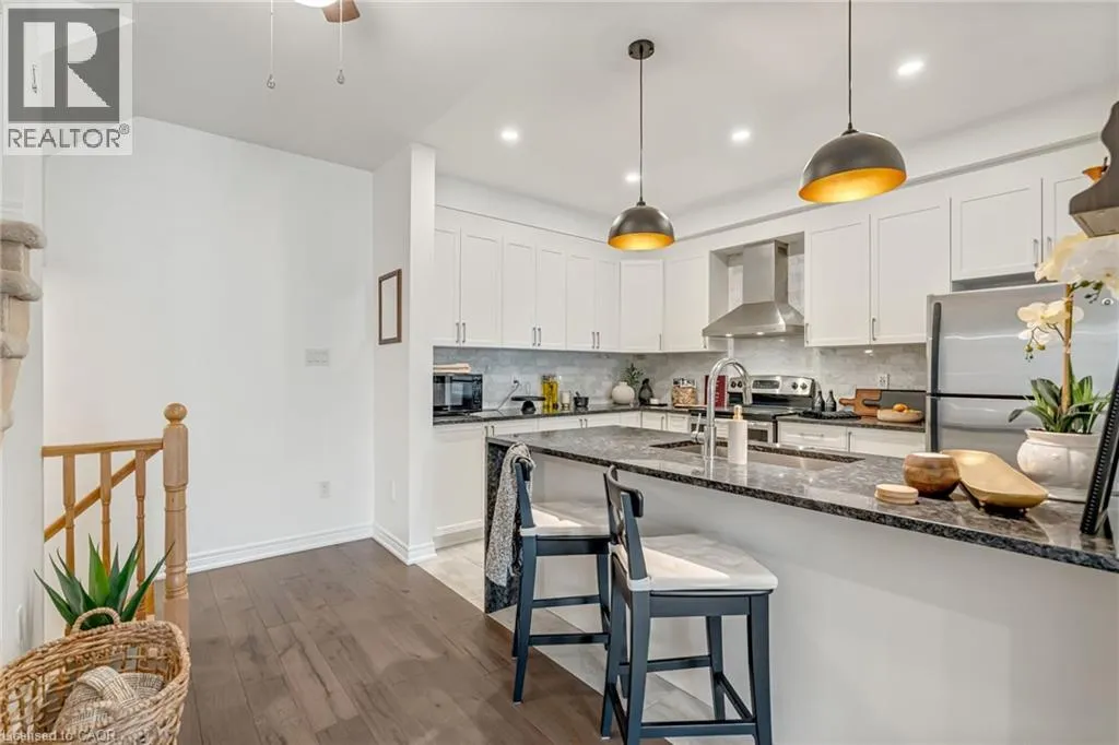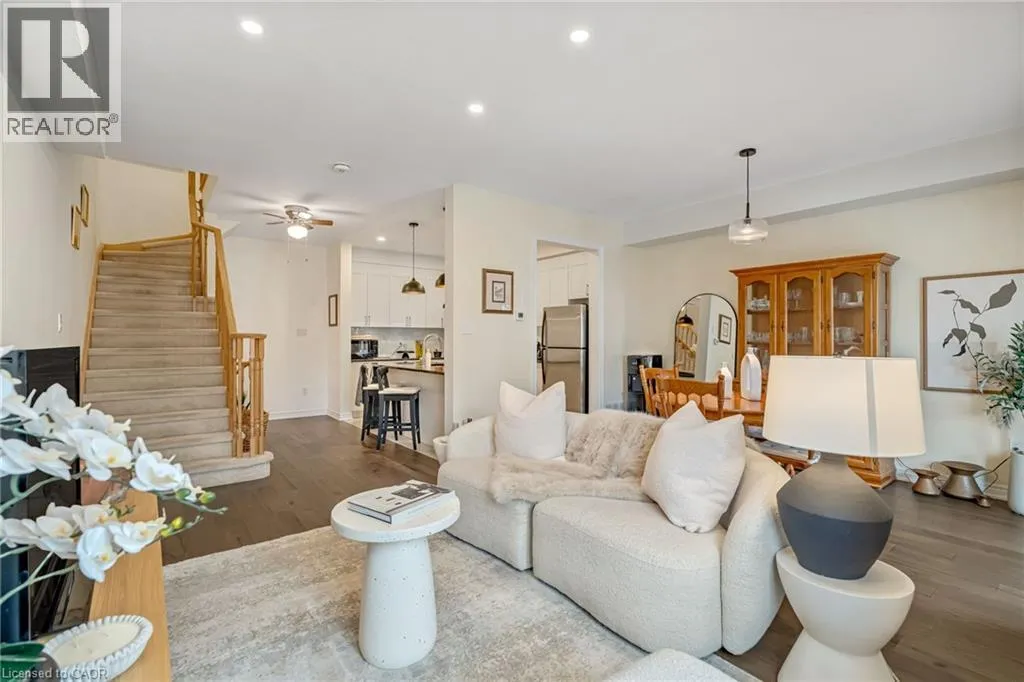 North of Parkside Dr. Turn left from Hamilton ST N onto Nisbet Blvd. Turn right into complex. Welcome to this bright and spacious 3-storey, 2-bedroom, 1.5-bathroom townhome tucked away on a quiet, family-friendly cul-de-sac in the heart of Waterdown. Known for its welcoming atmosphere and friendly neighbours, this beautifully-maintained home offers the perfect blend of comfort, convenience and community. The ground level features a welcoming foyer with a convenient 2-piece bathroom, inside entry from the garage, and ample closet space. The main floor offers a bright, open-concept living and dining area with wide plank hardwood floors and walkout access to a private balconyâperfect for morning coffee or evening relaxation. The modern white kitchen is designed for both style and function, featuring shaker-style cabinetry, stainless steel appliances, double sink, marble countertops, and a large four-seater island. Upstairs, youâll find two spacious bedrooms including a primary suite with walk-in closet and ensuite privilege to the beautifully finished main bathroom with mosaic tile flooring, glass-enclosed tub, and oversized vanity. Bedroom-level stackable laundry adds everyday convenience. Enjoy the quiet court and friendly neighbourhood while being just a short walk to local shops, restaurants, parks, and schools, and only minutes from the countryside and nearby Carlisle. Commuters will appreciate quick access to major routes including Highway 403 and 407, and Aldershot GO Station. Move-in ready and perfectly located on a quiet, family-friendly court, this home offers easy living just steps from parks, schools and the local amenities! (id:27476)