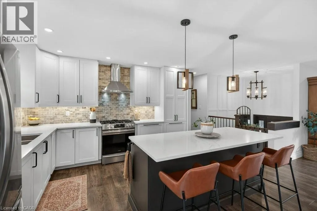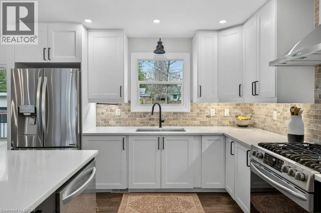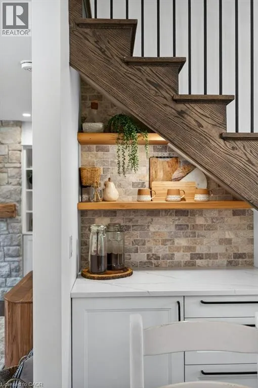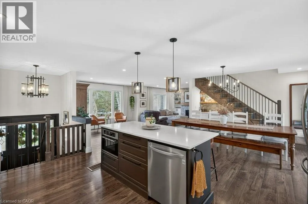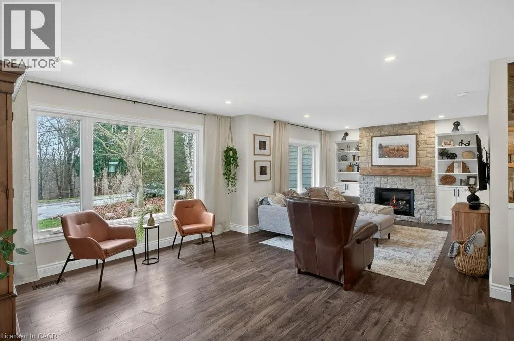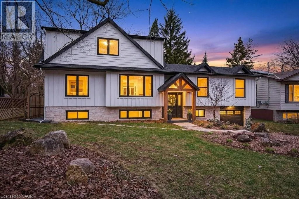 Dundas St. E. to Mill St. N. to Albert St. to north on Victoria St. to Nelson Absolutely stunning 4 bedroom plus den, 3.5 bathroom renovated home on a quiet dead end street in Waterdown's beautiful core! This is the home you have dreamed of! The gorgeous exterior finishes makes this home an absolute stand out! A large addition was completed in 2023 almost doubling the square footage of this home. The family and entertaining friendly open layout on the main floor features a beautiful kitchen with large island, quartz counters and stainless appliances. A large dining area with sliders to the rear yard and great room with gorgeous gas fireplace flanked by built-ins provide seamless flow for keeping an eye on the kids or staying engaged with guests while preparing a meal. A built-in coffee servery is another part of the incredible detail and thought put into this home! A main floor laundry and powder room area provides access to the rear yard. In the other end of the main floor you will find 3 bedrooms and a 4 piece bathroom. A hardwood staircase takes you to the absolutely incredible primary retreat! This one will take your breath away featuring vaulted and timber beam ceiling, french doors to a juliette balcony, an expansive walk-in closet with built-ins and a gorgeous ensuite with stand alone soaker tub, glass enclosed shower and a double custom vanity! The lower level is completely finished with a large family room, play area, workout space, large storage area, den and mudroom with built-ins with access to the attached garage. The spacious backyard has a large upper deck and a gorgeous stone patio with firepit. BONUS is a custom 10 x 12 outbuilding matching the home in finishes. It is insulated and has heating and cooling - ideal for a home office, he/she shed or workshop! This location can't be beat for those looking for a quiet spot to call home, yet conveniently located in the hub of it all, walking distance to schools, shops, restaurants, trails and Memorial Park. Homes like this rarely come along! (id:27476)