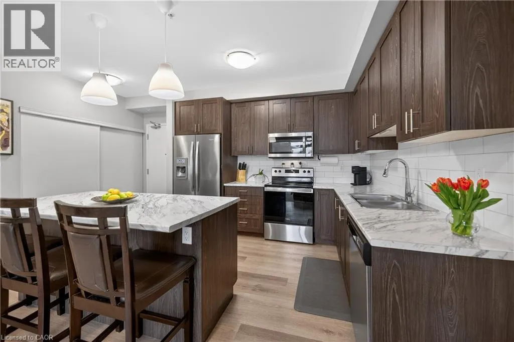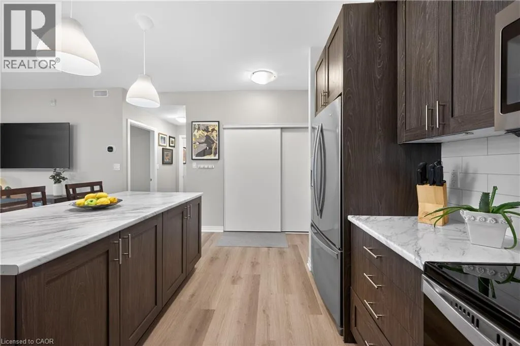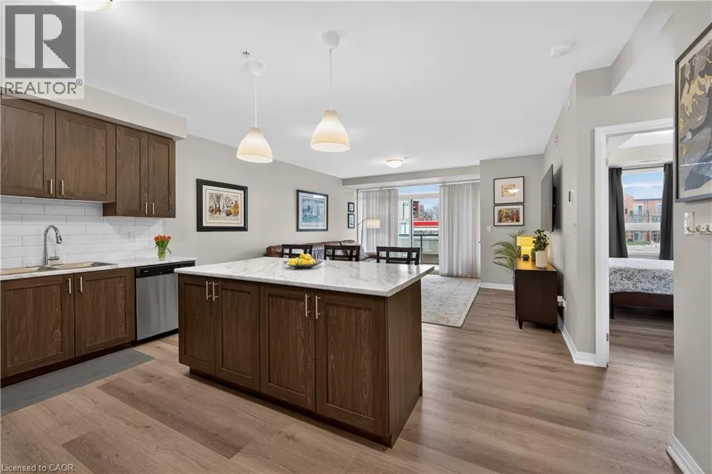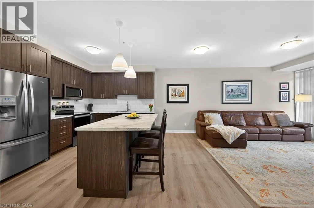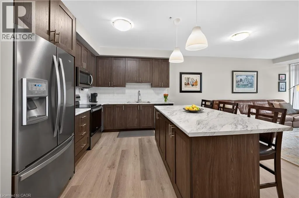 This residence offers an open-concept floorplan, providing a modern and seamless flow throughout the living space. With a total area of 1025 square feet, this space is designed for comfortable living and entertaining. The kitchen is equipped with stainless steel appliances, including a refrigerator, stove, and dishwasher. There is ample cabinetry for storage, while the kitchen island with breakfast bar adds both functionality and style. Under-cabinet lighting further enhances the workspace, making meal preparation convenient and enjoyable. Enjoy abundant natural light thanks to the floor-to-ceiling, wall-to-wall windows. A patio door leads directly to a private balcony, perfect for relaxing outdoors. Upgraded vinyl flooring is installed throughout the home, offering durability and ease of maintenance. There is no carpet, making cleaning straightforward. The primary bedroom includes a walk-in closet and a private ensuite. The ensuite is equipped with an oversized glass shower and a vanity with two sinks, combining luxury with practicality. This property is ideally situated close to shopping, restaurants, and all local amenities. Public transit is also easily accessible, making commuting simple and convenient. Underground parking and a storage locker, providing secure and accessible options for your vehicle and belongings. (id:27476)