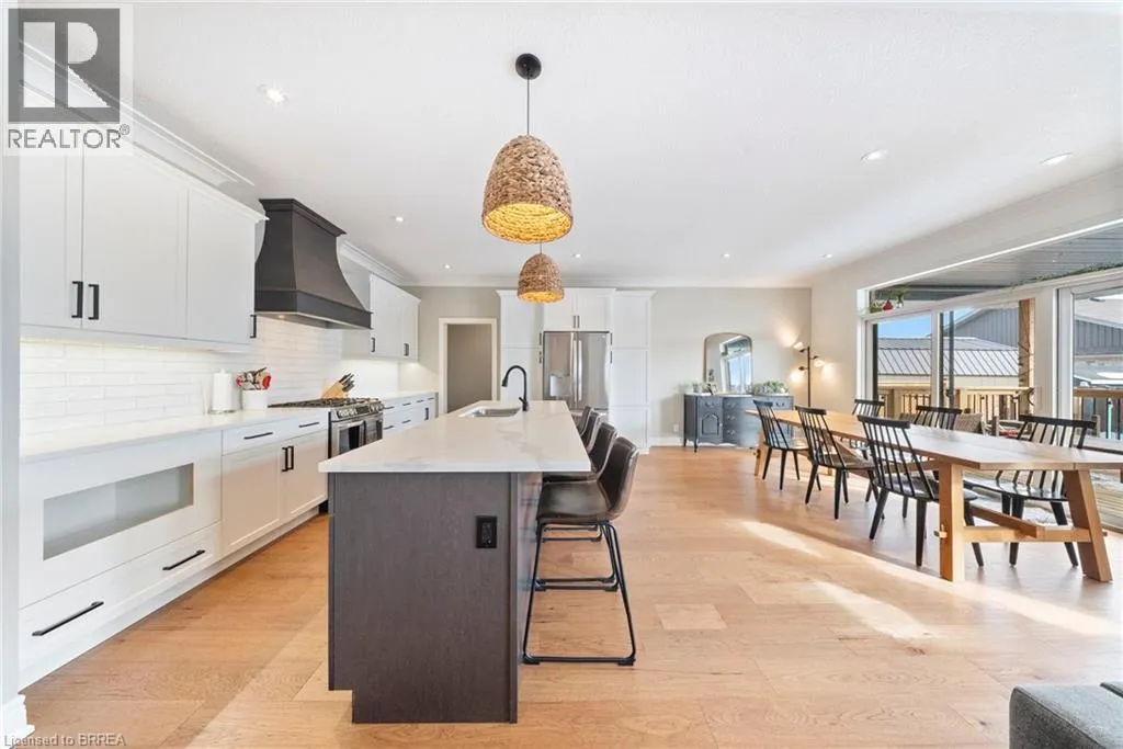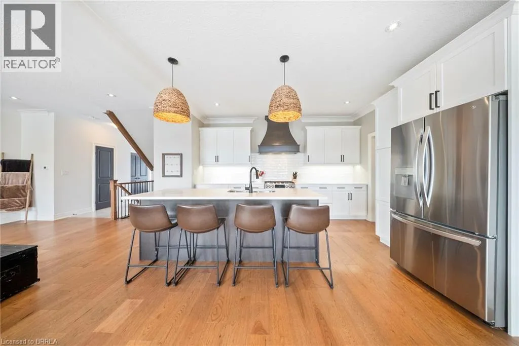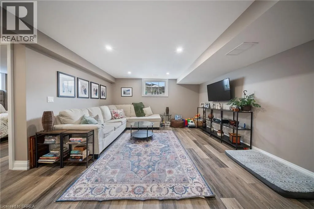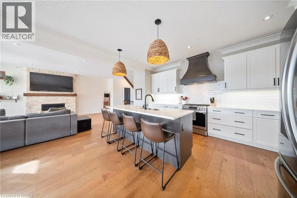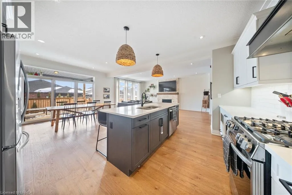 Welcome to this exquisite 2-storey home nestled in the charming town of Waterfordâwhere timeless elegance meets modern luxury. Meticulously crafted and beautifully maintained, this stunning residence seamlessly blends contemporary design with refined comfort. The thoughtfully designed open-concept main floor provides effortless flow between the kitchen, dining area, and living roomâan ideal layout for both everyday living and unforgettable entertaining. At the heart of the home is the chef-inspired kitchen, a true showstopper designed to impress. Featuring a spacious centre island with seating, sleek quartz countertops, a classic subway tile backsplash, premium stainless steel appliances, under-mount lighting, and refined crown moldings, this kitchen combines beauty and functionality in every detail. Whether preparing family meals or hosting guests, this space is sure to inspire. The living room exudes warmth and style with its striking stone-surround gas fireplaceâperfect for cozy eveningsâwhile the dining area offers sliding glass doors that lead to a covered deck, extending your living space outdoors for effortless indoor-outdoor entertaining. The fully finished lower level adds exceptional versatility, offering a spacious recreation room, convenient kitchenette, additional bedroom, and 2-peice bathroomâmaking it perfectly suited for an in-law suite or multi-generational living arrangement. Step outside to a fully fenced backyard designed for both relaxation and recreation. With ample space for entertaining, gardening, or letting children and pets play freely, this private outdoor retreat truly enhances the homeâs appeal. The property also features an updated aggregate driveway, eye-catching glow-in-the-dark safety stones on the steps for added nighttime visibility, and a concrete and turf enclosed dog runâthoughtfully designed with both style and practicality in mind. Luxury living in a welcoming communityâdonât miss this rare opportunity! (id:27476)