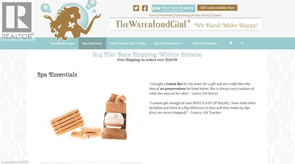Main Street South, Waterford to #35 SALE OF BUSINESS ONLY â WITHOUT PROPERTY: The Waterford Girl is a Waterford, Ontario-based artisan brand specializing in high-quality soap and body care using fresh, natural ingredients, with signature formulas and small-batch production. Its professional branding, premium packaging, and thriving storefront, online store, and wholesale program support strong local loyalty and organic growth through curated customer experiences, expertly wrapped gifts, and unique events. With proprietary formulas, multiple revenue streams, and ready-to-expand opportunities in franchising, wholesale, and new product categories, the brand is poised for its next growth phase. Visionary buyers are invited to shape the next chapters of this innovative, consumer-focused enterprise. (id:27476)