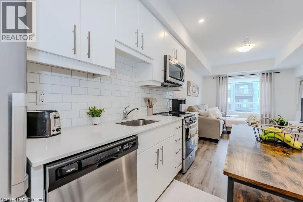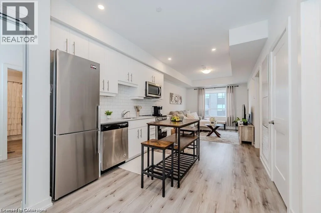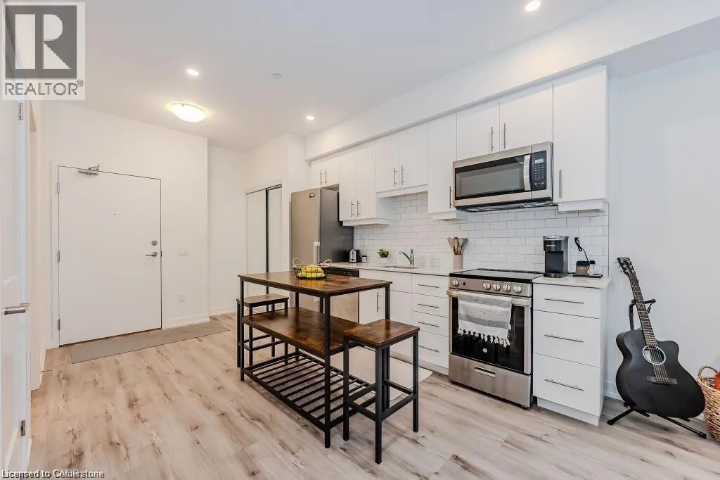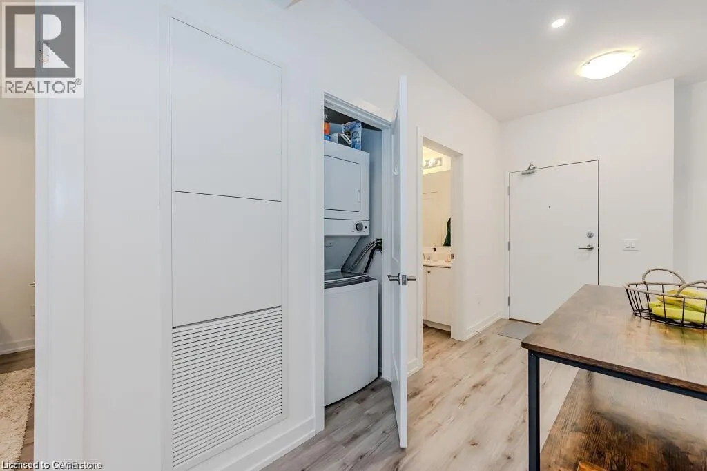 Bridge/Northfield Discover this chic one-bedroom unit in the modern Blackstone complex, featuring a bright, open layout with 9-foot ceilings, upgraded vinyl flooring, a spacious walk-in closet, and a private balcony. The sleek kitchen boasts quartz countertops, stainless steel appliances, and a built-in microwave. Enjoy the convenience of an in-suite stacked washer/dryer. Residents have access to premium amenities, including a state-of-the-art gym, vibrant party lounge, bike storage, and an outdoor terrace with BBQs and a gas fire pit. Includes underground parking and storage for tires or decorations. Perfectly located near St. Jacobs Farmers Market, Conestoga Mall, expressway access, LRT stations, RIM Park, and scenic walking/biking trails. Ideal for modern living in a prime Kitchener location. (id:27476)
