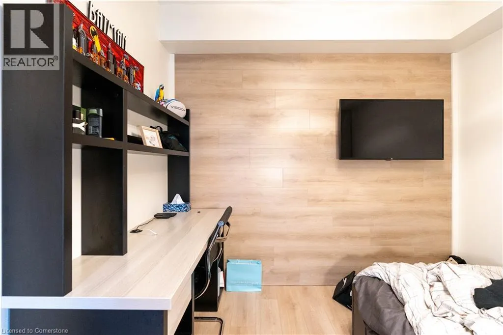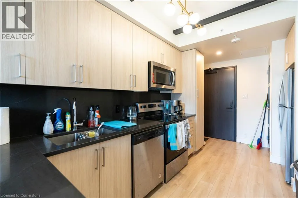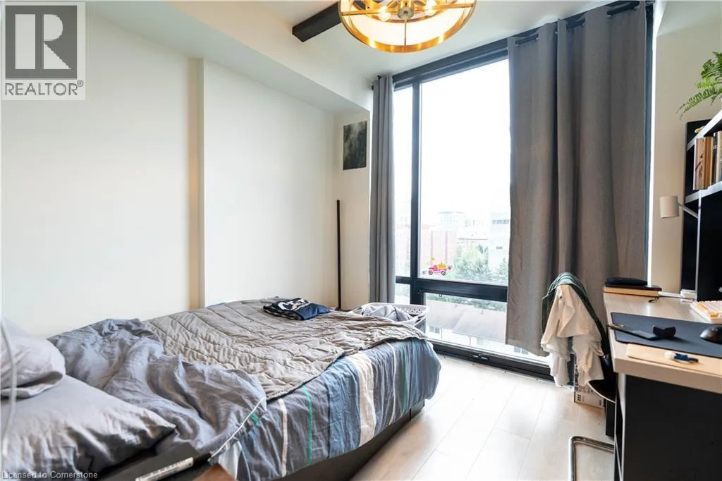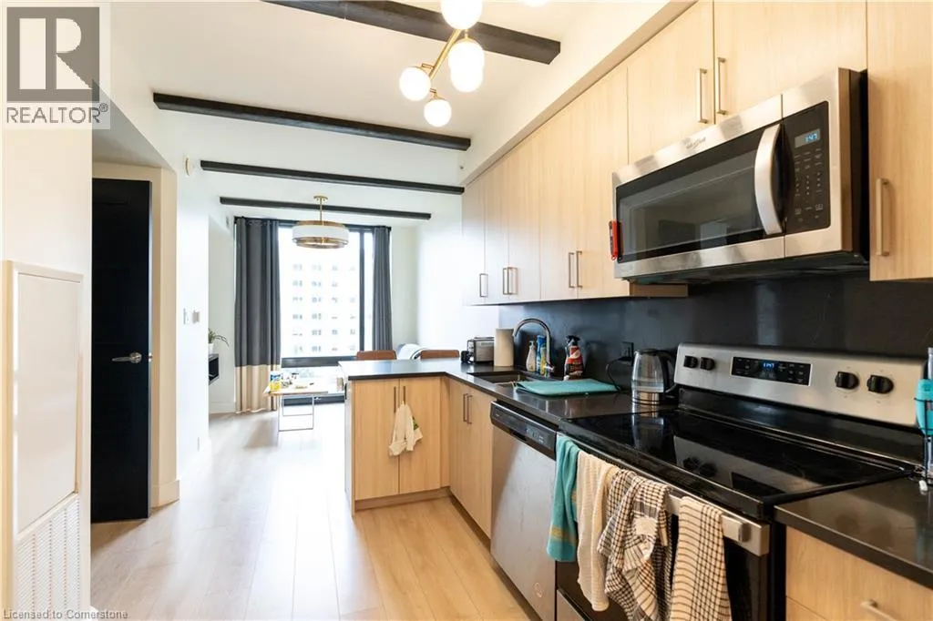 University Ave E to Weber St N to Columbia St W, Columbia St W to Philip St. Parking off Philip St. Welcome to Society 145, where contemporary urban living meets convenience and style. This condo unit is one of the rarest available in this complex with exclusive parking included! alleviating the challenges of city parking and ensuring your vehicle is always secure and accessible. This beautifully designed 1 bedroom with den condo offers the perfect blend of modern amenities and sophisticated comfort, making it an ideal for first time owners and investors. As you step into the condo, you are greeted by an open-concept living space that basks in natural light, thanks to the expansive floor-to-ceiling windows. These windows not only offer breathtaking views of the surrounding cityscape but also create a bright and airy atmosphere throughout the home. The kitchen seamlessly offers built-in dining space with its L-shaped quartz counter tops and sleek, modern stainless steel appliances, and ample cabinetry, catering to both the home chef and entertainer. The primary bedroom features large windows offering lots of natural lighting and adjoining 3pcs. bathroom for convenience. The den offers versatility as a guest room, home office or study room. Residents at Society 145 also enjoy a range of exclusive amenities designed to enhance their lifestyle. These include an exercise room, games and mediaroom perfect for social gatherings. The building is equipped with secure access and 24-hour concierge services, confirming a worry-free andcomfortable living experience. Located in a vibrant neighbourhood, Society 145 is within walking distance to eclectic dining spots, trendy coffeeshops, shopping destinations, and cultural attractions. It combines the best of city living with the peace of mind of a well-designed, functional home. (id:27476)
