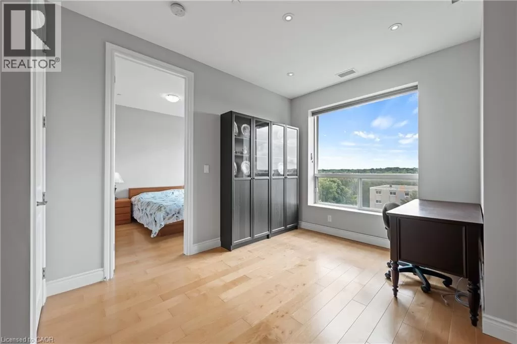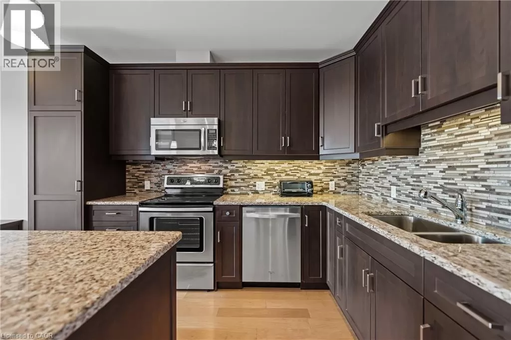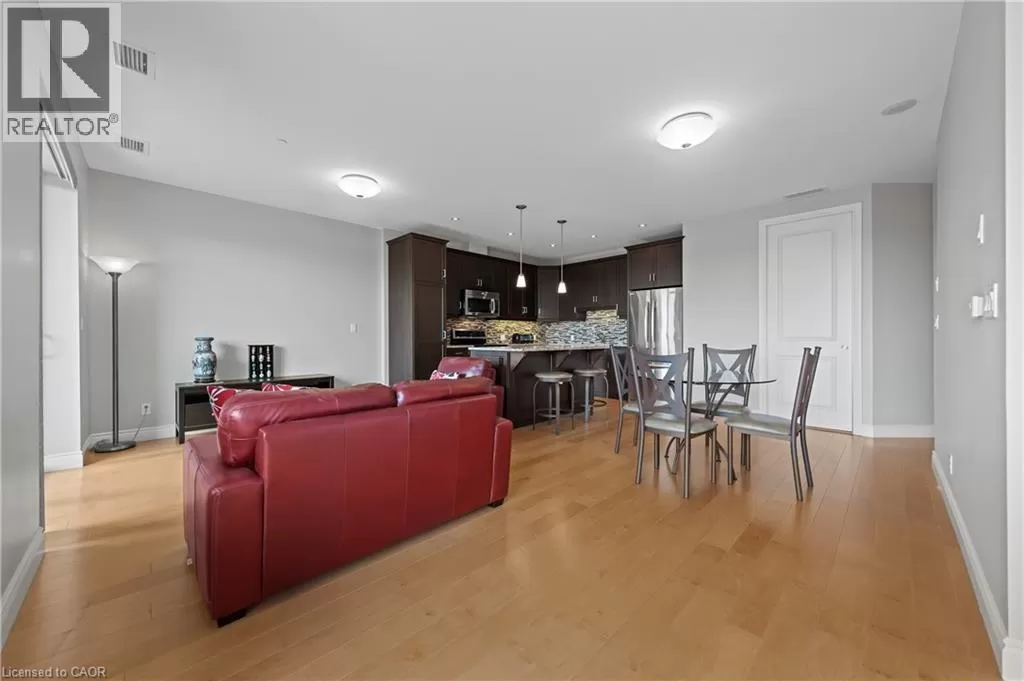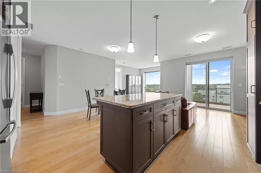 WESTMOUNT ROAD S TO ERB STREET W Experience upscale condo living at the Westmount Grand, one of Waterlooâs most prestigious addresses! This impressive west-facing 1-bedroom + den, 2-bathroom suite combines luxury, comfort, and convenience in the heart of Uptown Waterloo. Inside, youâll find 9â ceilings, a spacious open-concept kitchen with island, granite counters, stainless steel appliances, under-cabinet lighting, and a stylish backsplash. The expansive living and dining areas are framed by large windows, filling the space with natural light and showcasing panoramic city views. A bonus flex space offers the perfect spot for a home office. Hardwood flooring flows seamlessly throughout the main living area, adding warmth and elegance. The oversized primary bedroom is a true retreat, featuring a large window, dual closets, and a 5-piece spa-inspired ensuite. Additional highlights include a second full bathroom, in-suite laundry, and a storage room. Step out to the spacious covered balcony to take in spectacular sunsets! This unit also includes one underground parking space and one locker. Residents of Westmount Grand enjoy an array of first-class amenities: a rooftop terrace, library, fitness centre, sauna, entertainment room, and secure underground parking. Perfectly located, youâll be steps from Uptown Waterlooâs restaurants, shops, and parks, and just minutes from the University of Waterloo and Wilfrid Laurier University. Luxury, lifestyle, and locationâthis condo has it all! (id:27476)