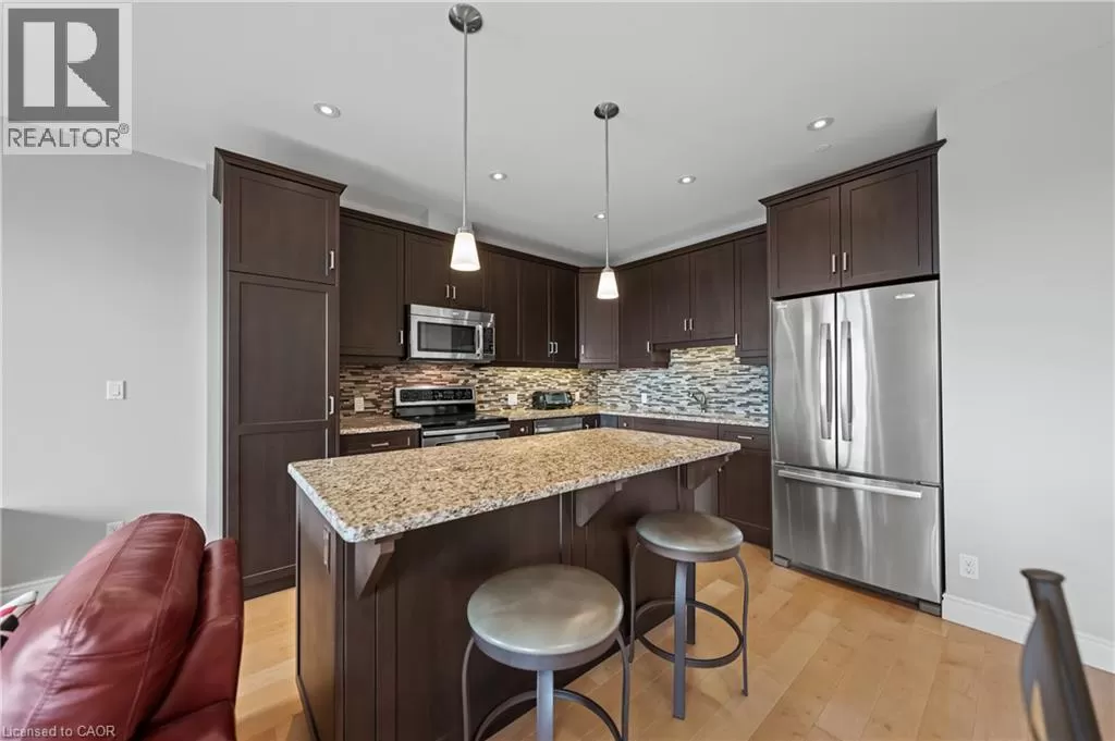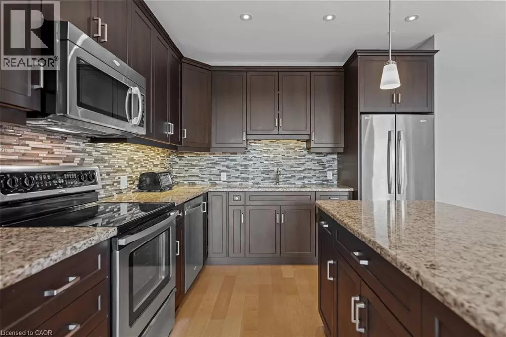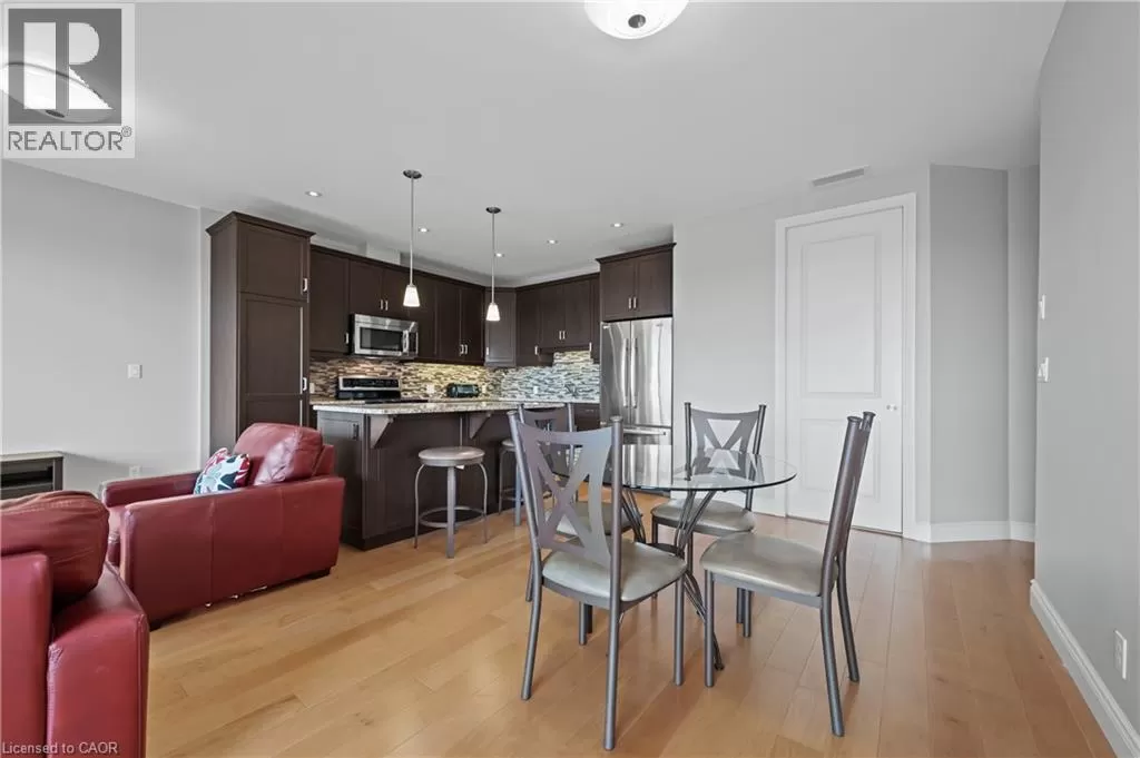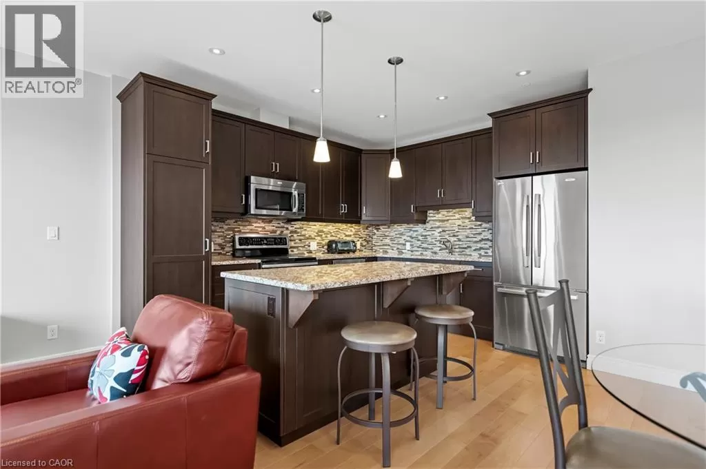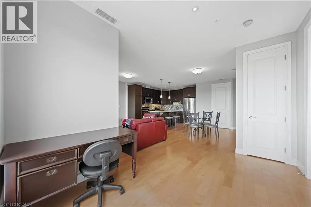 WESTMOUNT ROAD S TO ERB STREET W Experience upscale condo living at the Westmount Grand, one of Waterlooâs most prestigious addresses! This impressive west-facing 1-bedroom + den, 2-bathroom suite combines luxury, comfort, and convenience in the heart of Uptown Waterloo. Inside, youâll find 9â ceilings, a spacious open-concept kitchen with island, granite counters, stainless steel appliances, under-cabinet lighting, and a stylish backsplash. The expansive living and dining areas are framed by large windows, filling the space with natural light and showcasing panoramic city views. A bonus flex space offers the perfect spot for a home office. Hardwood flooring flows seamlessly throughout the main living area, adding warmth and elegance. The oversized primary bedroom is a true retreat, featuring a large window, dual closets, and a 5-piece spa-inspired ensuite. Additional highlights include a second full bathroom, in-suite laundry, and a storage room. Step out to the spacious covered balcony to take in spectacular sunsets! This unit also includes one underground parking space and one locker. Residents of Westmount Grand enjoy an array of first-class amenities: a rooftop terrace, library, fitness centre, sauna, entertainment room, and secure underground parking. Perfectly located, youâll be steps from Uptown Waterlooâs restaurants, shops, and parks, and just minutes from the University of Waterloo and Wilfrid Laurier University. Luxury, lifestyle, and locationâthis condo has it all! (id:27476)