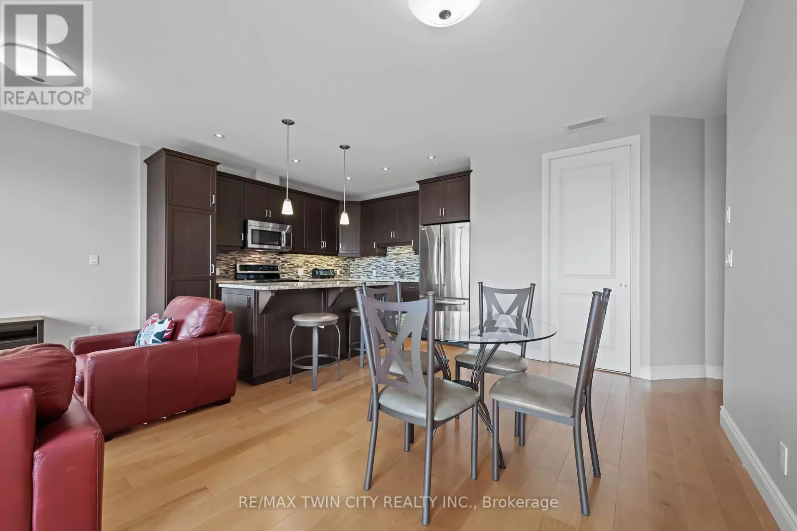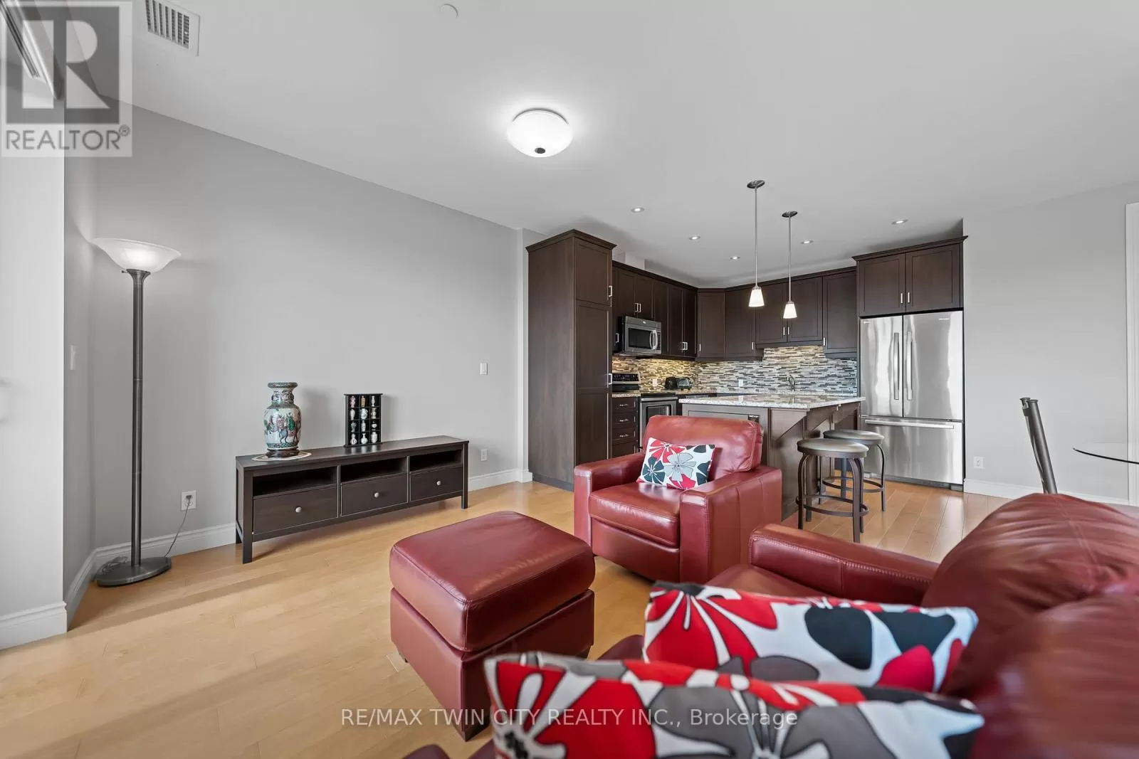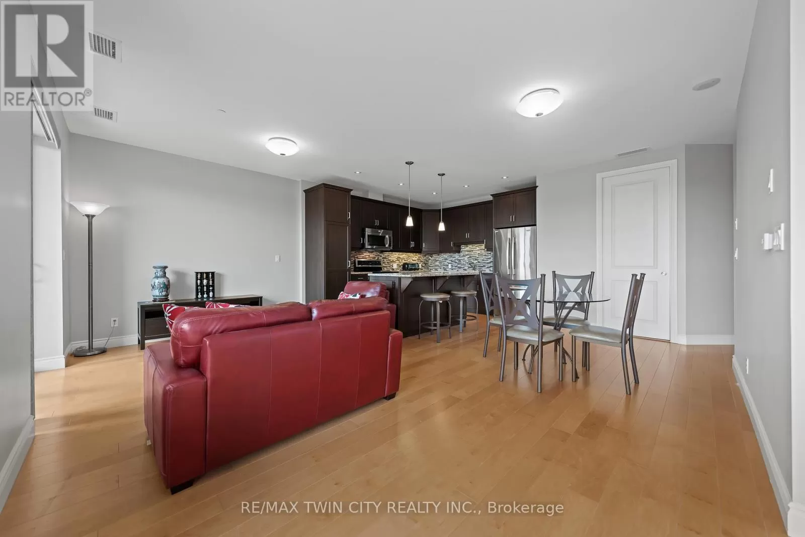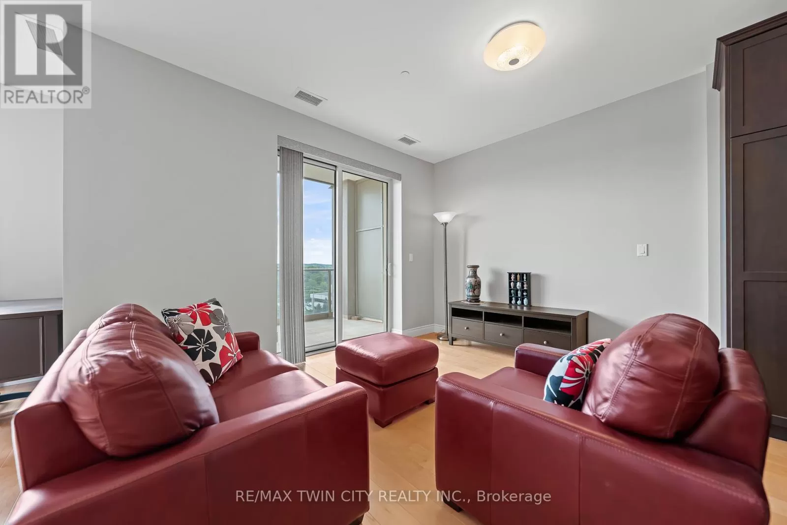 Cross Streets: WESTMOUNT ROAD S. ** Directions: WESTMOUNT ROAD S TO ERB STREET W. Experience upscale condo living at the Westmount Grand, one of Waterloos most prestigious addresses! This impressive west-facing 1-bedroom + den, 2-bathroom suite combines luxury, comfort, and convenience in the heart of Uptown Waterloo. Inside, you'll find 9 ceilings, a spacious open-concept kitchen with island, granite counters, stainless steel appliances, under-cabinet lighting, and a stylish backsplash. The expansive living and dining areas are framed by large windows, filling the space with natural light and showcasing panoramic city views. A bonus flex space offers the perfect spot for a home office. Hardwood flooring flows seamlessly throughout the main living area, adding warmth and elegance. The oversized primary bedroom is a true retreat, featuring a large window, dual closets, and a 5-piece spa-inspired ensuite. Additional highlights include a second full bathroom, in-suite laundry, and a storage room. Step out to the spacious covered balcony to take in spectacular sunsets! This unit also includes one underground parking space and one locker. Residents of Westmount Grand enjoy an array of first-class amenities: a rooftop terrace, library, fitness centre, sauna, entertainment room, and secure underground parking. Perfectly located, you'll be steps from Uptown Waterloos restaurants, shops, and parks, and just minutes from the University of Waterloo and Wilfrid Laurier University. Luxury, lifestyle, and location, this condo has it all! (id:27476)