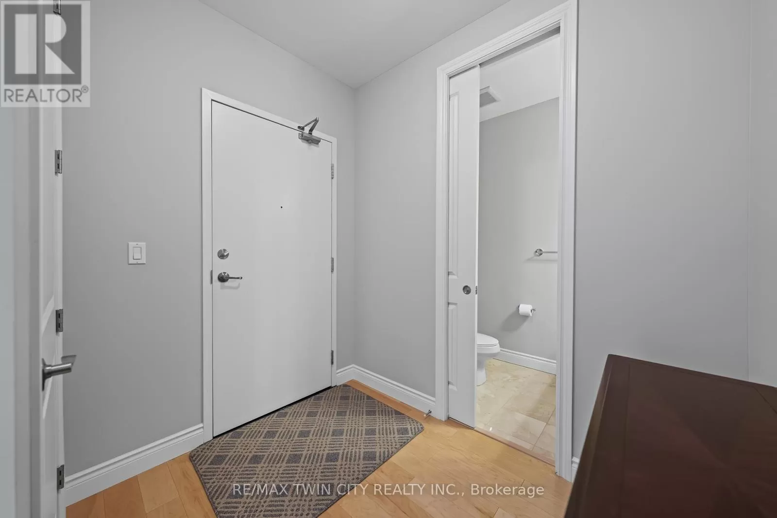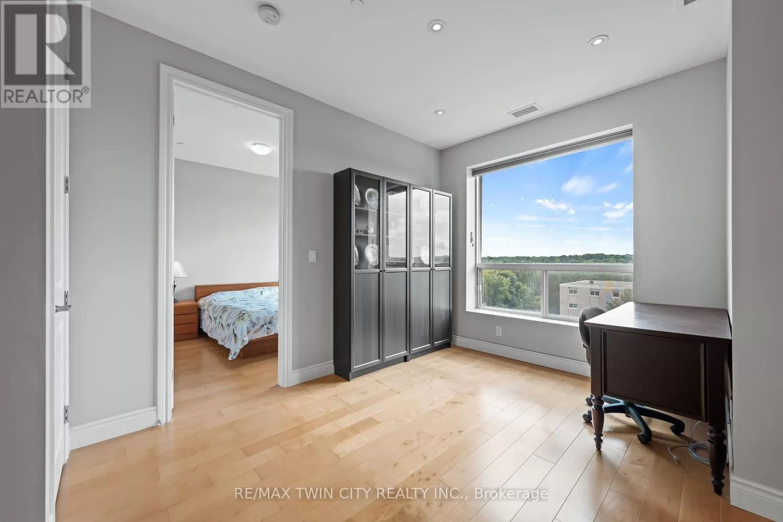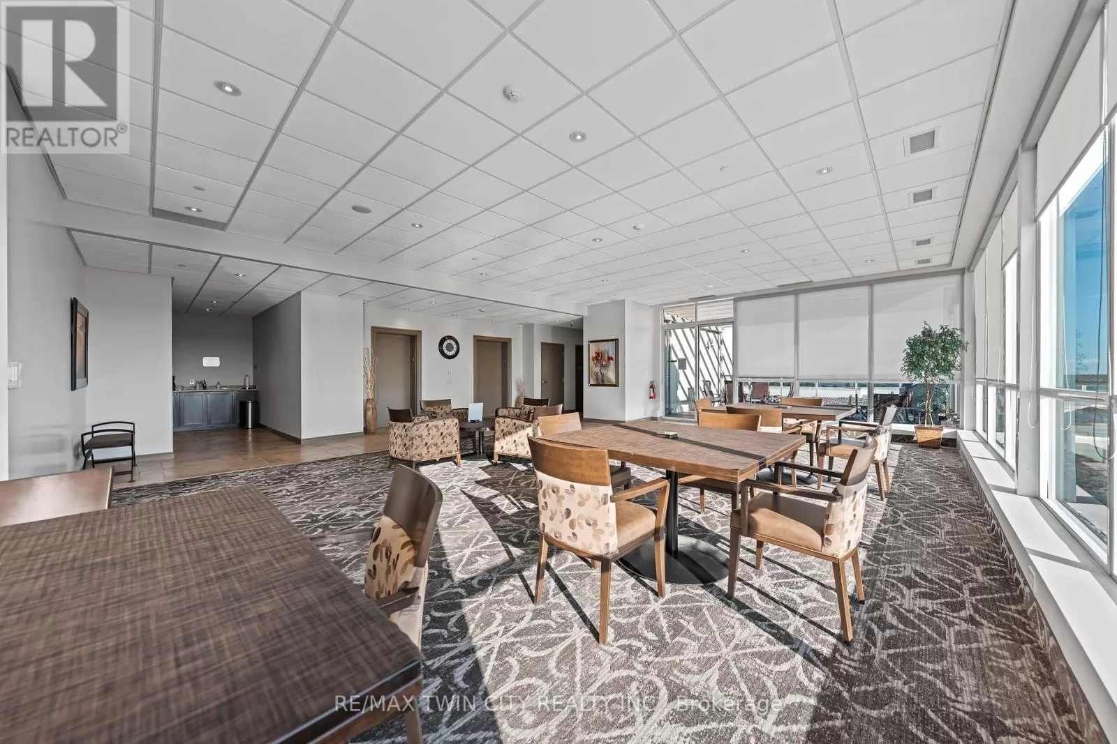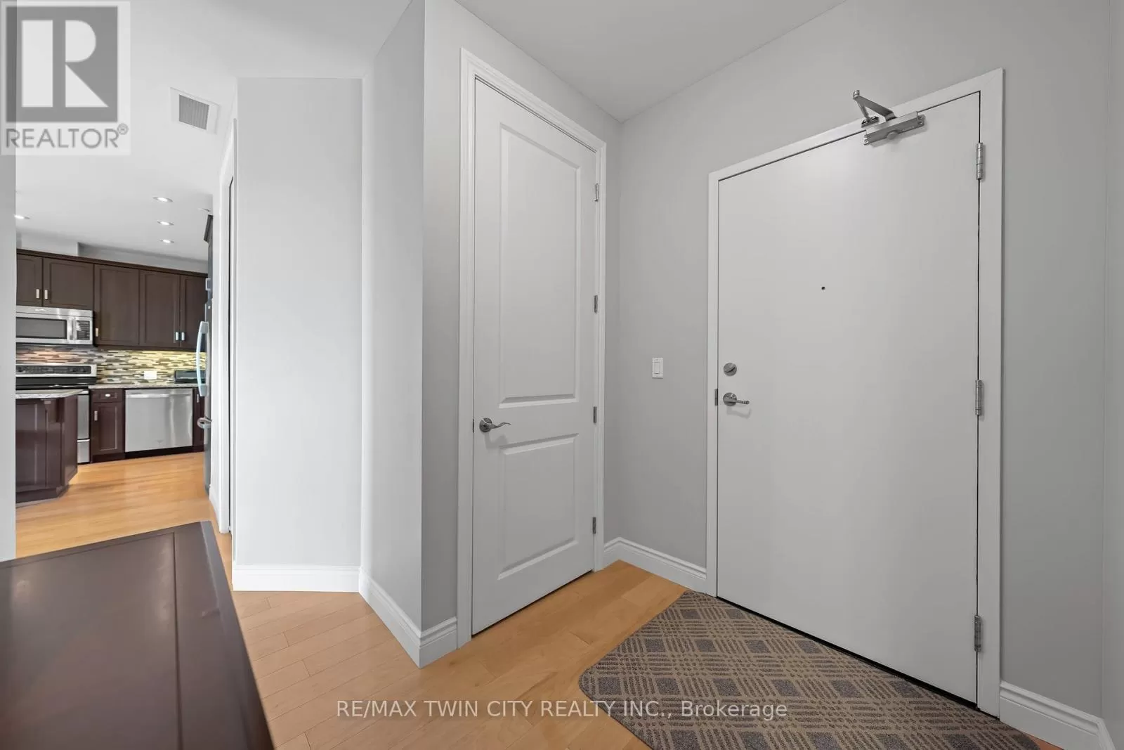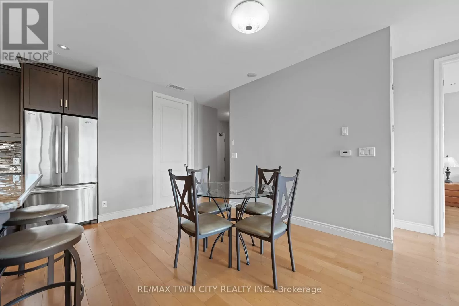 Cross Streets: WESTMOUNT ROAD S. ** Directions: WESTMOUNT ROAD S TO ERB STREET W. Experience upscale condo living at the Westmount Grand, one of Waterloos most prestigious addresses! This impressive west-facing 1-bedroom + den, 2-bathroom suite combines luxury, comfort, and convenience in the heart of Uptown Waterloo. Inside, you'll find 9 ceilings, a spacious open-concept kitchen with island, granite counters, stainless steel appliances, under-cabinet lighting, and a stylish backsplash. The expansive living and dining areas are framed by large windows, filling the space with natural light and showcasing panoramic city views. A bonus flex space offers the perfect spot for a home office. Hardwood flooring flows seamlessly throughout the main living area, adding warmth and elegance. The oversized primary bedroom is a true retreat, featuring a large window, dual closets, and a 5-piece spa-inspired ensuite. Additional highlights include a second full bathroom, in-suite laundry, and a storage room. Step out to the spacious covered balcony to take in spectacular sunsets! This unit also includes one underground parking space and one locker. Residents of Westmount Grand enjoy an array of first-class amenities: a rooftop terrace, library, fitness centre, sauna, entertainment room, and secure underground parking. Perfectly located, you'll be steps from Uptown Waterloos restaurants, shops, and parks, and just minutes from the University of Waterloo and Wilfrid Laurier University. Luxury, lifestyle, and location, this condo has it all! (id:27476)